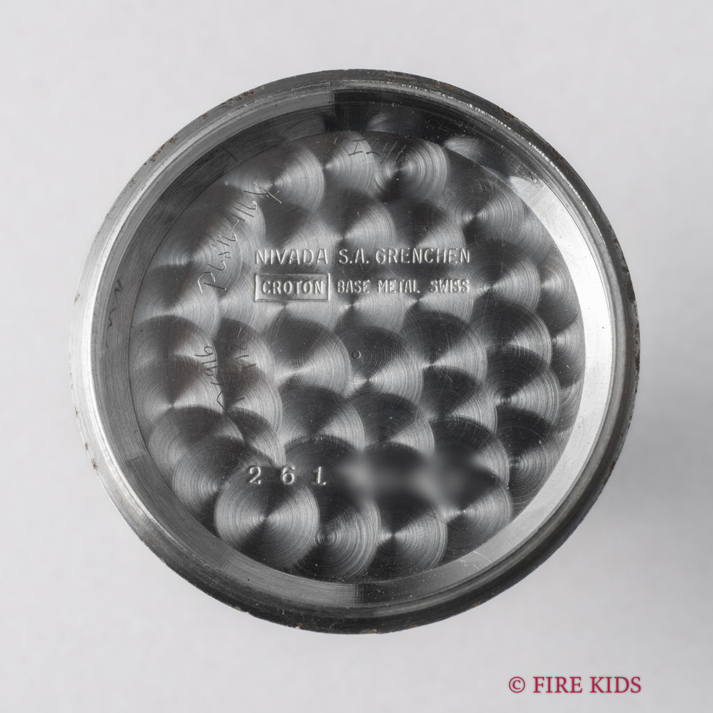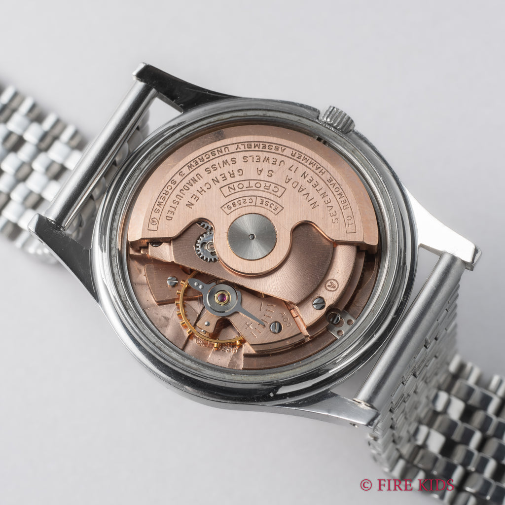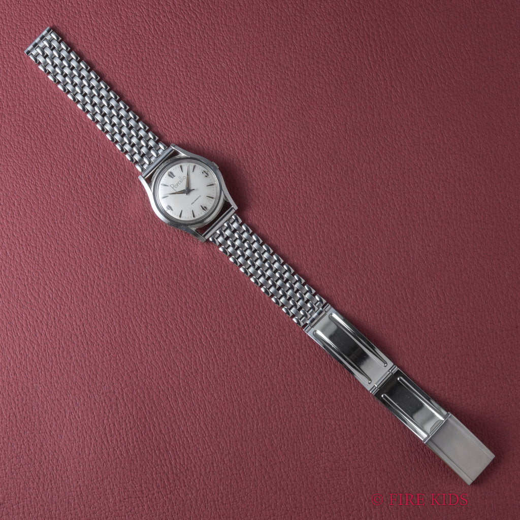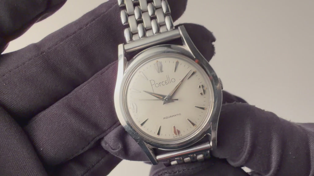 1950年代にアメリカのジュエラー「PORCELLO」がクロトンニバダに製作依頼したアクアマチックです。大きなロゴと、デコラティブなインデックスがインパクトあります。ベゼルを持たず、ミドルケースから流線形に延びるラグは1950年代の時計に多く見られることから当時の流行デザインを感じることができます。全体的に使用感は少なく、パウダーホワイトの文字盤が雰囲気があります。ムーブメントは耐震装置付きのETA1256を搭載。ベルトは雰囲気の合う社外のステンレスを取り付けてあります。
