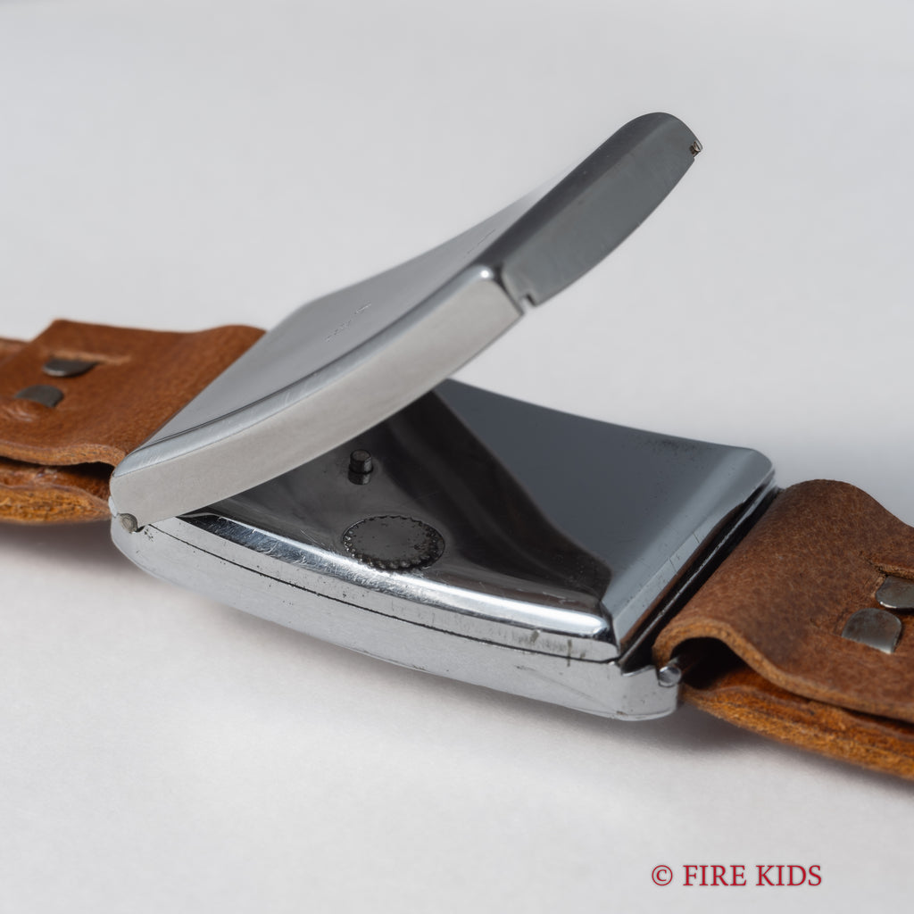 ワイラー ステープラー 変形自動巻き 1930年代製の入荷です。インカフレックスで有名なスイスメーカー ワイラー製の初期型変形自動巻き機構のついた時計です。裏蓋が稼働し、ケース側の裏面にあるプッシュボタンを押すことでゼンマイを巻き上げることができます。その形状からステープラーやホッチキスという愛称で親しまれた、ユニークで希少な自動巻き時計黎明期の一本です。リューズも裏面に収納されておりケースがシンメトリーになっているためすっきりとした印象があり、表面の淵は真ん中が盛り上がるように山形にカットされており細かなこだわりを感じさせます。手巻きや針回しの操作はスムースです。