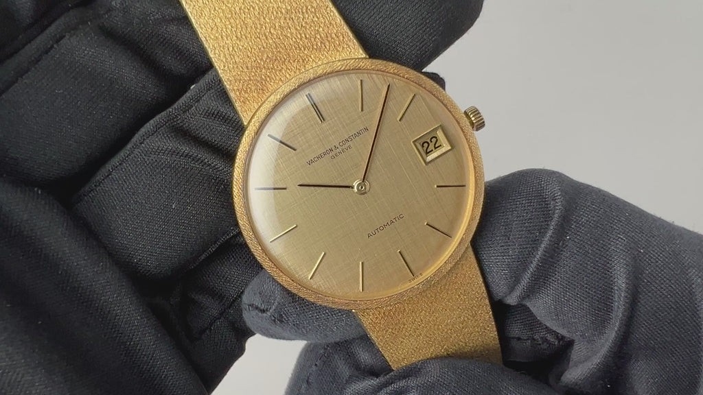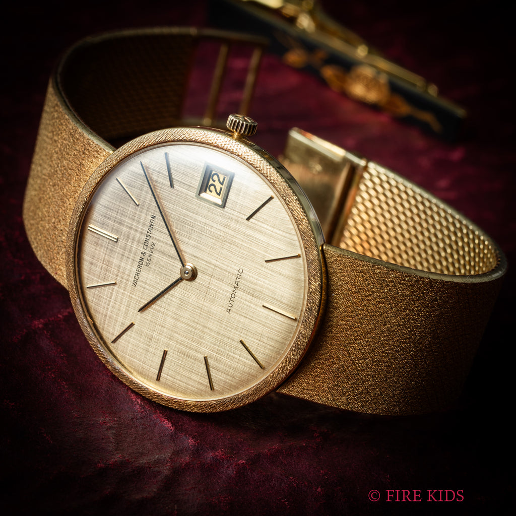 ヴァシュロン・コンスタンタン 18金無垢ブレス一体型エクストラフラット 1970年代製 自動巻 Cal.K1121の入荷になります。18金無垢ケースはブレスと一体型で表面にエングレーブが施された高級感のある仕上がりです。ジャガー・ルクルトのCal.920をベースにした薄型自動巻ムーブメントCal.K1121はヴァシュロンコンスタンタンの222にも搭載された名作ムーブメントになります。文字盤はシミ等無く綺麗です。ケースは小傷が見られますが大きなダメージはありません。ベルトも使用感が少なく金灼けしています。純正のケースが付属します。
