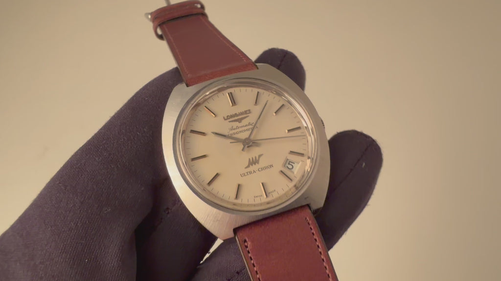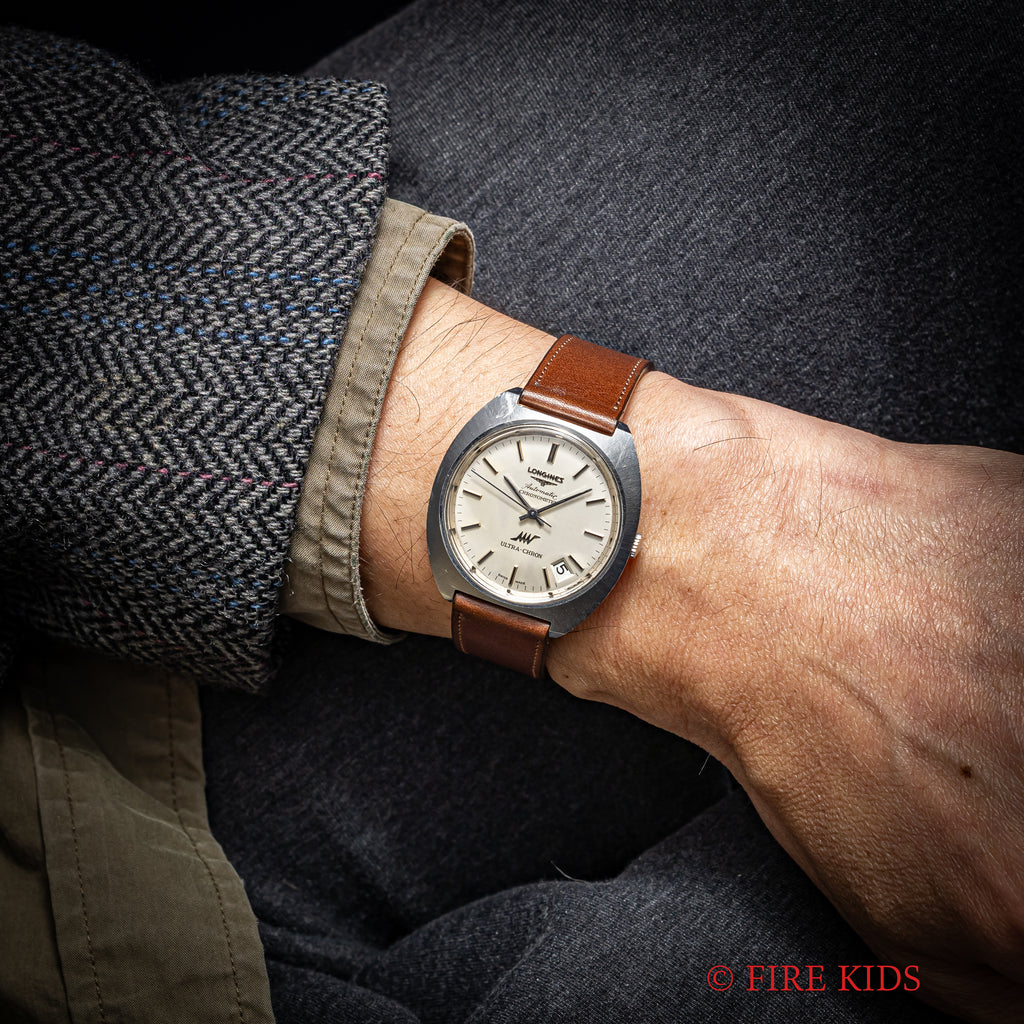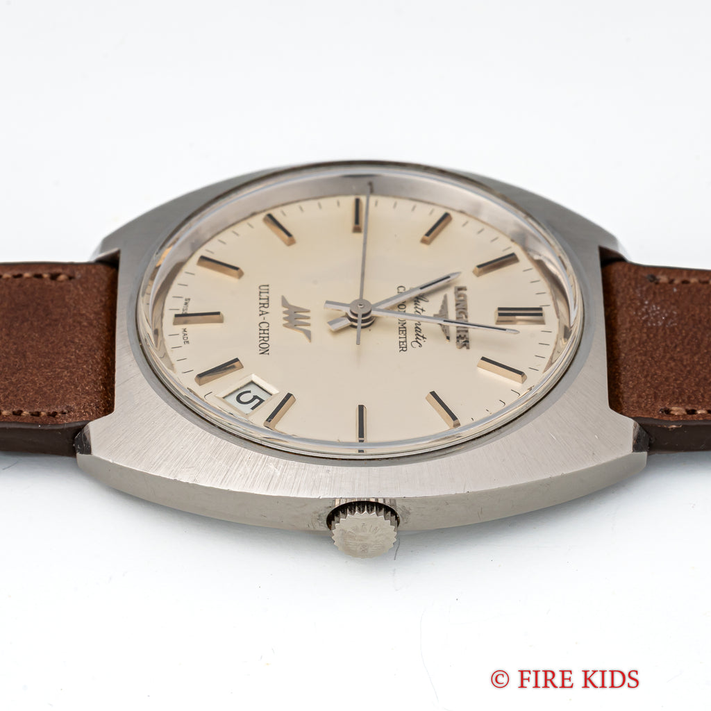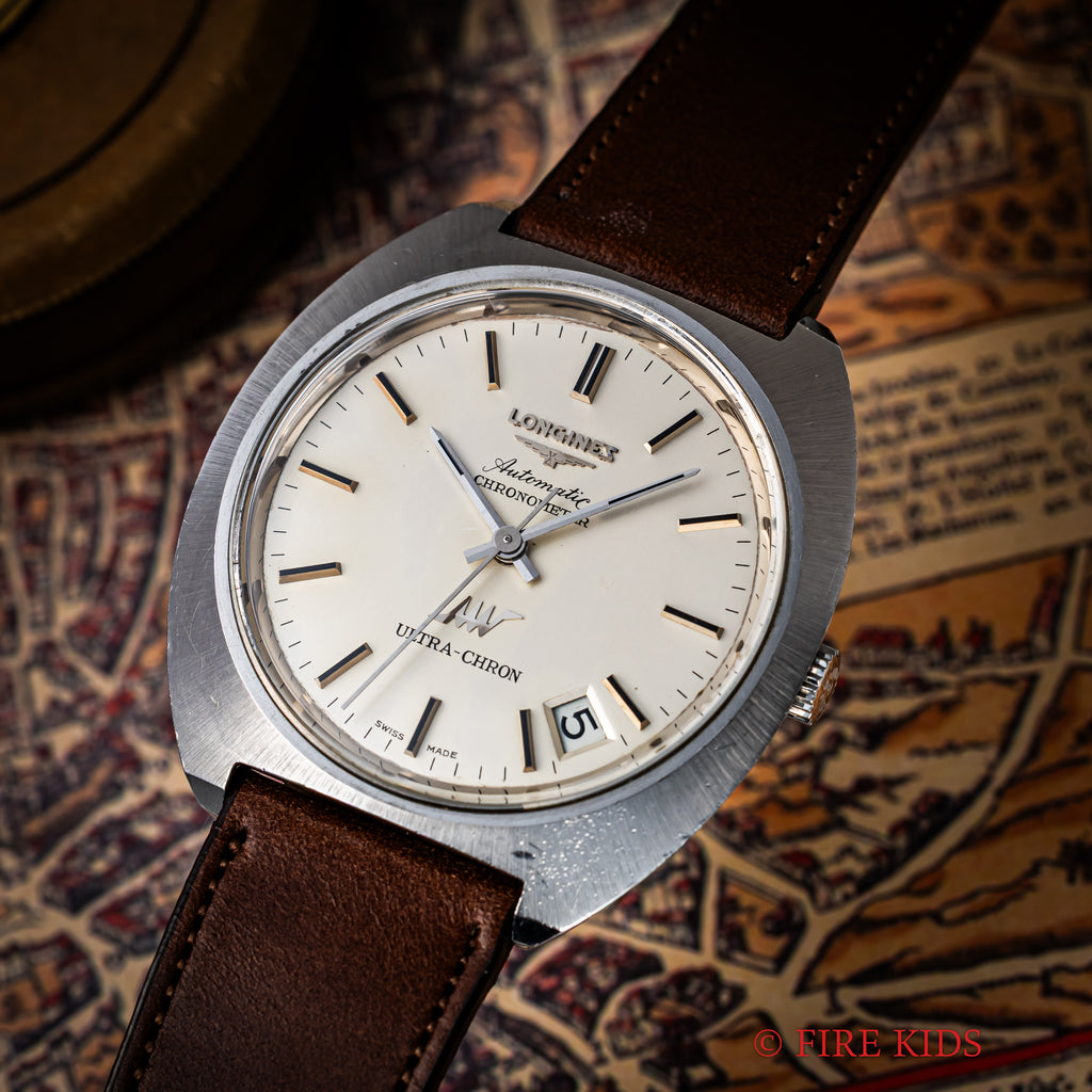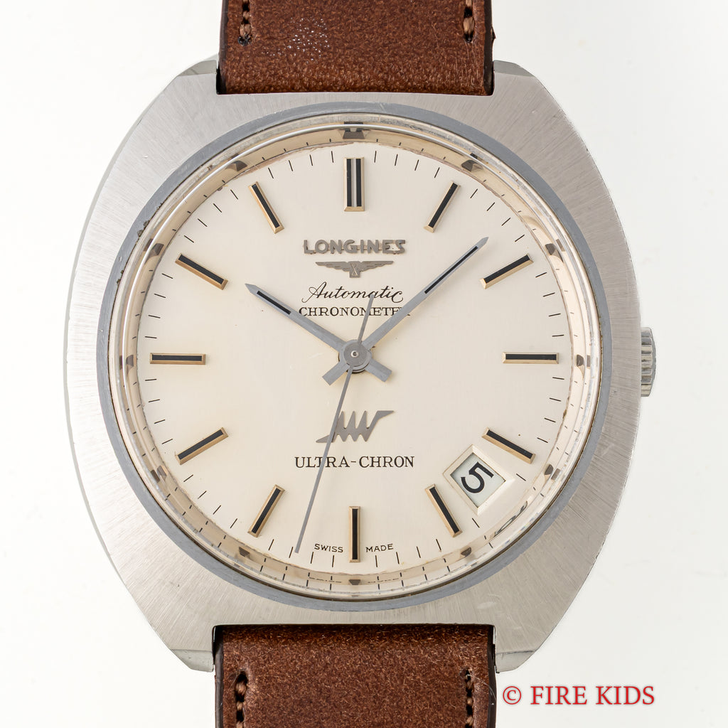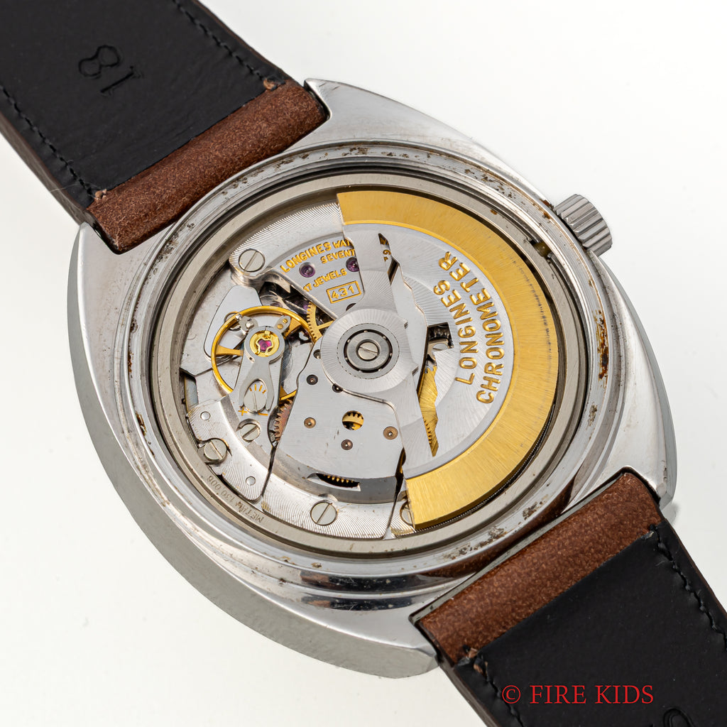 ロンジン ウルトラクロン クロノメーター 1969年製 10振動自動巻 Cal.431 Ref.8355-1の入荷になります。10振動のハイビート自動巻ムーブメントを搭載したウルトラクロンで非常に珍しいクロノメーターです。キャリバーはノンクロノメーター同様のCal.431ですが、ローターにCHRONOMETERの刻印があります。文字盤はシミ等無く綺麗です。ケースは小傷が見られますが大きなダメージはありません。手巻きや針回しの操作はスムースです。ベルトはファイアーキッズオリジナルのイタリアンレザーのブッテーロ(裏面ラバー)が取り付けられています。