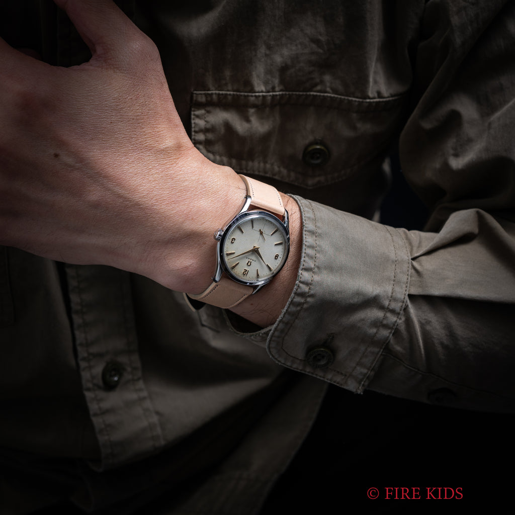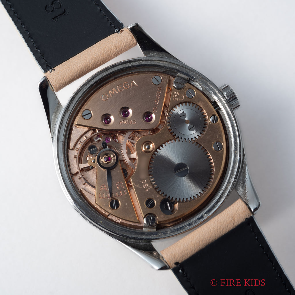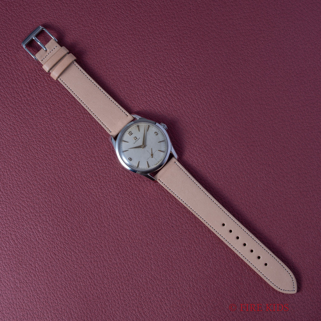 オメガ シーマスター 30mmキャリバー 1952年製 ギョウシェダイヤル Cal.265 スモールセコンド 手巻きの入荷になります。ギョウシェ文字盤が全体的に変色して唯一無二な一点物の雰囲気です。アラビア数字とクサビインデックス、ドーフィンハンド、スモールセコンドと50年代らしいヴィンテージ感があります。ケースはややツイストしたラグがお洒落なスクリューバックの防水仕様で小キスは見られますが大きなダメージはありません。ムーブメントは30㎜キャリバーシリーズのCal.266を搭載しています。ベルトはファイアーキッズオリジナルの栃木レザー(裏面ラバー)革ベルトが取り付けられています。