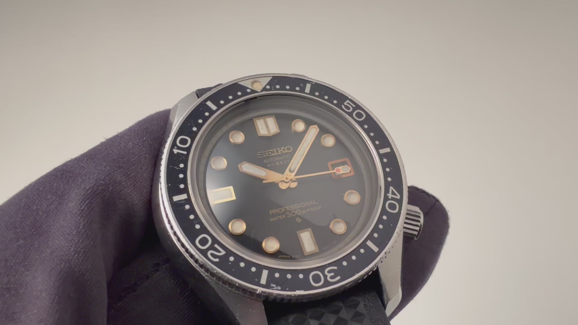 セイコー プロフェッショナル 300mダイバー 1969年製 カウントダウンベゼル Ref.6159-7001の入荷になります。こちらはセイコーダイバーシリーズの中でも、希少モデルとされている国産初のプロユーザー向けに開発されたプロフェッショナルダイバー300です。 機械は61グランドセイコーに搭載されている10振動ハイビートムーブメント『6145A』をベースに製造された『6159A』を搭載。ケースは小傷はありますが大きなダメージはなく、カウントダウンベゼルが付いています。オリジナルの文字盤は若干の艶感があり金文字でミラーダイヤルの雰囲気です。ベルトは社外のウレタンベルトが取り付けられています。こちらの時計は分解掃除済みです。