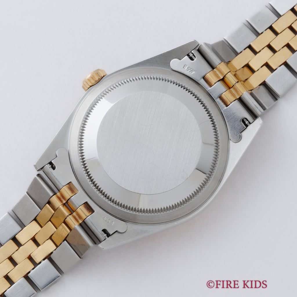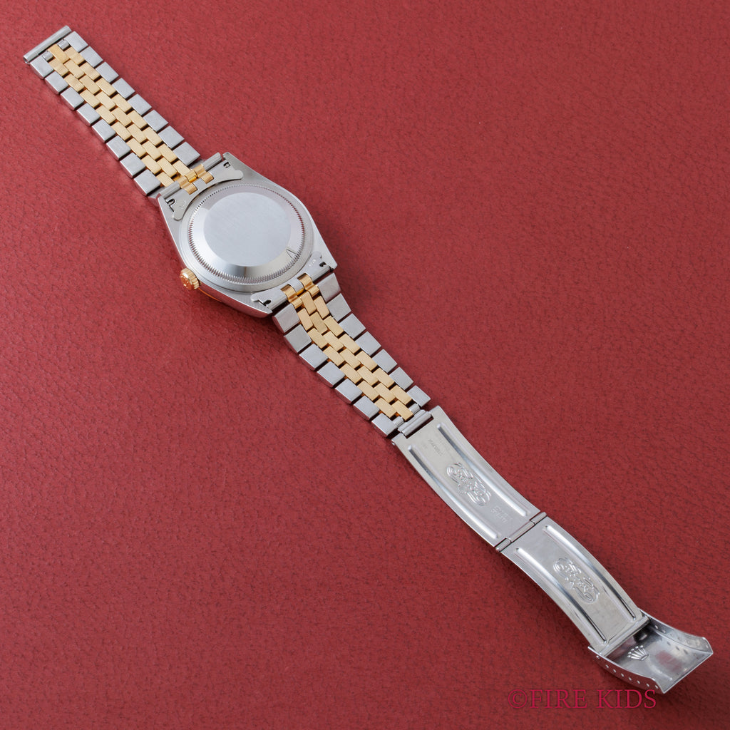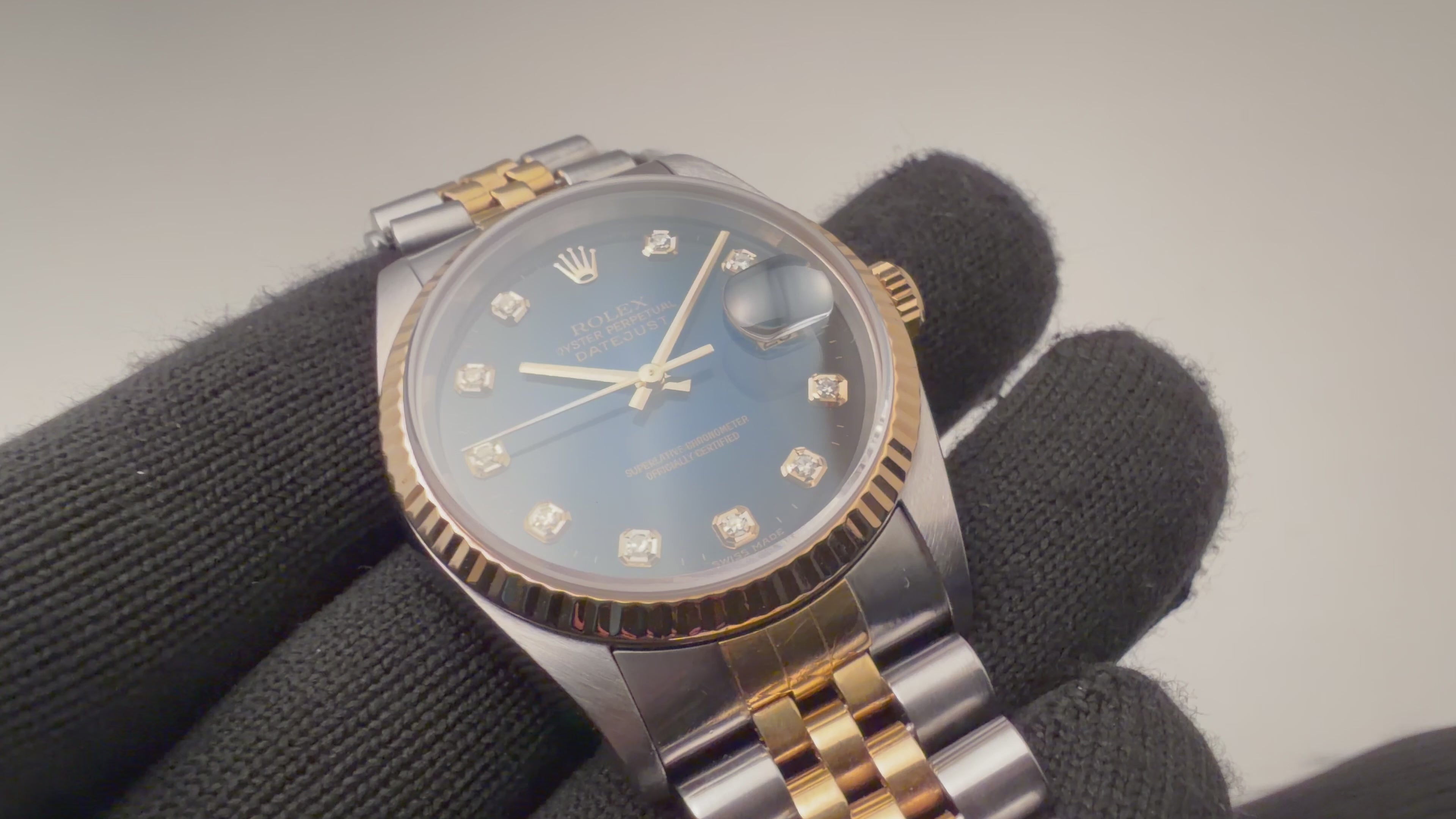 ロレックス デイトジャスト Ref.16233G ブルーグラデーションダイヤル 2000年製 純正ジュビリーコンビブレスの入荷になります。ミドルケースはステンレスでベゼルはイエローゴールドのコンビモデルで、文字盤はブルーグラデーションに11Pダイヤのついた高級感溢れるモデルになります。機械は安心のロングセラーCal.3135を搭載しております。ケースは小傷が見られますが大きなダメージはありません。ベルトはコンビ5連ジュビリーブレスのが取り付けてあります。手巻きや針回し、ねじ込みリューズの操作はスムースです。こちらはギャラ、タグ付きになります。こちらは分解掃除済みになります。