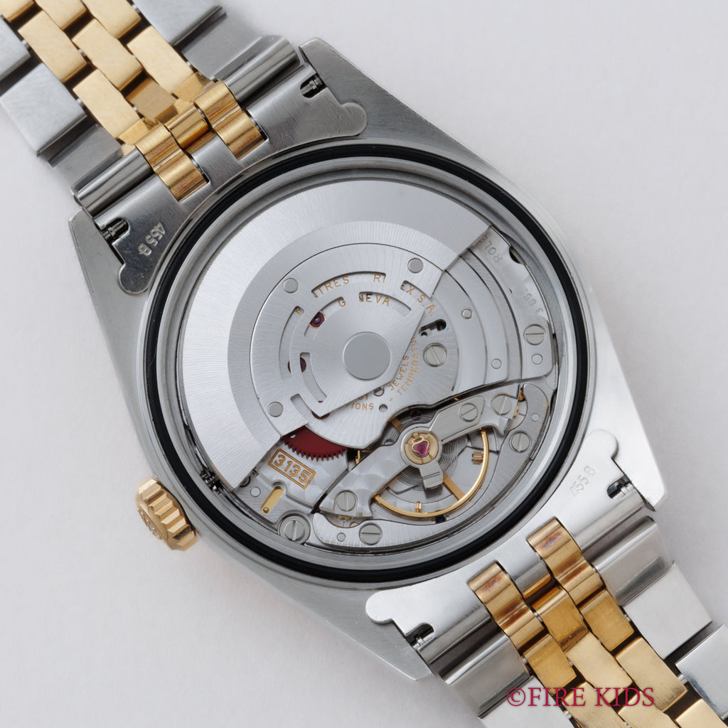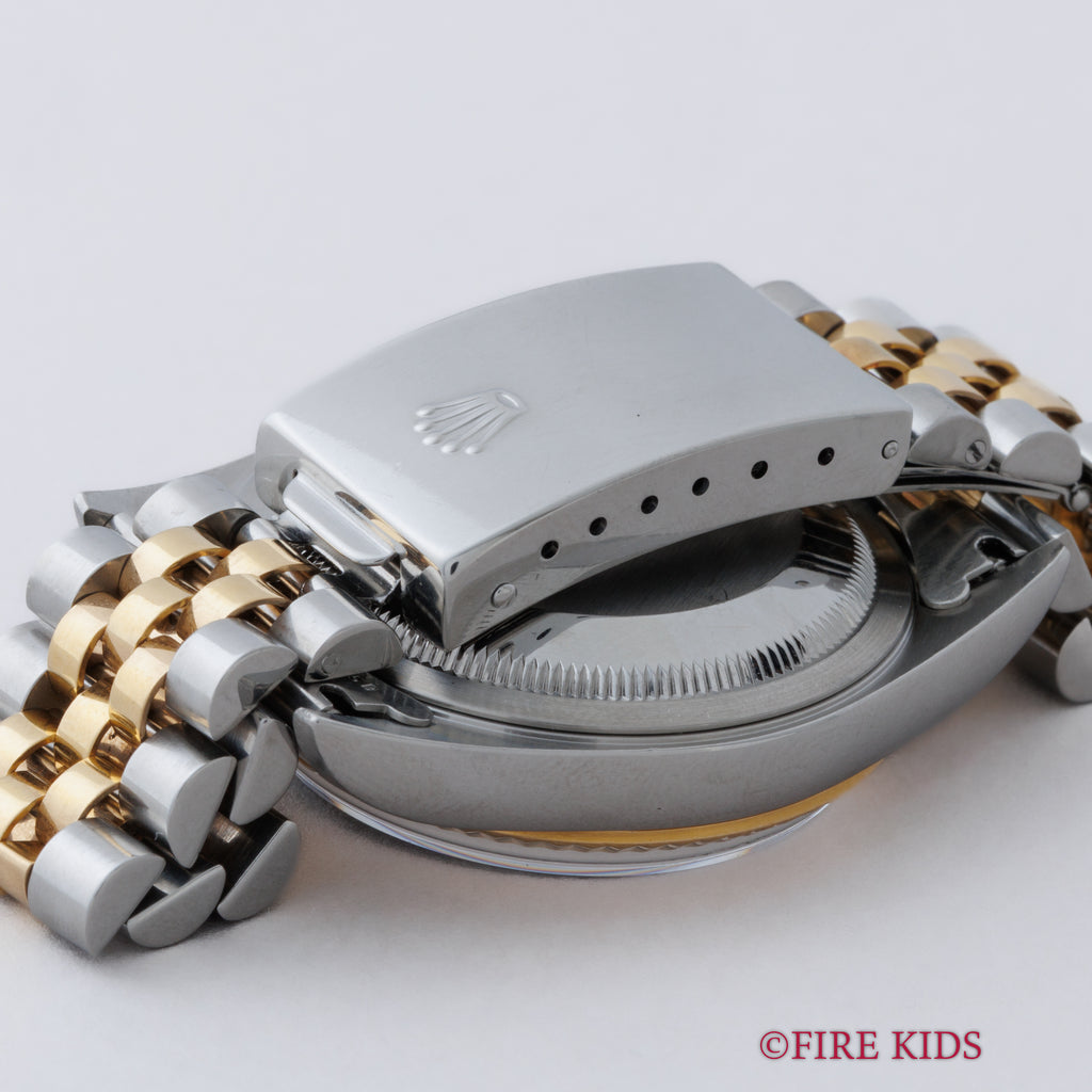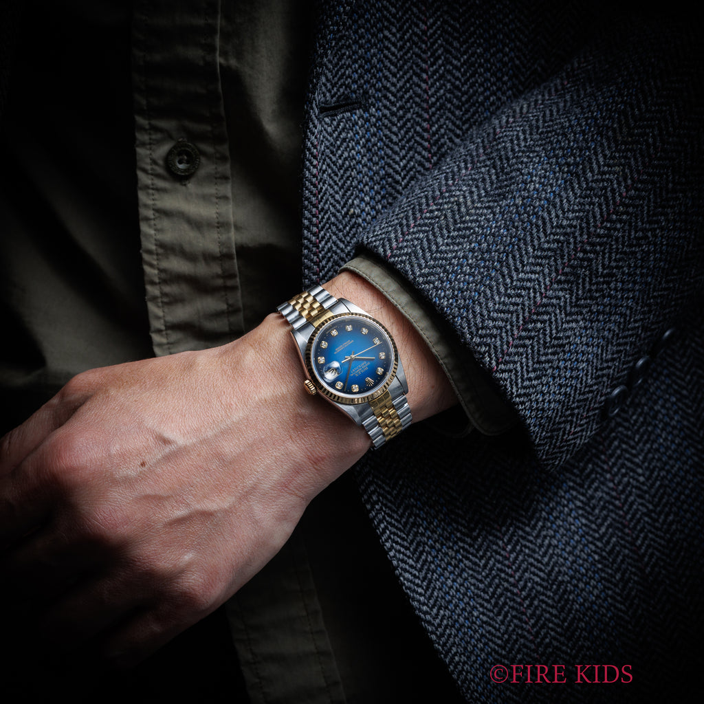 ロレックス デイトジャスト Ref.16233G ブルーグラデーションダイヤル 2000年製 純正ジュビリーコンビブレスの入荷になります。ミドルケースはステンレスでベゼルはイエローゴールドのコンビモデルで、文字盤はブルーグラデーションに11Pダイヤのついた高級感溢れるモデルになります。機械は安心のロングセラーCal.3135を搭載しております。ケースは小傷が見られますが大きなダメージはありません。ベルトはコンビ5連ジュビリーブレスのが取り付けてあります。手巻きや針回し、ねじ込みリューズの操作はスムースです。こちらはギャラ、タグ付きになります。こちらは分解掃除済みになります。