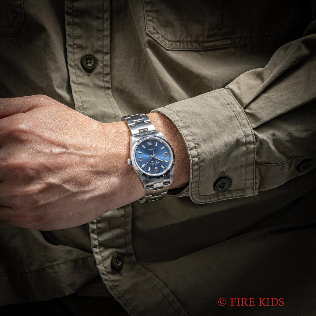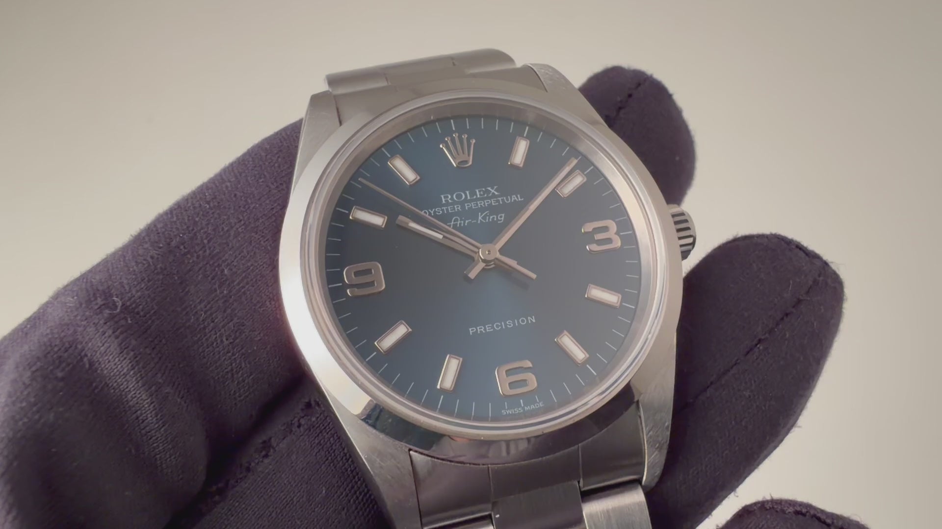 ロレックス エアキング 2001年製 Ref.14000M ブルーダイヤル Cal.3130 純正オイスターブレスの入荷になります。ノンデイトで使いやすく3.6.9のアラビア数字はエクスプローラーを思わせるデザインです。文字盤はシミ等無く綺麗です。ケースは小傷が見られますが大きなダメージはありません。ムーブメントはCal.3130を搭載しています。手巻きや針回し、ねじ込みリューズの操作はスムースです。ベルトは純正ステンレスブレス78350 / FF557Bが取り付けてあります。