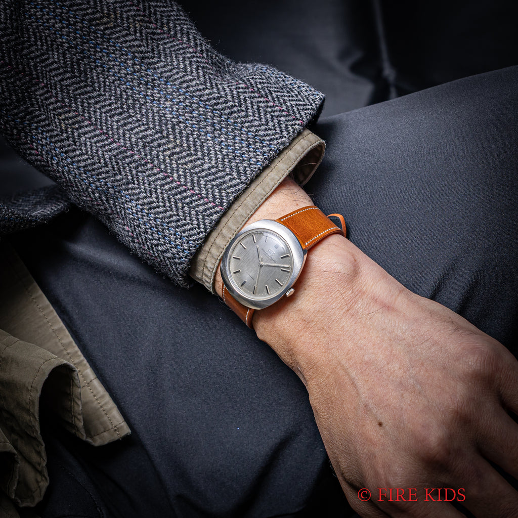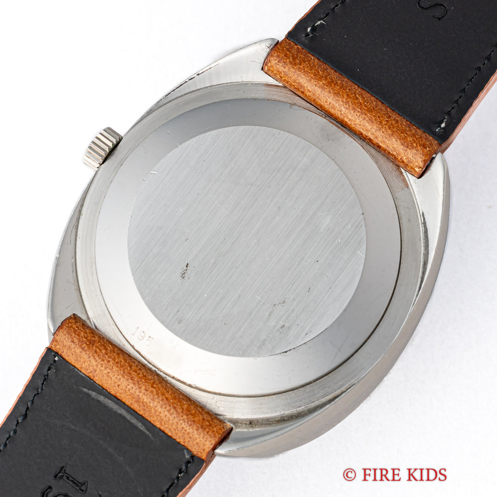 インターナショナルウォッチカンパニー 1969年製トノーケース ペラトン式自動巻き Cal.854B ノンデイトの入荷になります。ペラトン式自動巻きの後期型Cal.854Bを搭載したモデルでこの年式では珍しいノンデイトが魅力的です。お魚リューズが付いた防水ケースを採用しています。ケースは小傷が見られますが大きなダメージはありません。文字盤も目立つ劣化はありません。手巻きや針回しの操作もスムースです。革ベルトはファイアーキッズオリジナルのイタリアンレザーのブッテーロ(裏面ラバー)が取り付けられています。