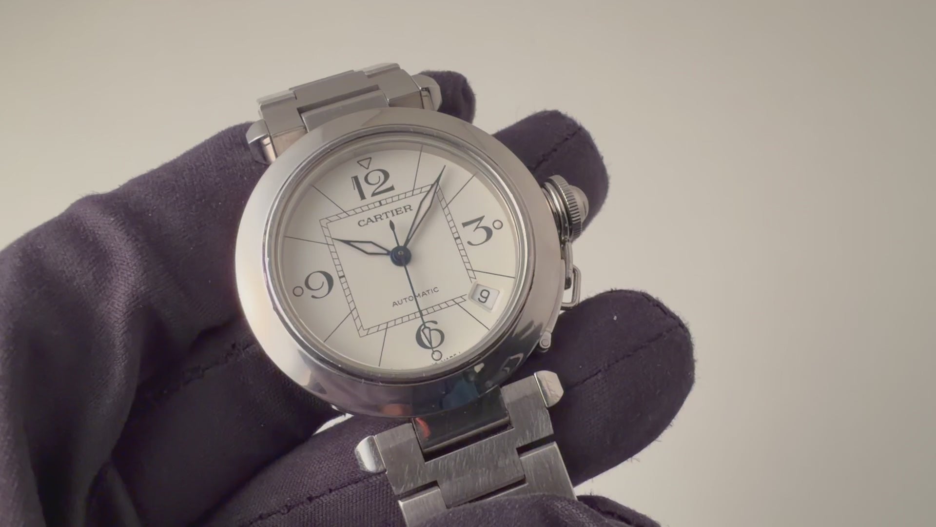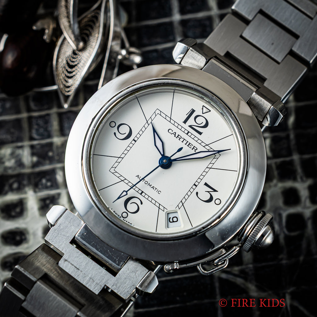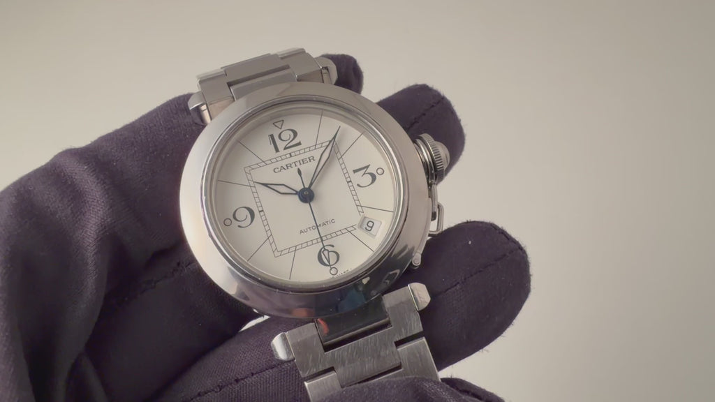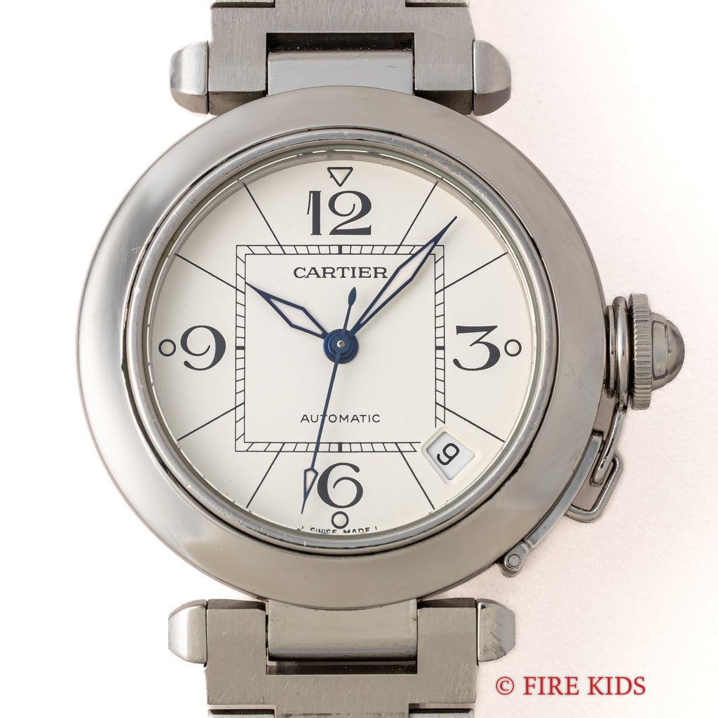 カルティエ パシャC オートマチック2000年代製 Ref.2324 ホワイトダイヤルの入荷になります。ラグジュアリースポーツモデルの35㎜サイズで男女を問わず使いやすくてお洒落な1本です。爽やかなホワイトダイヤルに4時デイトがパシャCらしい良いバランスです。ケースは小傷が見られますが大きなダメージはありません。ベルトは純正のステンレスブレスが装着されています。