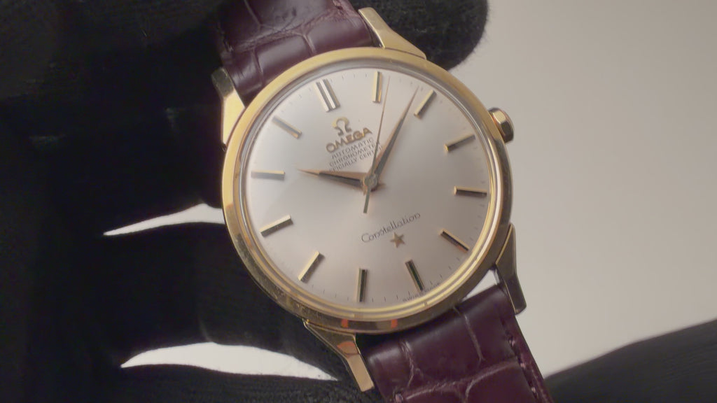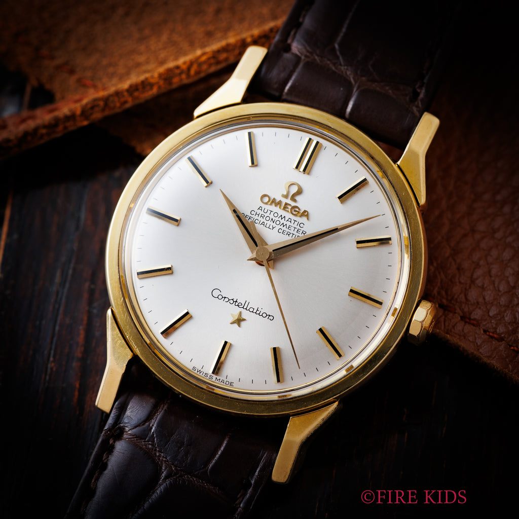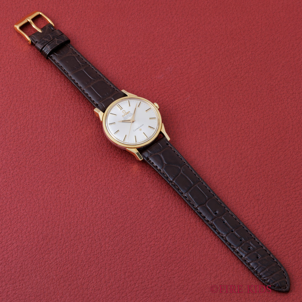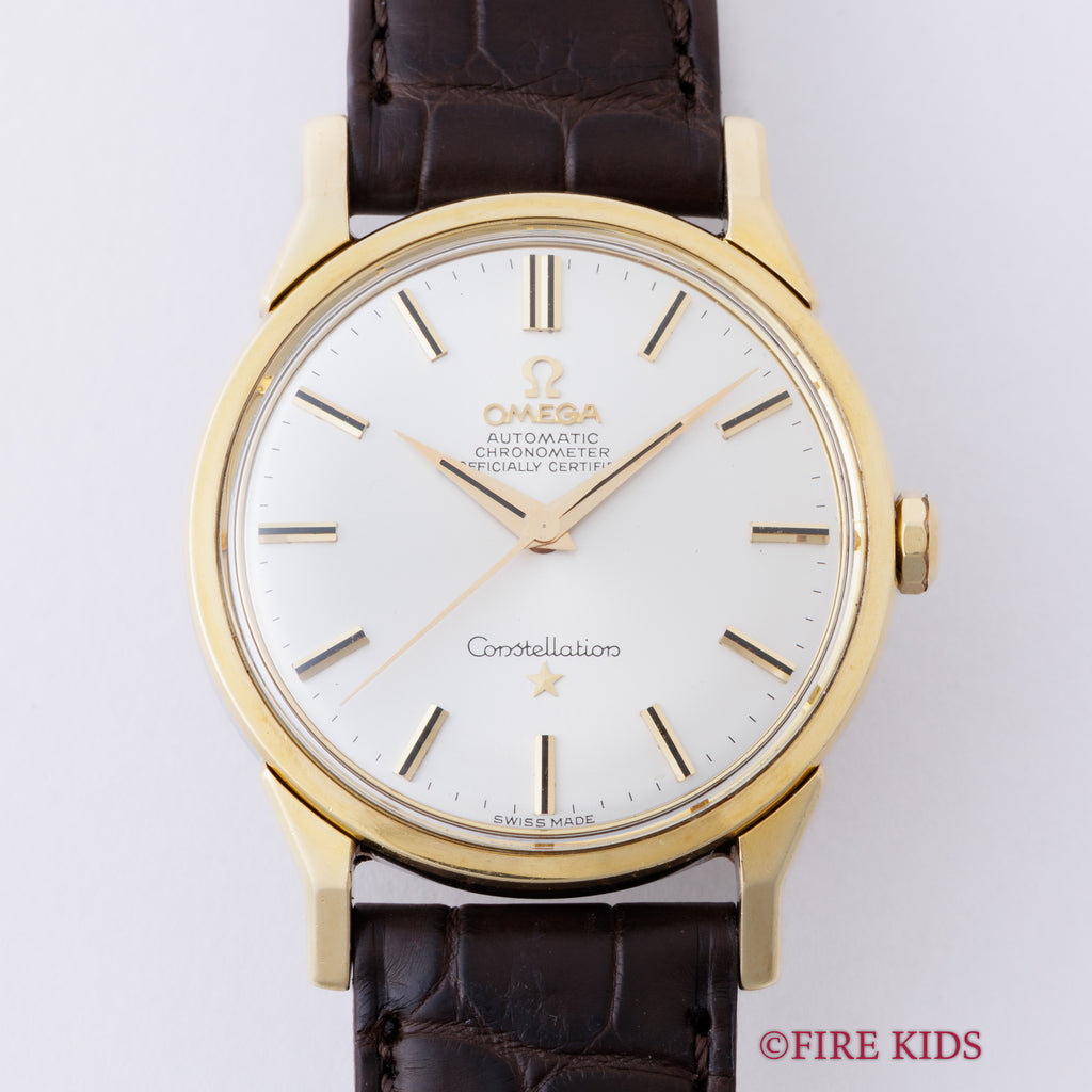 オメガ コンステレーション トップゴールド 1967年製 Ref.167.005 Cal.551 自動巻クロノメーターです。シルバーの文字盤は、傘型にカーブしており、剣針が付くヴィンテージらしいデザインです。文字盤は劣化等見られなく綺麗な状態です。ケースは小傷が見られますが大きなダメージはありません。ムーブメントはオメガの黄金時代を支えた自動巻きクロノメーターCal.551を搭載しています。ベルトはファイアーキッズオリジナルのクロコダイルの革ベルトを合わせています。こちらの時計は分解掃除済みになります。
