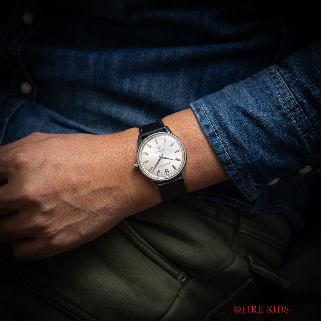 シンプルな3針、ノンデイトの使いやすいモデルです。ムーブメントは手巻き21石のCal.6220Cを搭載。シンプルながらも長めのドーフィンハンドが魅力的です。ケースは小傷が見られますが大きなダメージはございません。裏蓋のタツノオトシゴマークも残っています。手巻きや針回しの操作はスムーズです。ベルトはファイアーキッズオリジナルのイタリアンレザーのブッテーロ(裏面ラバー)が取り付けられています。