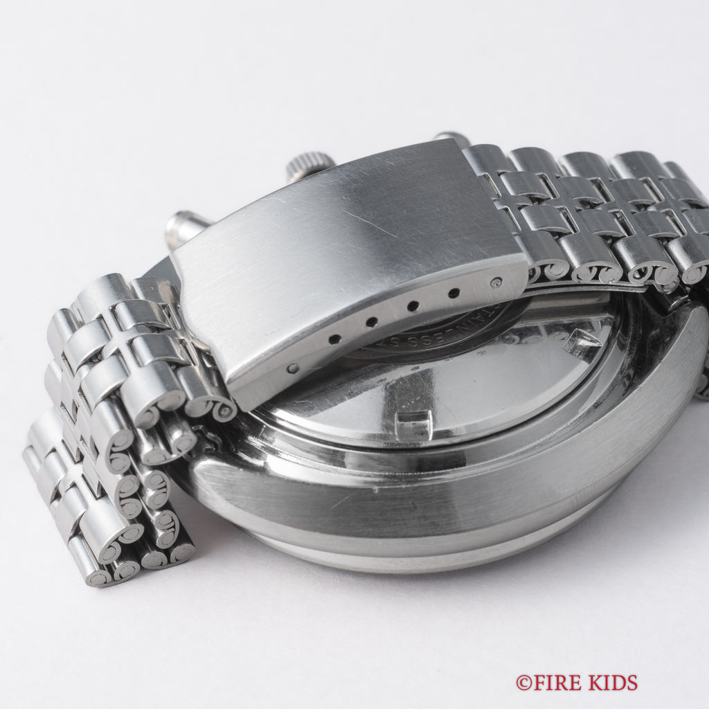 1971年製のセイコースピードタイマー UFO Ref.6138-0011です。円盤型のケース形状から「UFO」の愛称で親しまれ人気のモデルです。縦目の2レジスタークロノグラフでインダイヤルのオレンジマーカーが良いアクセントになっています。機械は自動巻きのクロノグラフムーブメント6138Bを搭載、曜日は日英表記のデイデイトで、早送り機能付きです。ケースに小傷が見られますが大きなダメージはありません。ブレスは社外のステンレスブレスが取り付けてあります。手巻きや針回しの操作はスムースです。こちらは分解掃除済みになります。