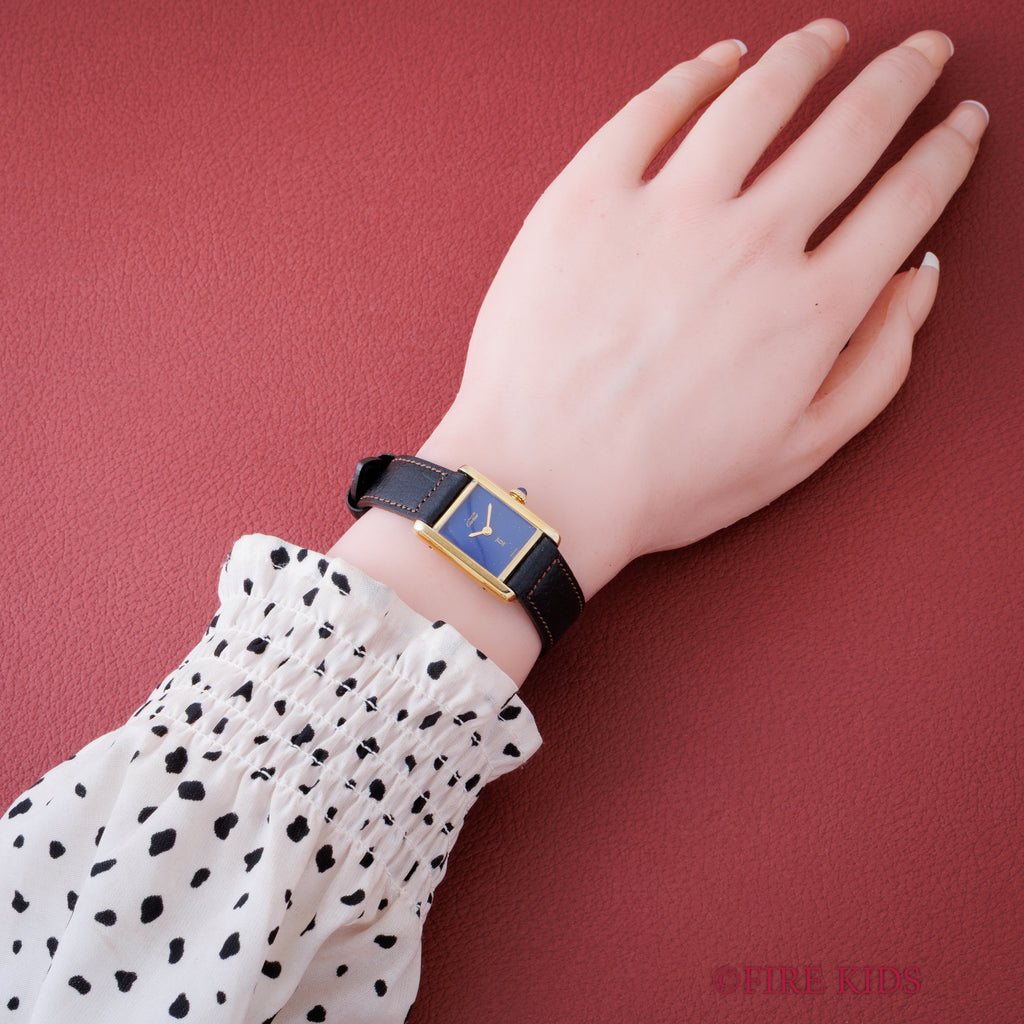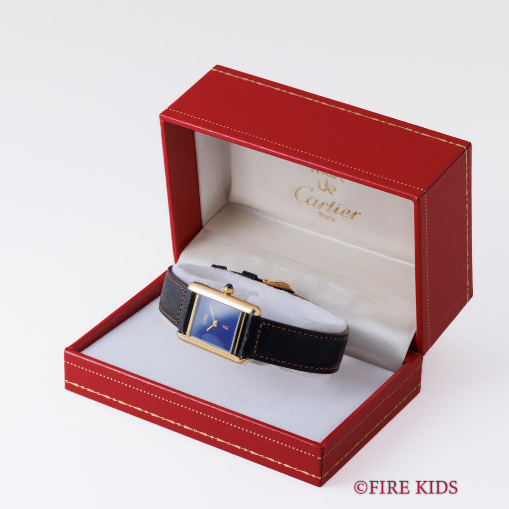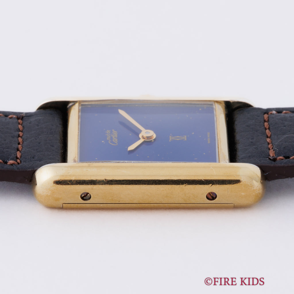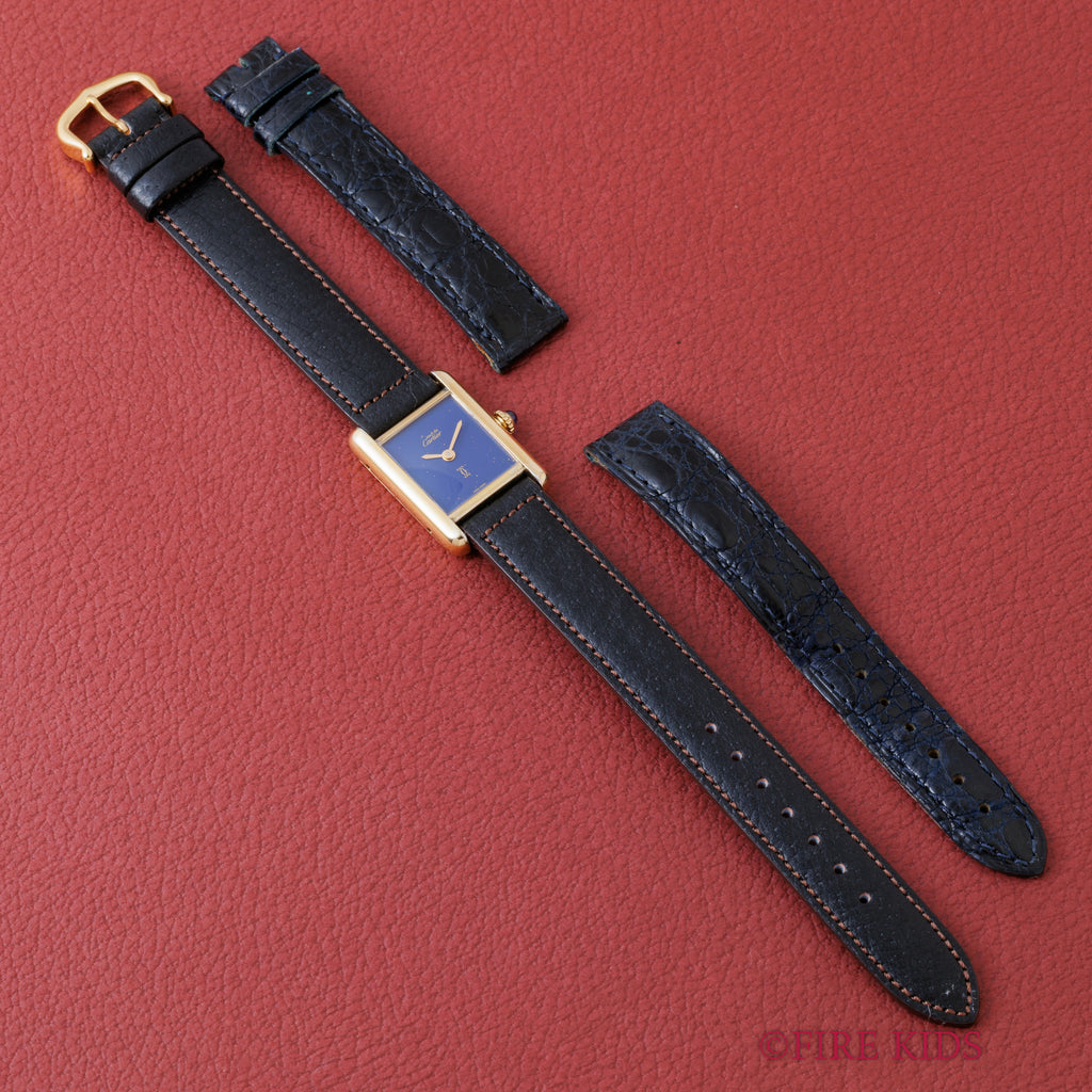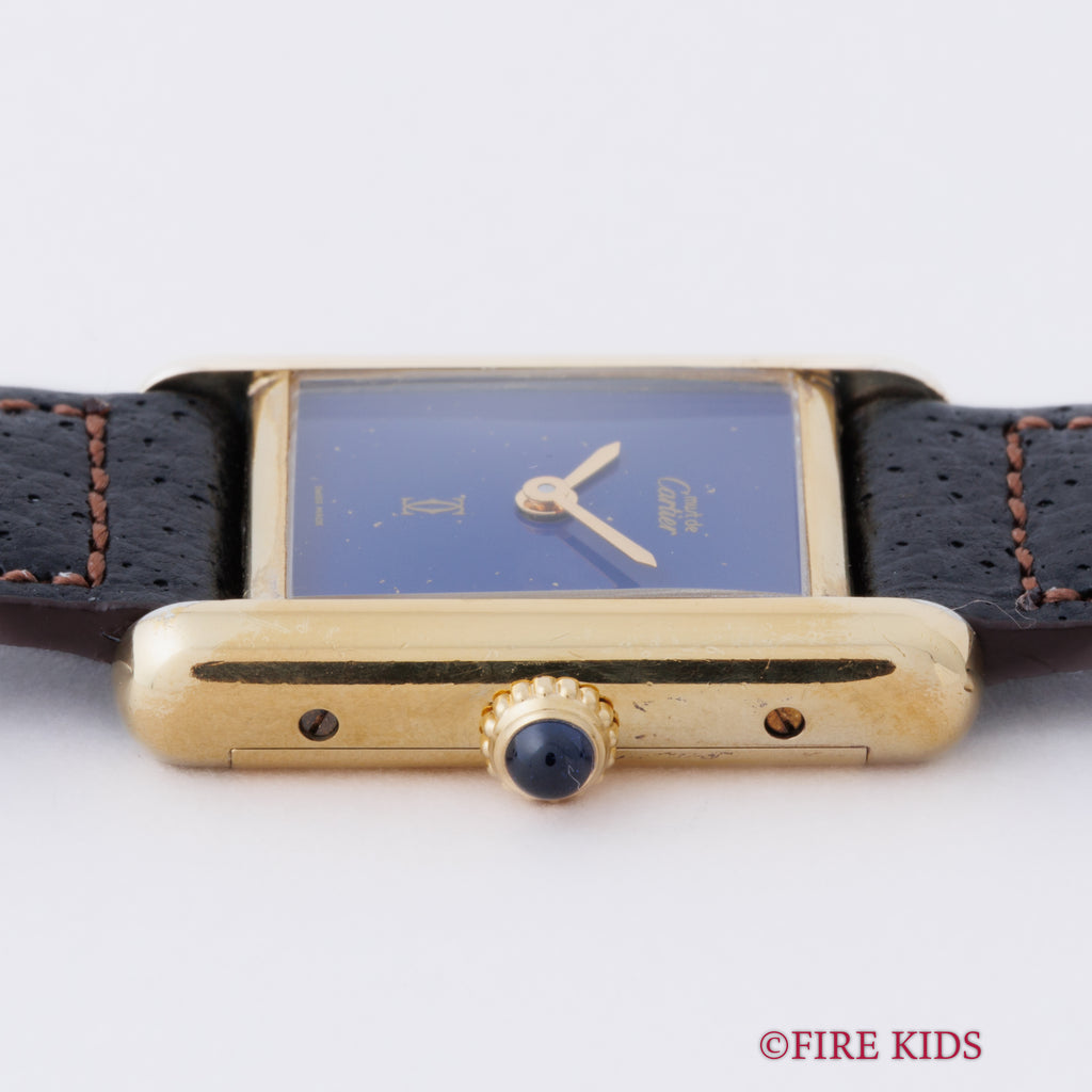 カルティエ マストタンク 1980年代製 SMサイズ 手巻き ラピスブルーダイヤル 純正尾錠付き 箱、中古純正革ベルト付き