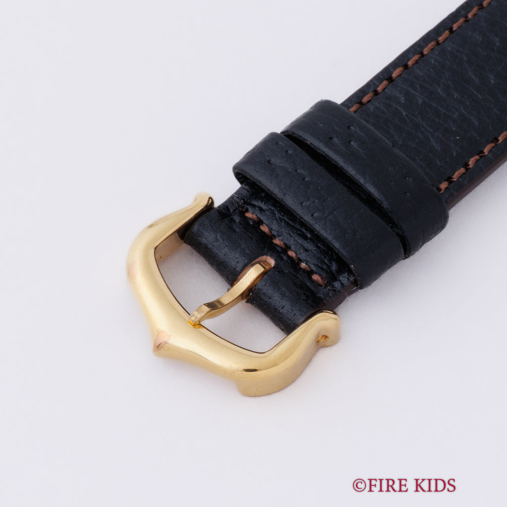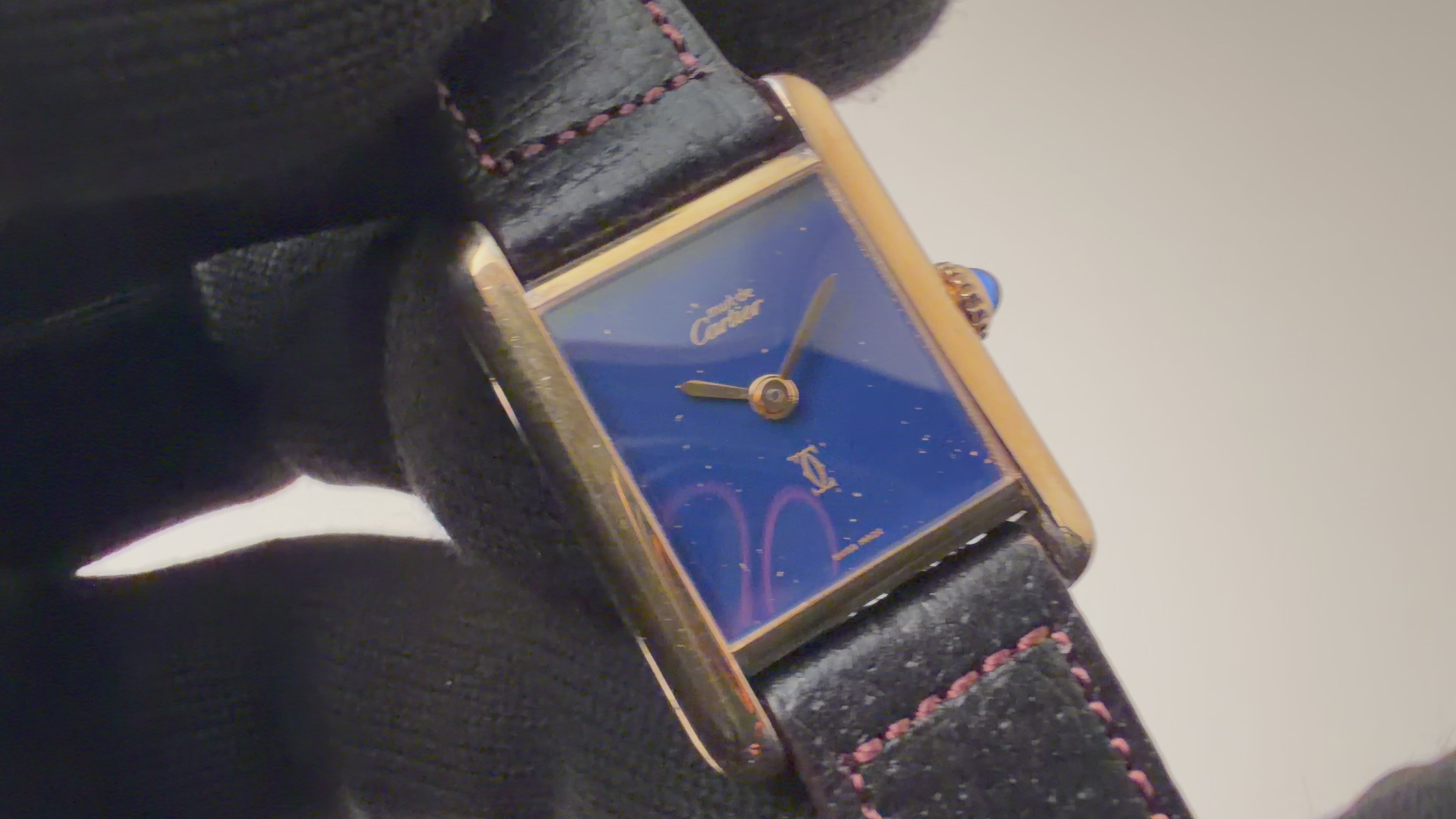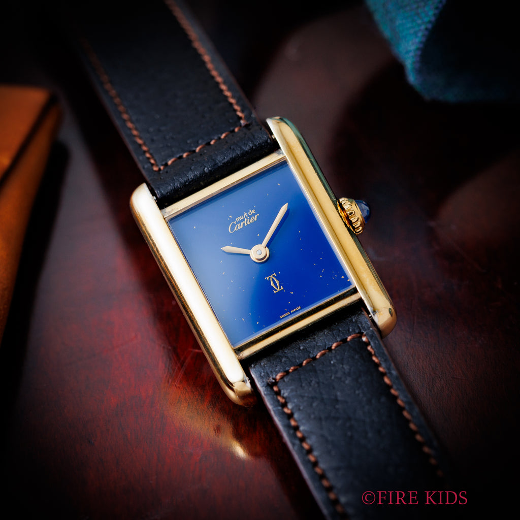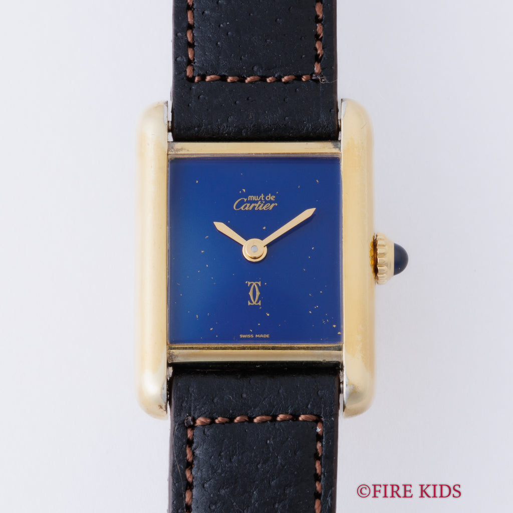 カルティエの人気モデルマストタンクSM(レディースサイズ)1980年代製です。深みのあるラピスブルーの文字盤には、まるで満天の星空を閉じ込めたかのように金の粒がきらめき、視線を奪われる美しさです。ベルメイユ加工のケースは小傷等使用感はございますが大きなダメージはありません。手巻きや針回しの操作はスムースです。ベルトは社外の革ベルトに純正尾錠が取り付けてあります。こちらの時計は分解掃除済みになります。箱、使用感のある純正革ベルト付きです。