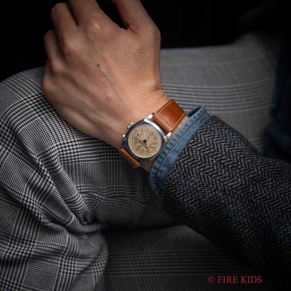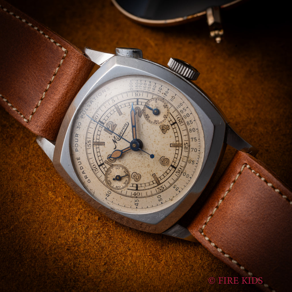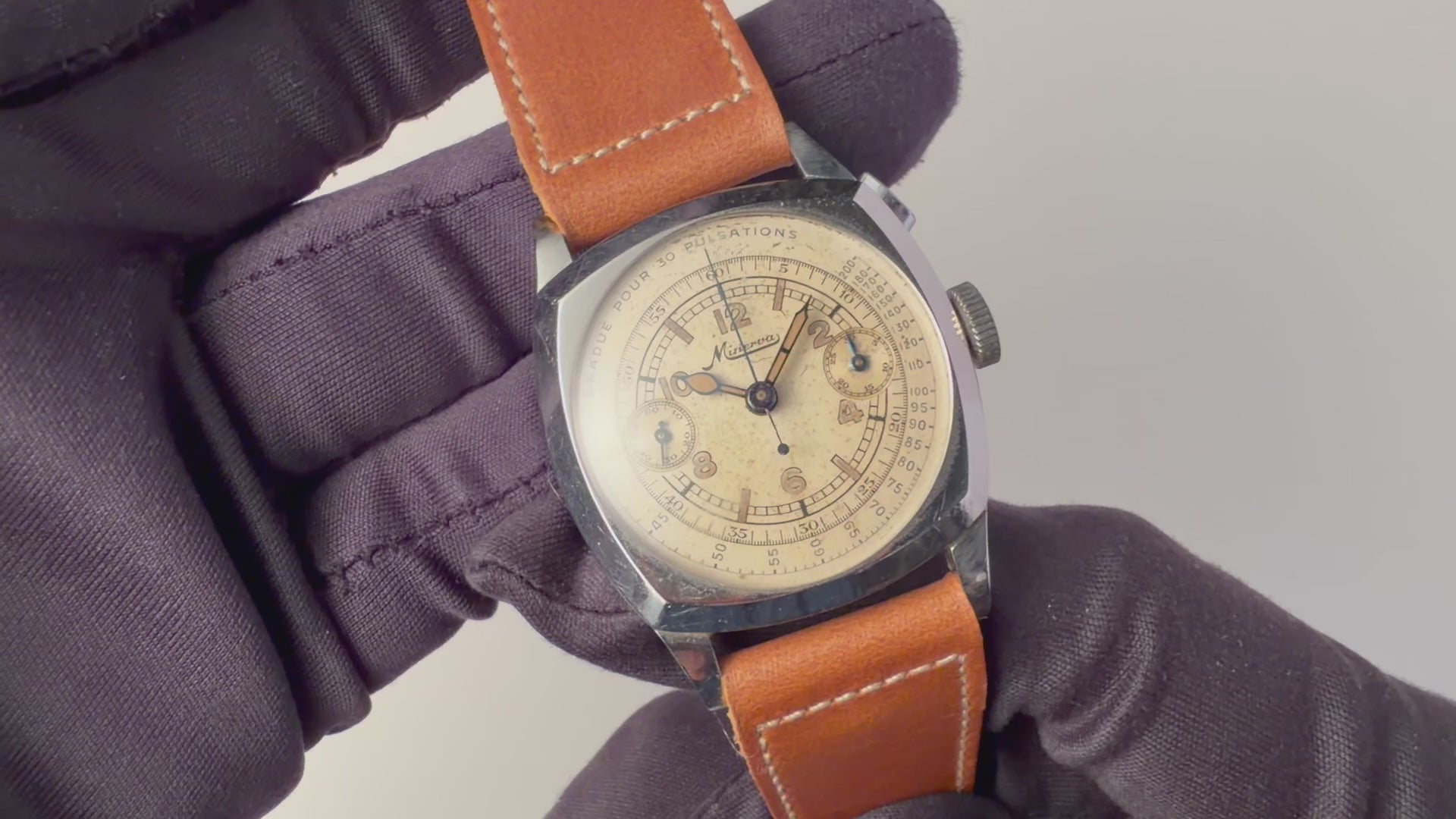 1940年代のミネルバ 2レジスターワンプッシュクロノグラフです。外周にパルスメーターを装備したドクターズウオッチで小さな積算計に青焼き針がキラリと光り、ビンテージらしい顔つきの1本。ムーブメントは自社のCal.13-20CHを搭載、モバード95Mと並び世界3大クロノグラフと称される完成度が高く人気の機械です。2時位置のプッシャーを1度押すことで中央のクロノ針がスタートし、もう一度押すことでストップ、再度押すとリセットされます。針回しはスムーズでクロノグラフの動作も問題ありません。革ベルトはアキュレイトフォルムのオープンエンドタイプが取り付けてあります。