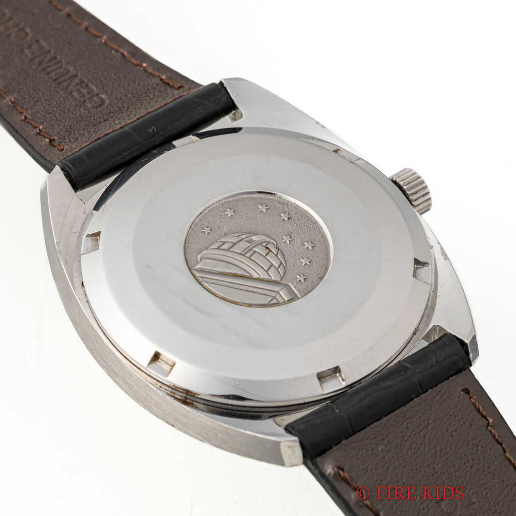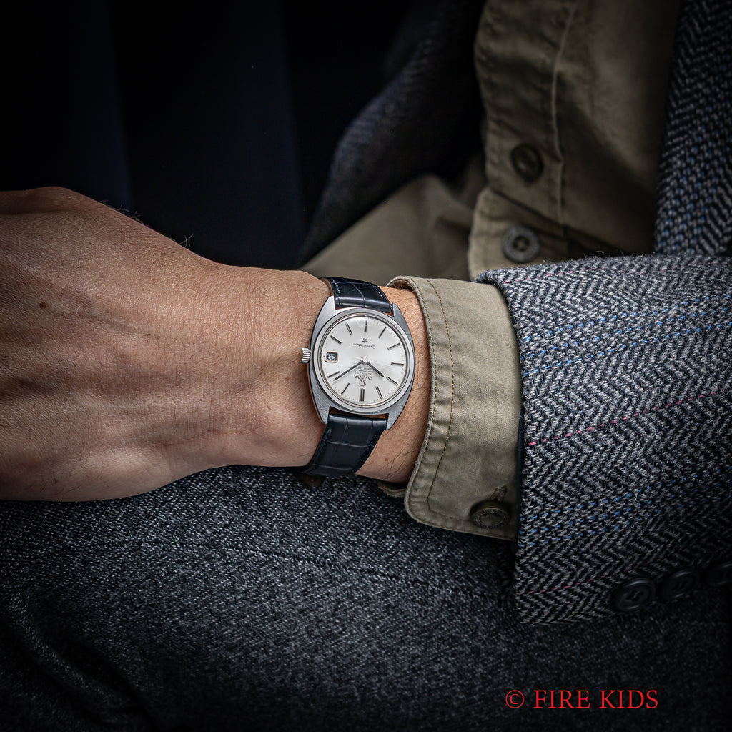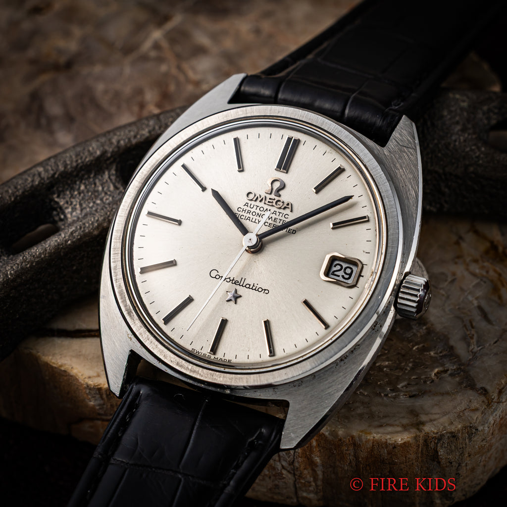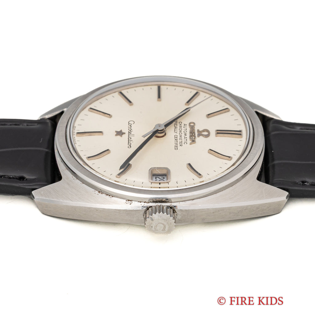 オメガ コンステレーション 1971年製 Ref.168.017SP ジェンタ クロノメーター自動巻きです。世界一有名な時計デザイナーとして知られるジェラルド・ジェンタ氏の代表作の一つです。サンレイのシルバーダイヤルは高級感があり、文字盤は視認性も良いです。ムーブメントはクロノメーターのCal.564を搭載、リューズを2段階でカレンダーを早送りできます。手巻きや針回し操作もスムーズです。ベルトはファイアーキッズオリジナルのクロコダイル革ベルトが取り付けてあります。