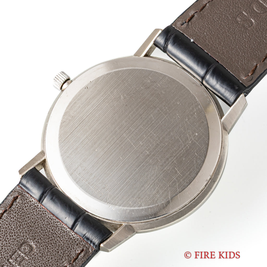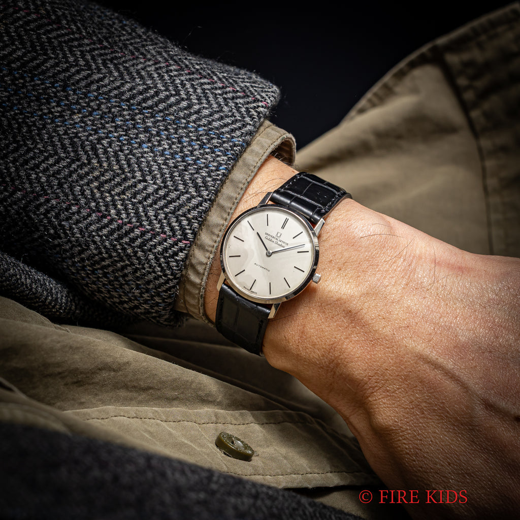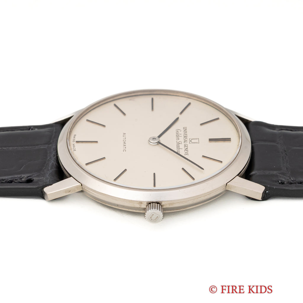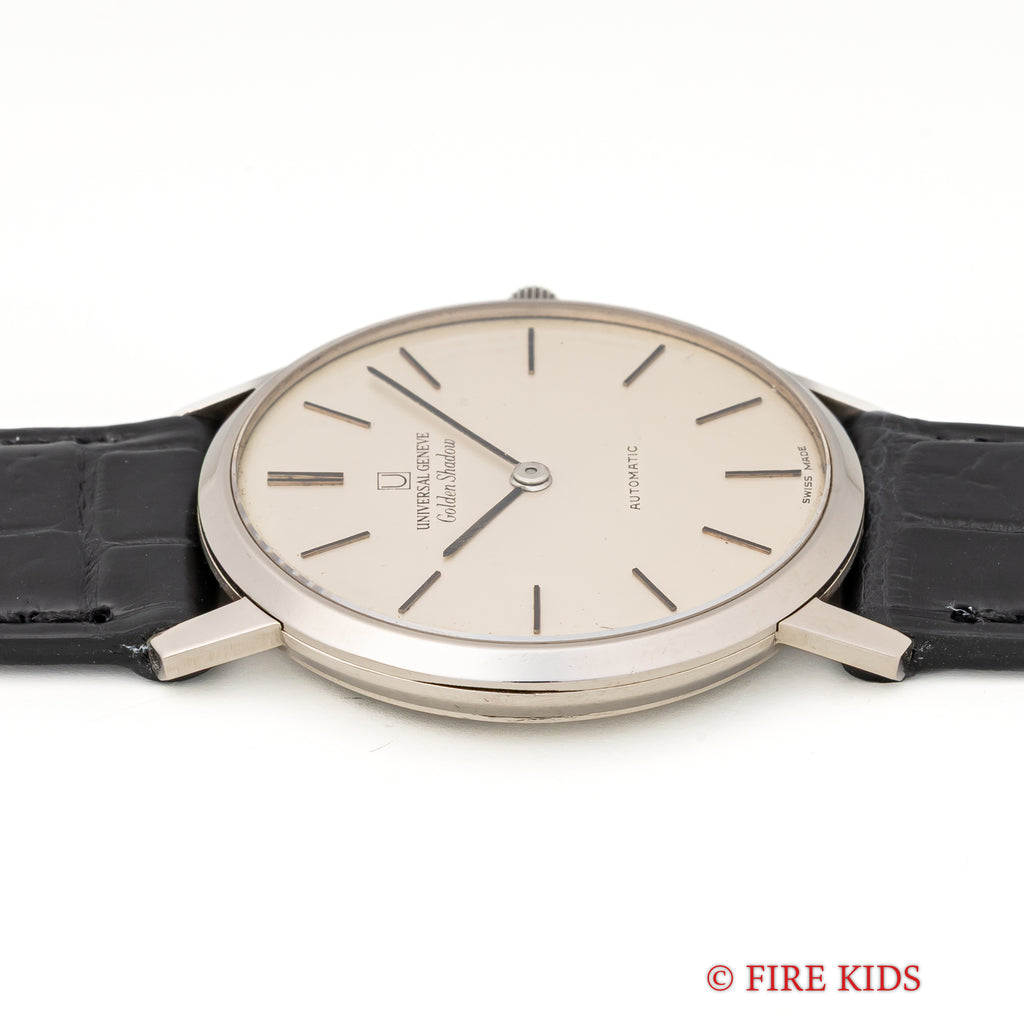 ユニバーサル ジュネーブ ゴールデンシャドウ 18金無垢 1967年製 マイクロローター自動巻きです。18KWGのラウンド型の薄型でマイクローターを搭載し、この薄さでありながら自動巻きを実現させています。シンプルなラウンドケースのデザインで腕乗りの良い時計です。ムーブメントは抜群の仕上がりの自動巻きCal.2-66を搭載。手巻きや針回しの操作はスムースです。ケースは小傷はございますが大きなダメージはございません。ベルトはファイアーキッズオリジナルのクロコダイル革ベルトが取り付けてあります。