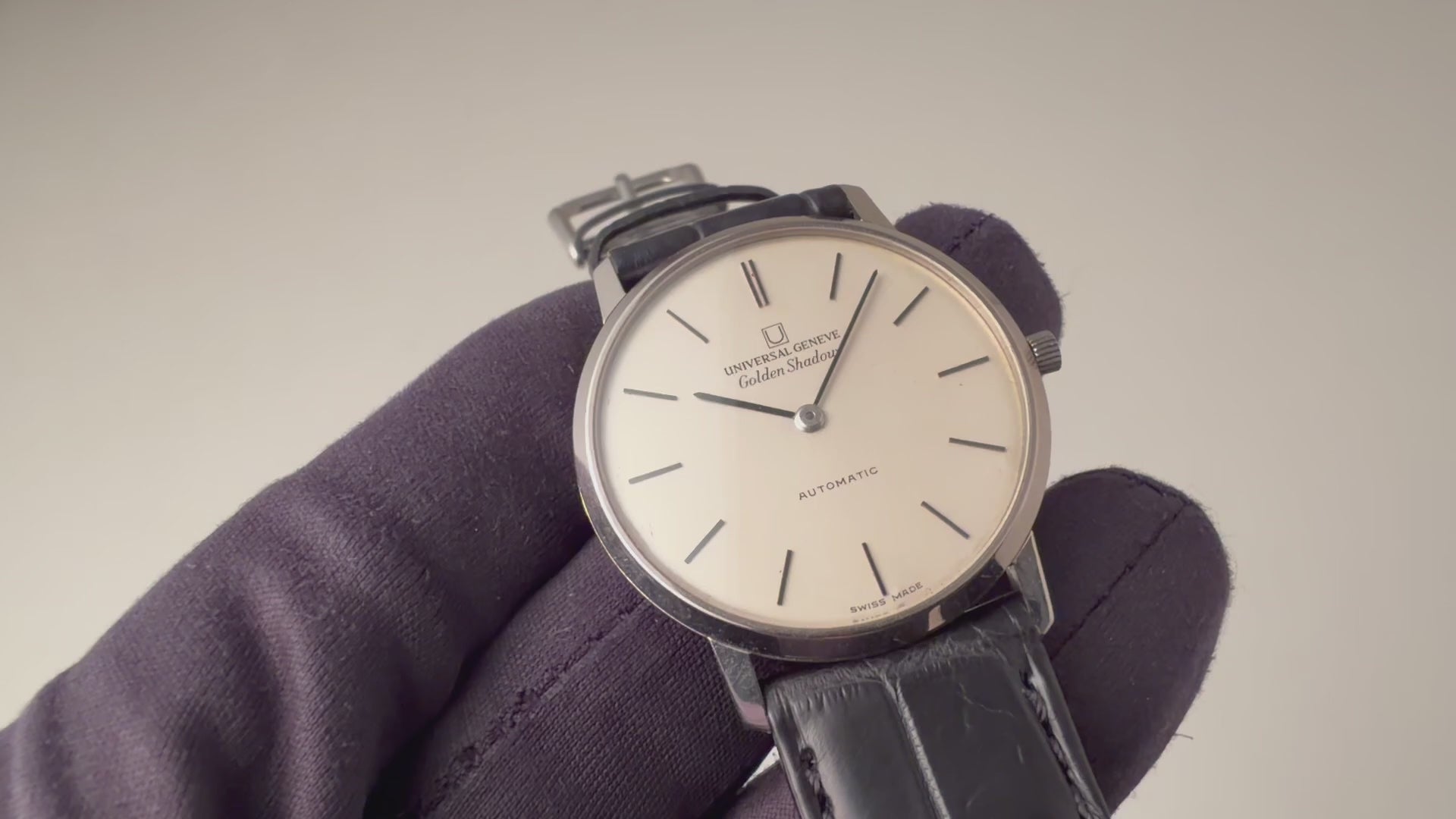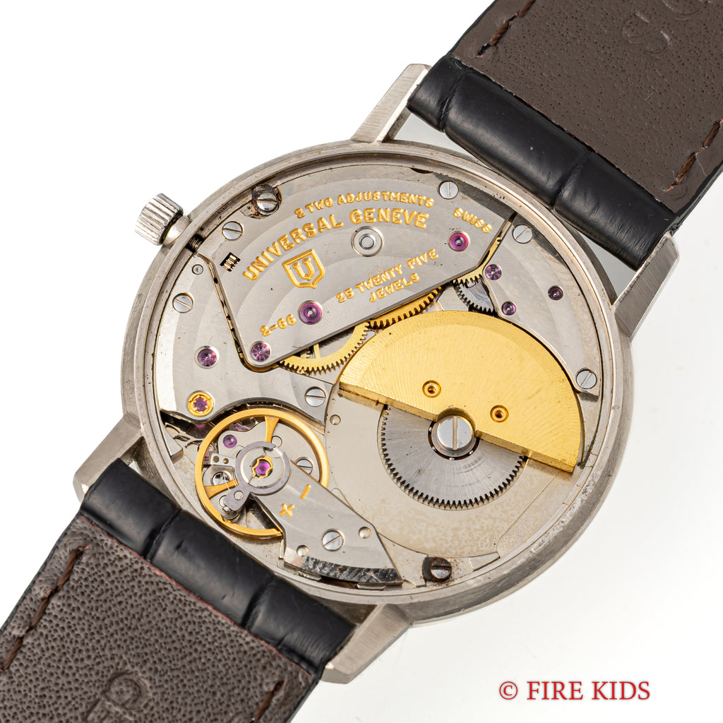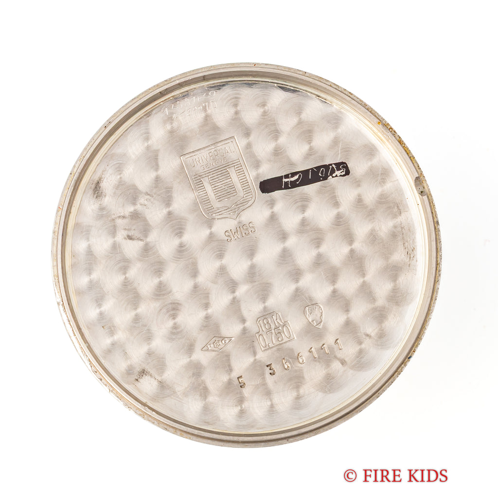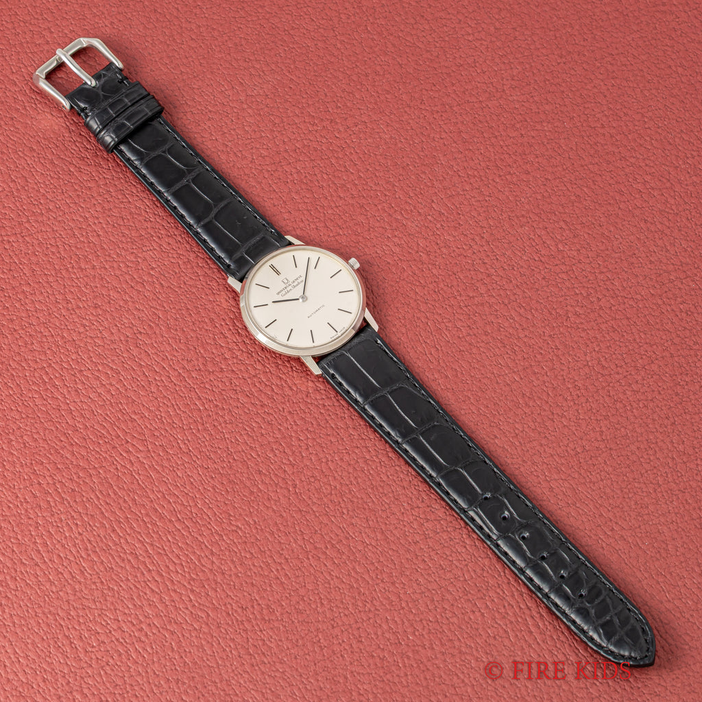 ユニバーサル ジュネーブ ゴールデンシャドウ 18金無垢 1967年製 マイクロローター自動巻きです。18KWGのラウンド型の薄型でマイクローターを搭載し、この薄さでありながら自動巻きを実現させています。シンプルなラウンドケースのデザインで腕乗りの良い時計です。ムーブメントは抜群の仕上がりの自動巻きCal.2-66を搭載。手巻きや針回しの操作はスムースです。ケースは小傷はございますが大きなダメージはございません。ベルトはファイアーキッズオリジナルのクロコダイル革ベルトが取り付けてあります。