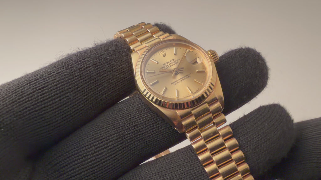 1978年製のロレックスデイトジャストレディース18金無垢です。ケース素材は18金無垢イエローゴールドに文字盤はシンプルなシャンパンダイヤルで大人な雰囲気を感じる組み合わせです。ムーブメントは自動巻きのCal.2030を搭載。ケースは小傷程度で目立つ大きなダメージはありません。手巻きや針回しの操作はスムースで、リューズのねじ込み具合も問題ありません。ベルトは若干の伸びがありますが、純正18金無垢ブレスのが装着されています。こちらは分解掃除済みになります。