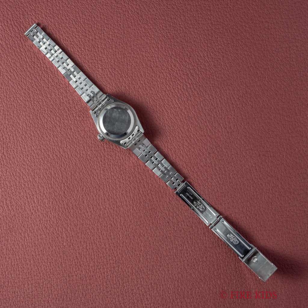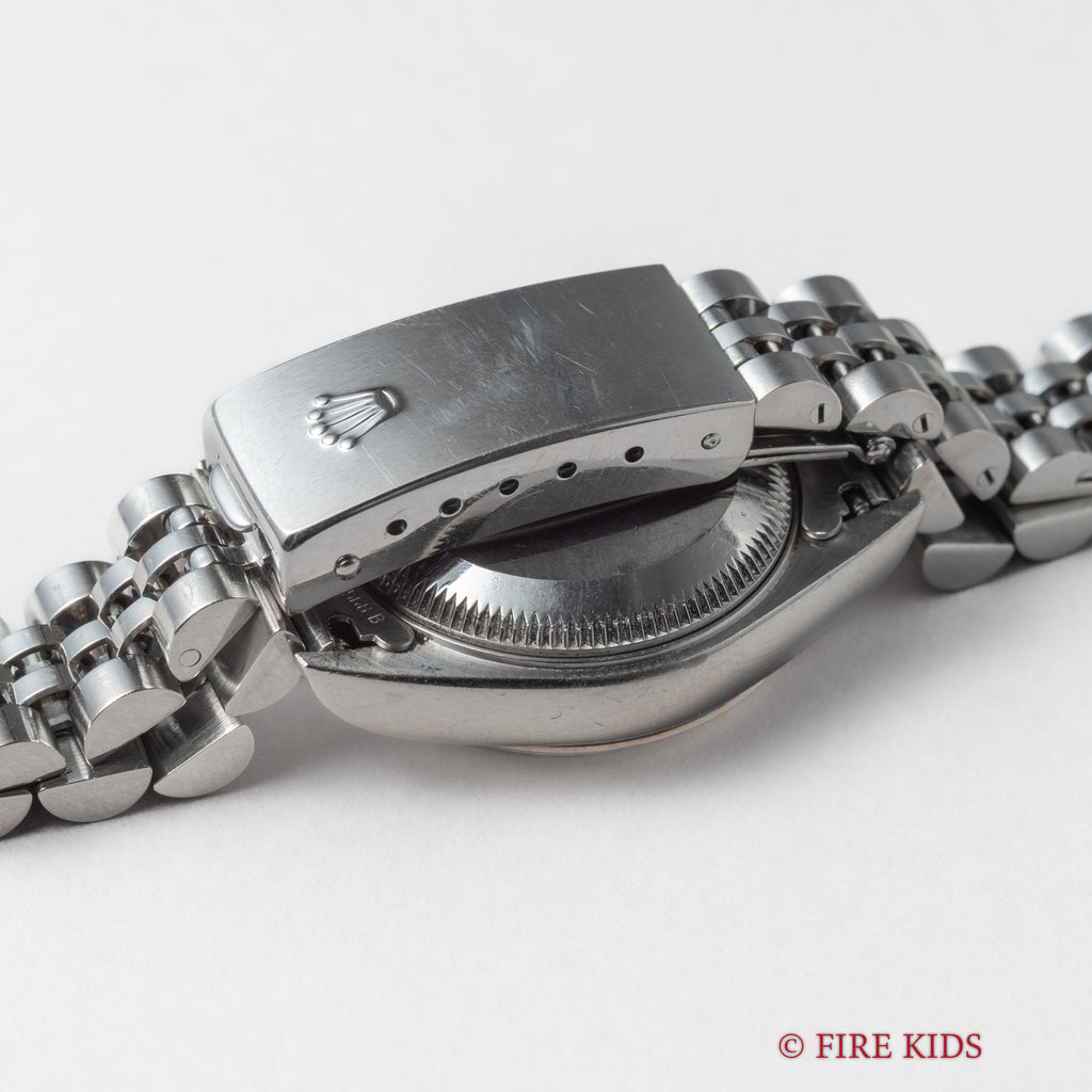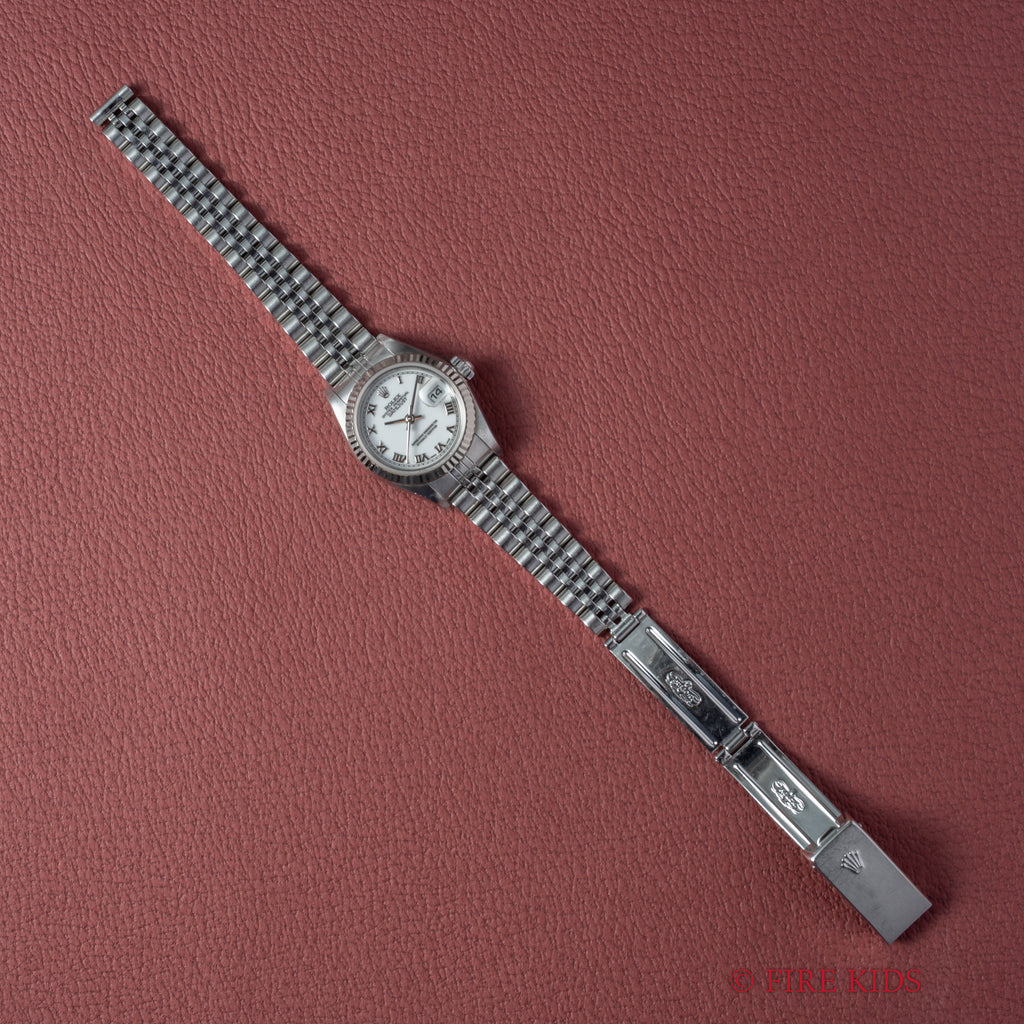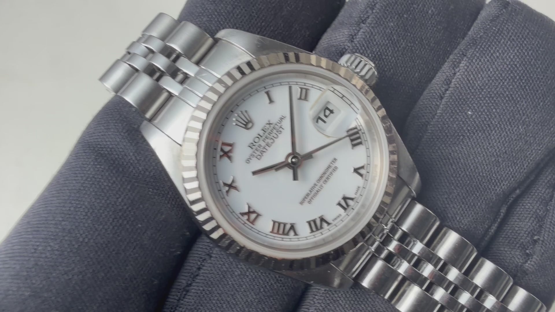 ロレックス デイトジャスト ホワイトローマン レディース 2002年製 Ref.79174です。シンプルなホワイトローマンダイヤル、ホワイトゴールドベゼルが光ります。文字盤は非常に綺麗です。ケースは小傷が見られますが大きなダメージはありません。手巻きや針回しの操作はスムースです。純正ジュビリーブレスが取り付けられています。