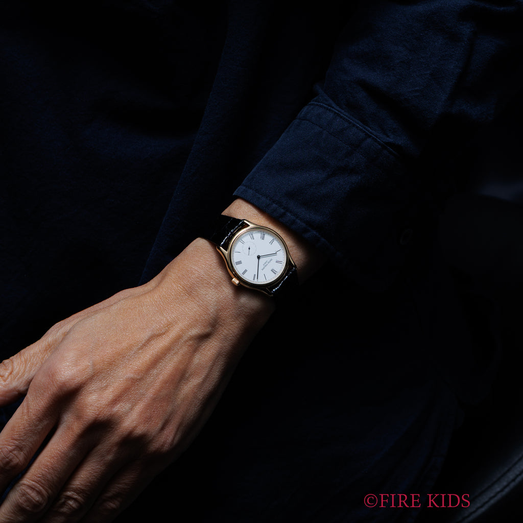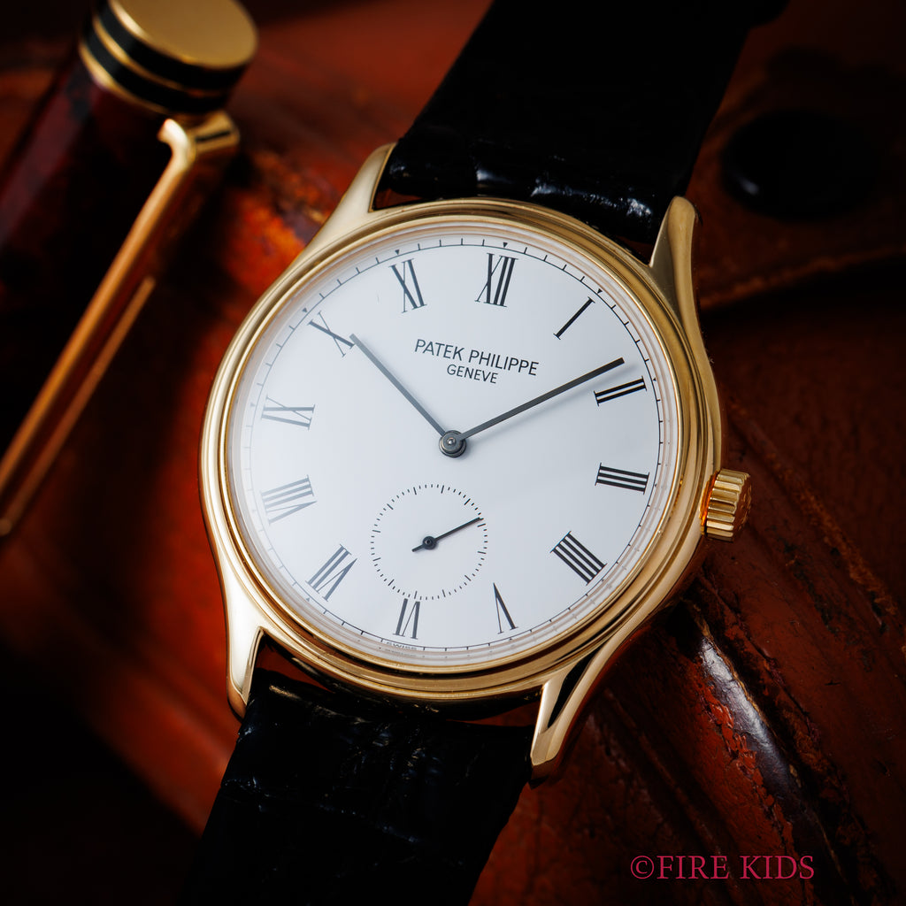 パテック・フィリップ カラトラバ 1991年製 Ref.3923 Cal.215 純正尾錠付きです。ホワイトローマンダイヤルにスモセコ仕様のエレガントかつクラシカルな雰囲気です。ホワイトローマンダイヤルは中々レアです。シミ等無く綺麗です。ケースは小傷程度です。やや丸みがありますが元々の仕様です。手巻きの名機Cal.215を搭載し、手巻きや針回しはスムーズです。純正クロコダイル革ベルトに純正18金尾錠を合わせています。アーカイブが付属します。こちらは分解掃除済みです。
