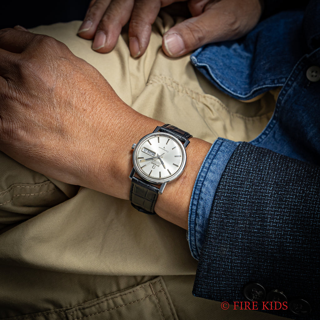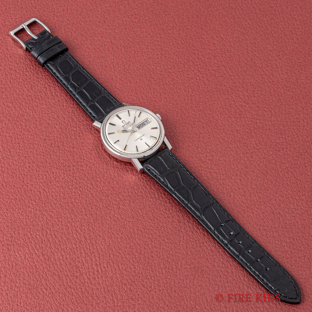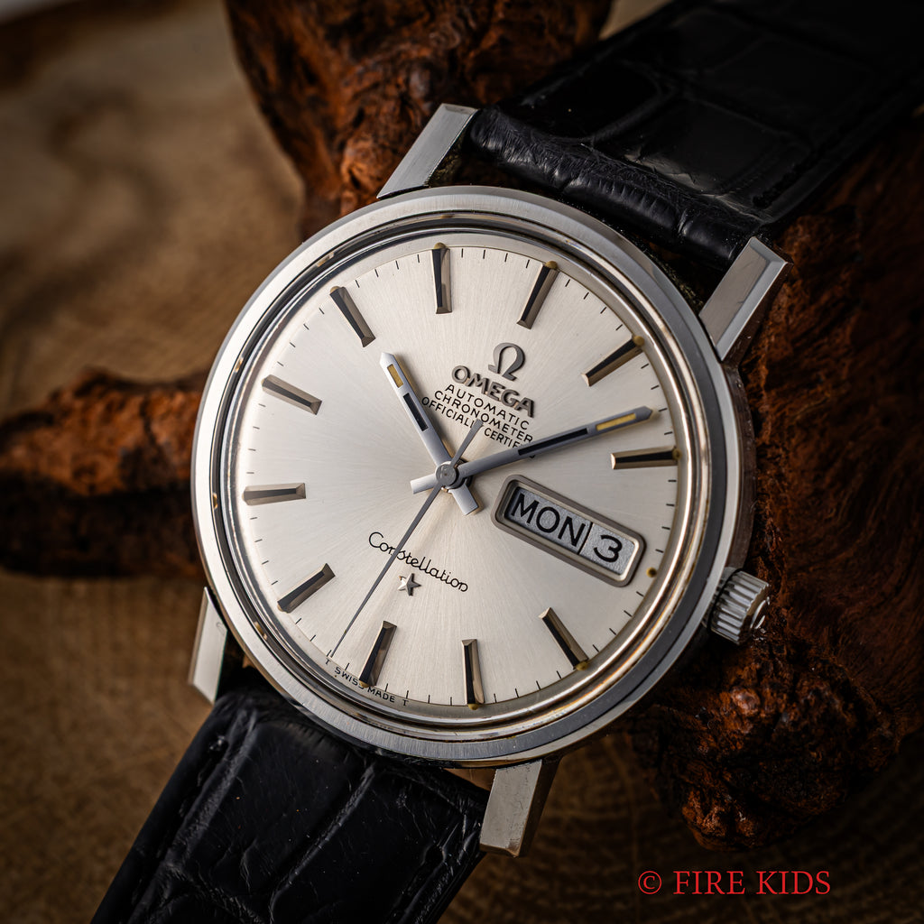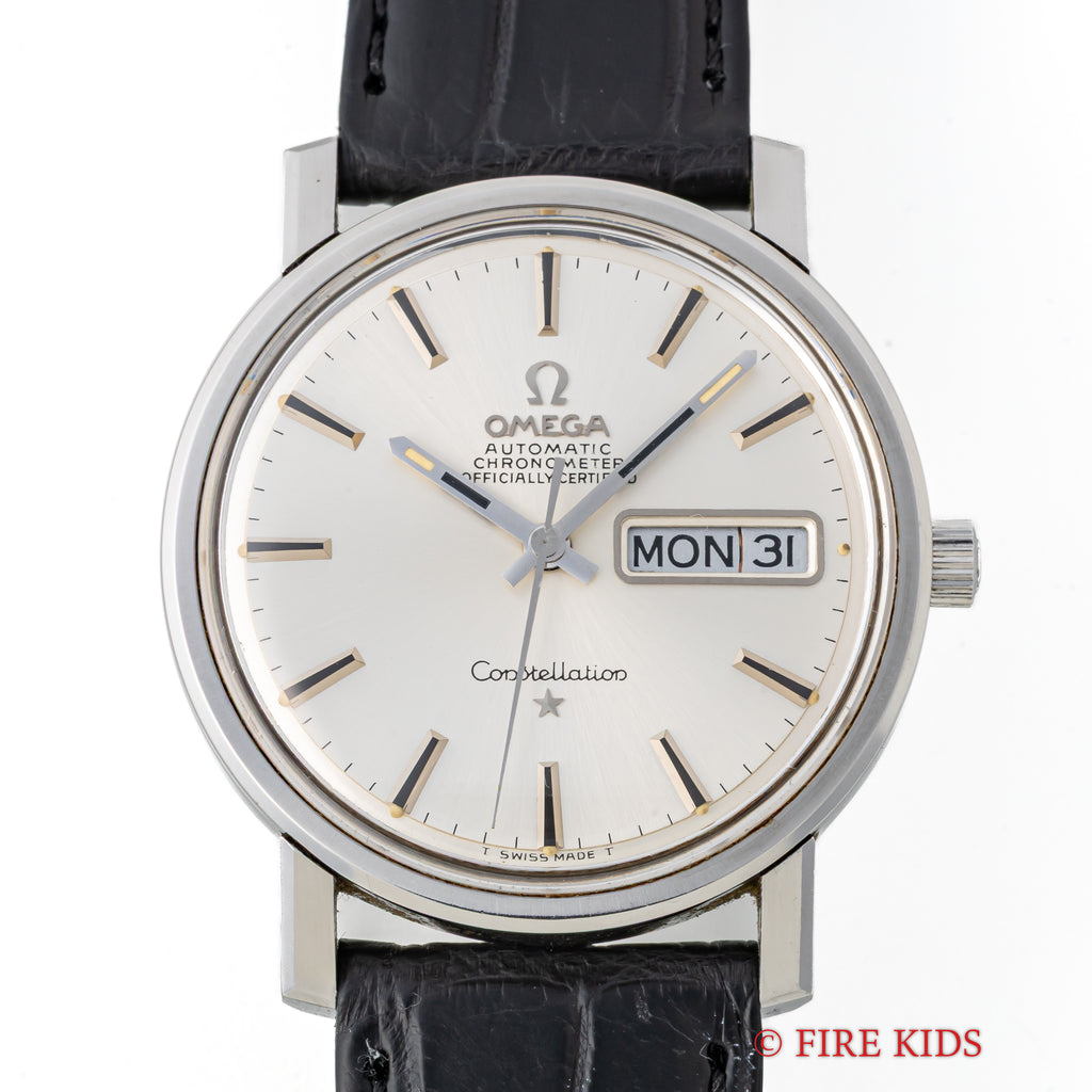 オメガ コンステレーション 1969年製 クロノメーター自動巻 Cal.751 Ref.168.016 デイデイトの入荷いたしました。オメガの高級ラインのコンステレーションデイデイトは自動巻きクロノメーター仕様になっています。シンプルなラウンドケースに星のマークがワンポイントになります。文字盤は表面のシミ等無く綺麗です。ケースは小傷が見られますが大きなダメージはありません。ムーブメントはロービートクロノメーター自動巻きCal.751を搭載しています。手巻きや針回しの操作はスムースです。革ベルトはベルトはファイアーキッズオリジナルのクロコダイル革ベルトが取り付けられています。