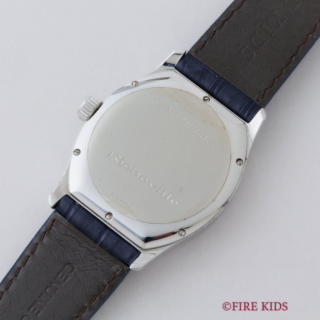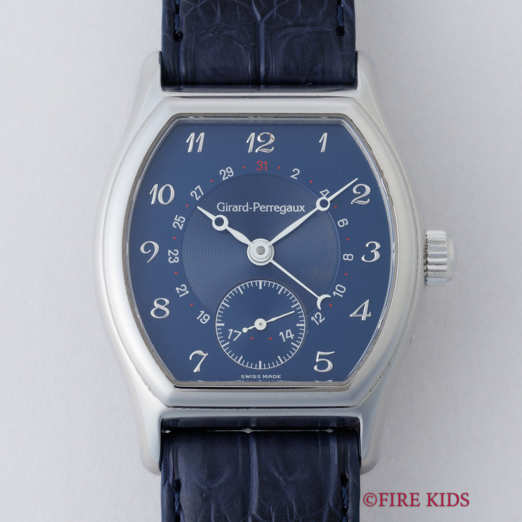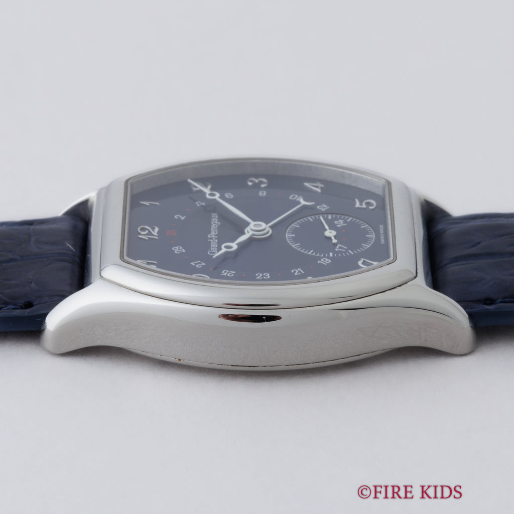 1990年代製のジラールペルゴ「リシュビル」Ref.2730 ポインターデイトモデルが入荷しました。ジラールペルゴは時計メーカーの中でもかなりの老舗メーカーで1791年創業です。トノー型のケースにダイヤルはブルー色で、ブレゲインデックス、ブレゲ針の組み合わせはクラシカルな印象を演出してます。ダイヤル、ケースともに多少の経年や小傷こそあるものの大きなダメージはありません。4時位置のボタンでポインターデイトを操作可能です。ファイアーキッズオリジナルクロコダイル革ベルトに純正尾錠が取り付けられています。