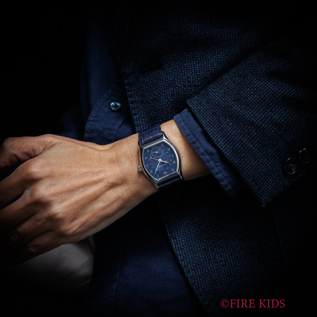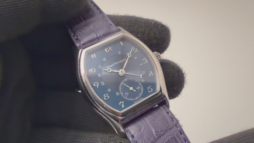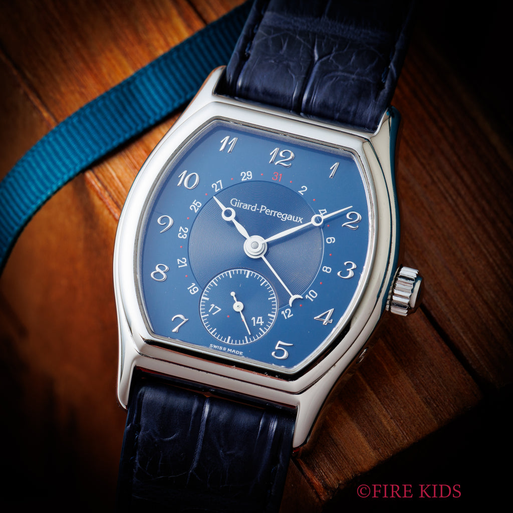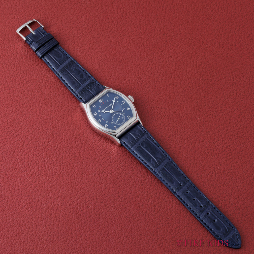 1990年代製のジラールペルゴ「リシュビル」Ref.2730 ポインターデイトモデルが入荷しました。ジラールペルゴは時計メーカーの中でもかなりの老舗メーカーで1791年創業です。トノー型のケースにダイヤルはブルー色で、ブレゲインデックス、ブレゲ針の組み合わせはクラシカルな印象を演出してます。ダイヤル、ケースともに多少の経年や小傷こそあるものの大きなダメージはありません。4時位置のボタンでポインターデイトを操作可能です。ファイアーキッズオリジナルクロコダイル革ベルトに純正尾錠が取り付けられています。