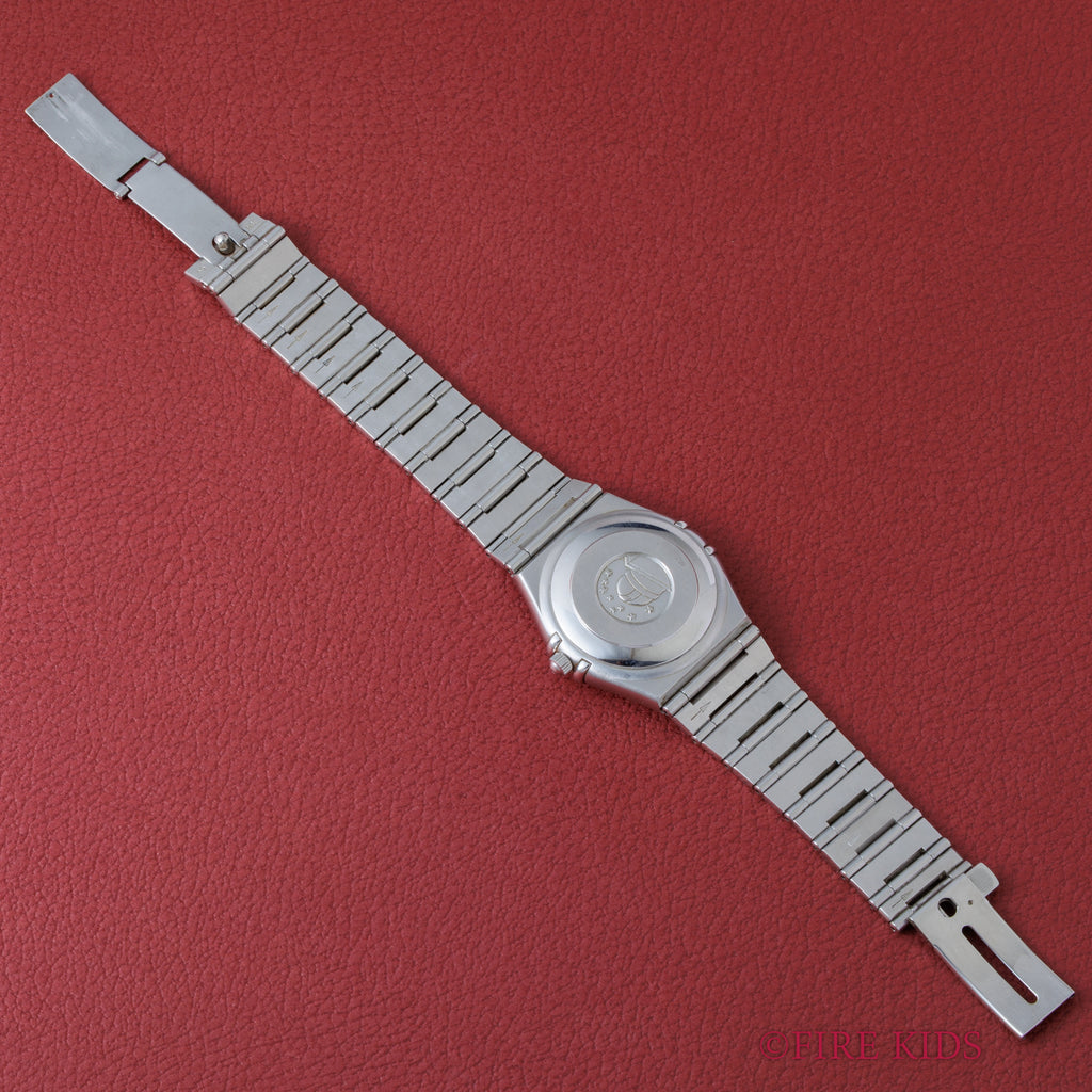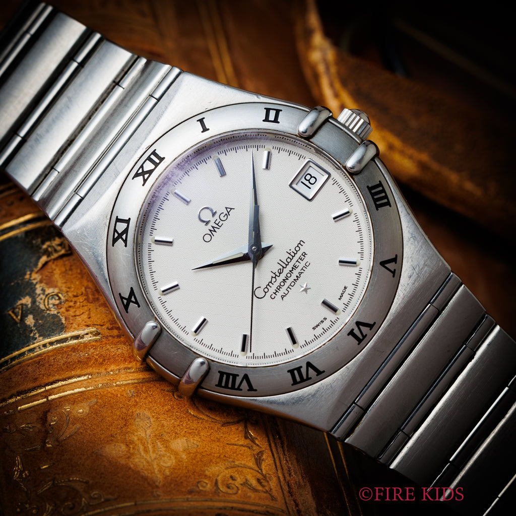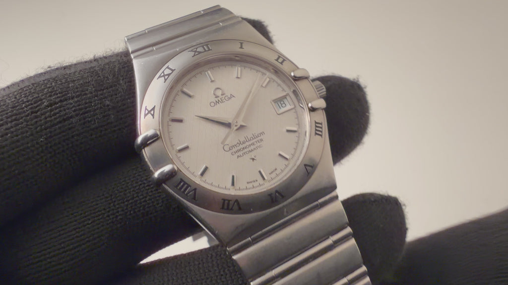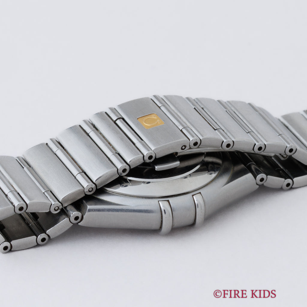 オメガ コンステレーション 1999年製 ブルーダイヤル  自動巻クロノメーター インテグレートブレス の入荷になります。コンステレーションは時代によって様々なデザインがありますが、こちらはケースとブレスが一体化した統一感の有るマンハッタンと呼ばれているモデルです。ホワイトのダイヤルがお洒落で厚みを抑えたデザインが秀逸です。クロノメーターの自動巻きを搭載しています。ケース、ブレスは細かなキズが見られますが大きなダメージはありません。手巻きや針回しの操作はスムースです。