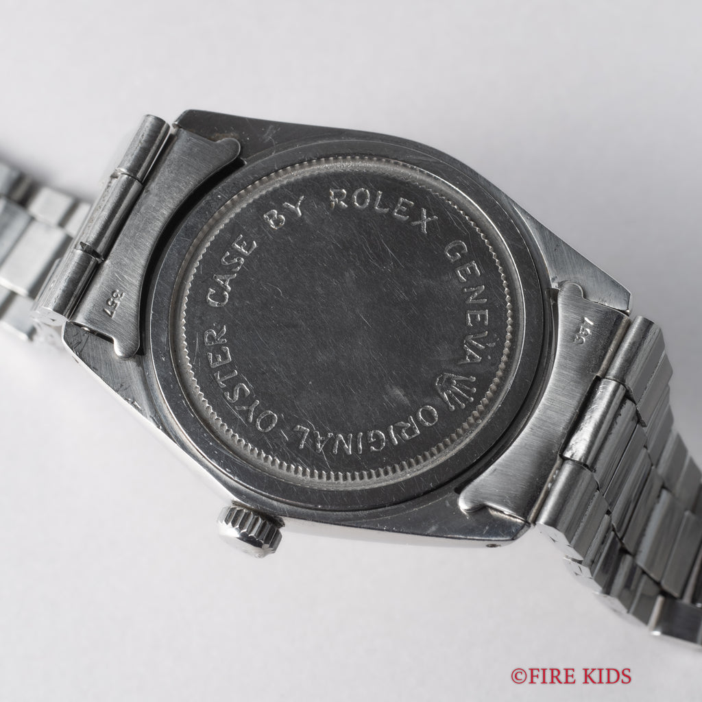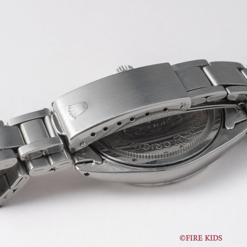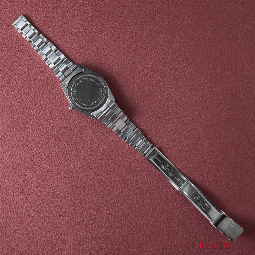 1965年製のチューダー オイスターデイト Ref.7962 オリジナルダイヤル ROLEXブレス付きです。オリジナルダイヤルは経年による変色が全体的に表れ良いヴィンテージの雰囲気です。王冠リューズも魅力的で、裏蓋には「ORIGINAL OYSTER CASE BY ROLEX GENEVA」の刻印があります。手巻きや針回し、リューズのねじ込みの操作はスムースです。ロレックス純正巻きブレス付きです。