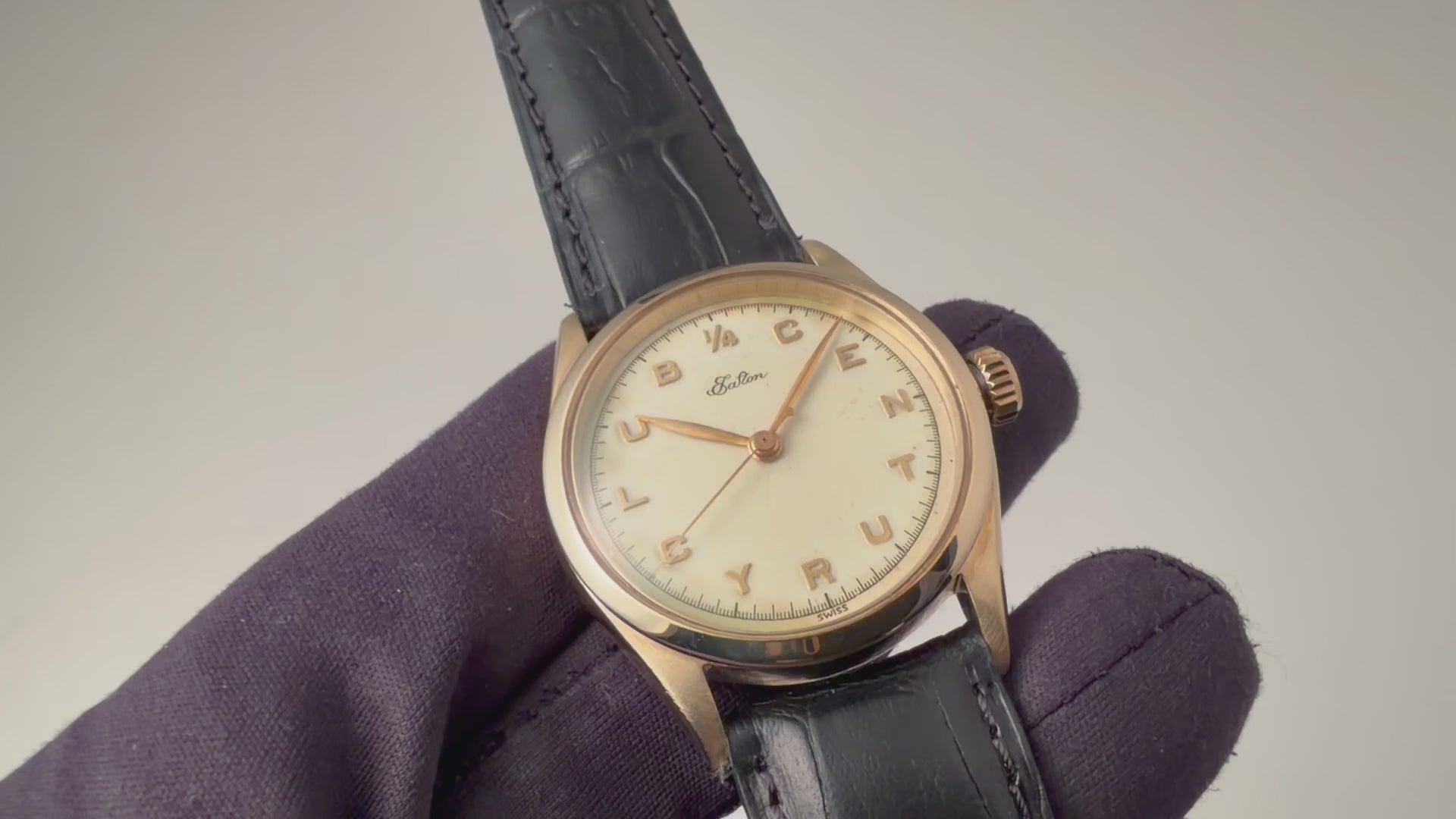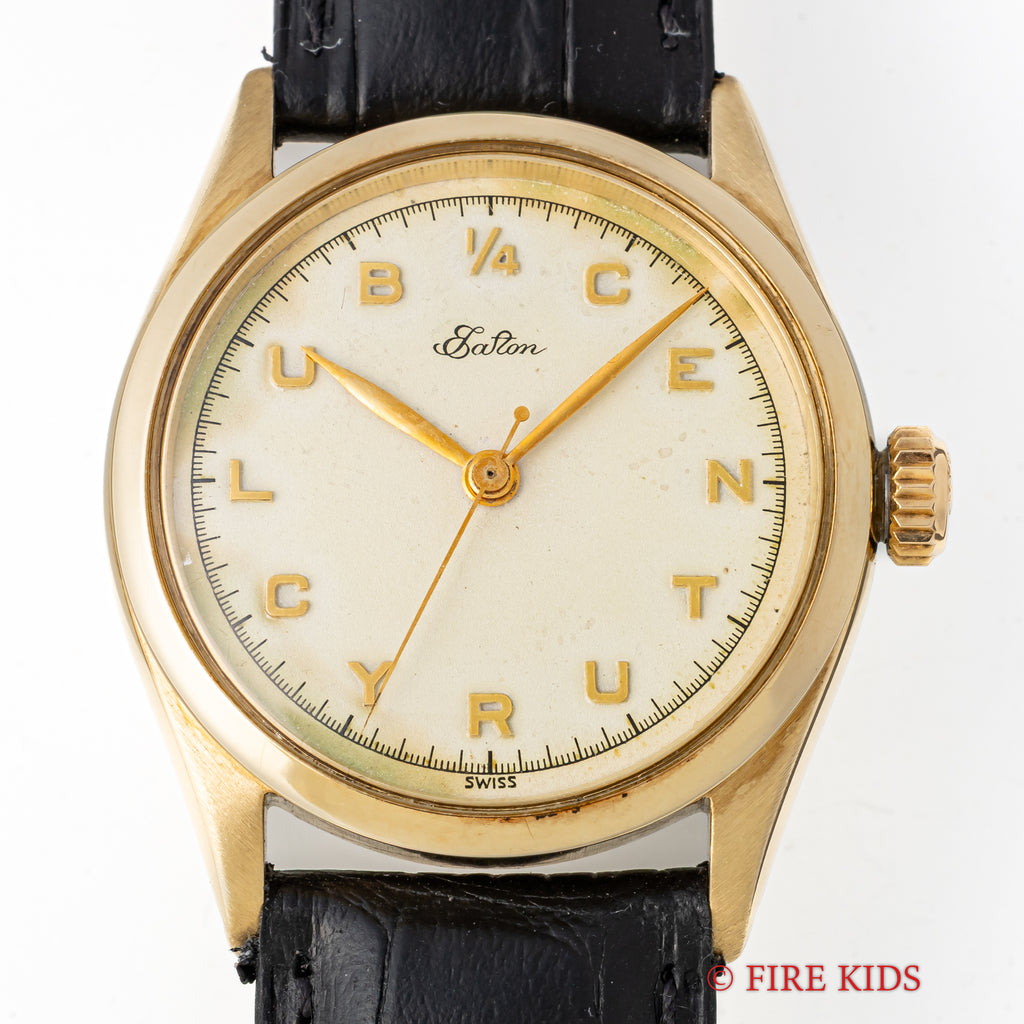 ロレックス 14金無垢クォーターセンチュリー 1953年製 イートン25周年勤続記念の入荷になります。カナダの百貨店EATONの25年勤続記念品として従業員に配られた特別オーダー品のロレックスです。文字盤にEatonの文字と1/4CENTURYCLUBのアップライトインデックスが入っています。文字盤は表面の変色が見られますが雰囲気良くなっています。ケースは小傷が見られますが大きなダメージはありません。手巻きや針回しの操作はスムースです。リューズは後年の純正王冠リューズになっています。ベルトは社外の革ベルトが取り付けされています。