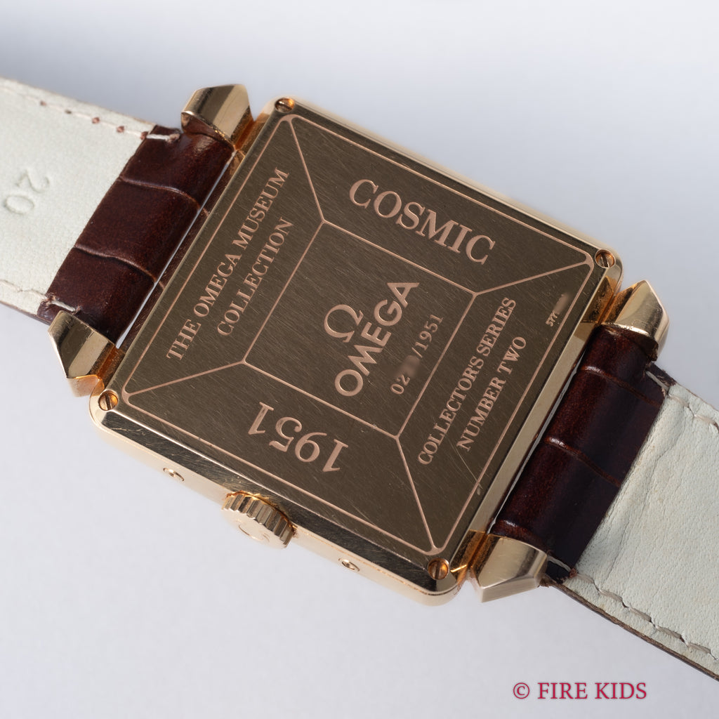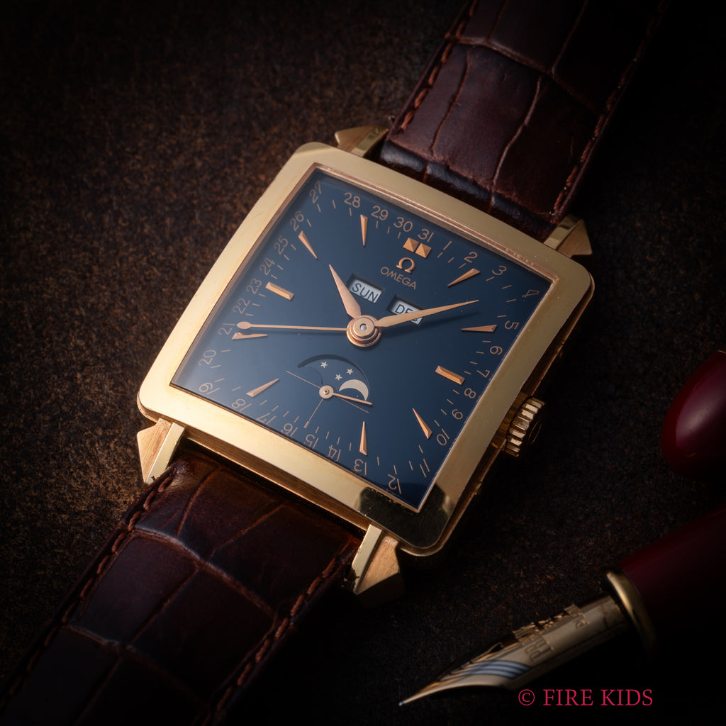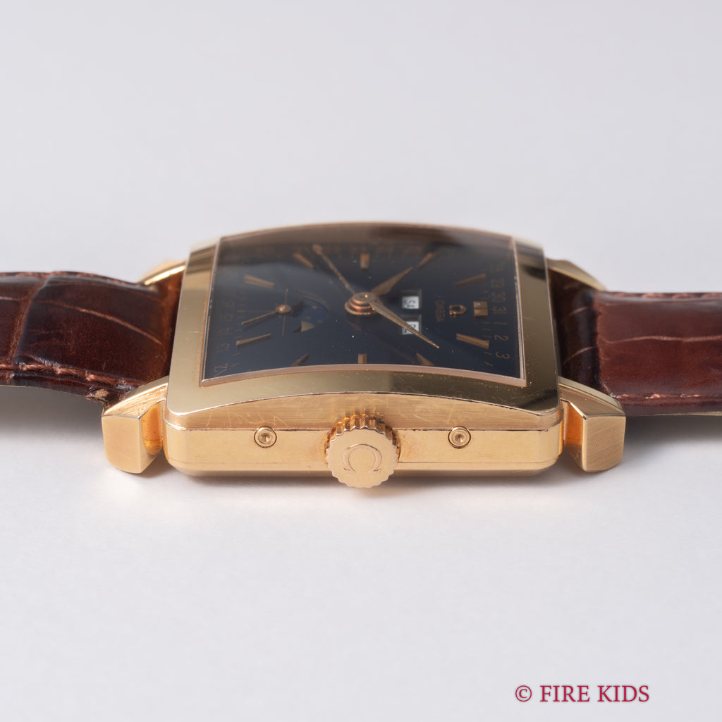 オメガ コスミック ミュージアムトリプルカレンダームーンフェイズ 2002年製 1951本限定 18KYGが入荷しました。オメガ博物館所蔵の名作モデルを毎年1年復刻するミュージアムコレクションの中で、こちらは2002年に発売された1951本限定の『ミュージアムコレクション1951 コスミック』。1951年製のコスミックを再現したトリプルカレンダームーンフェイズモデルです。18金ピンクゴールドの角型ケースに夜空のような深いネイビーの文字盤が印象的です。月と曜日、ムーンフェイズ、ポインターデイドなど多機能でクラシカルな見た目ながらも異彩を放つ1本です。巻き上げと針回し共にスムーズです。