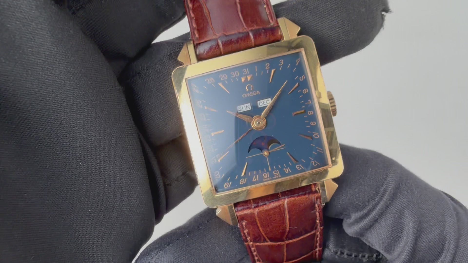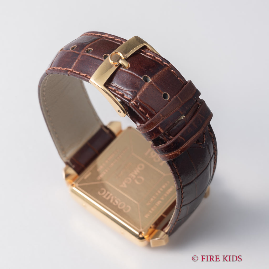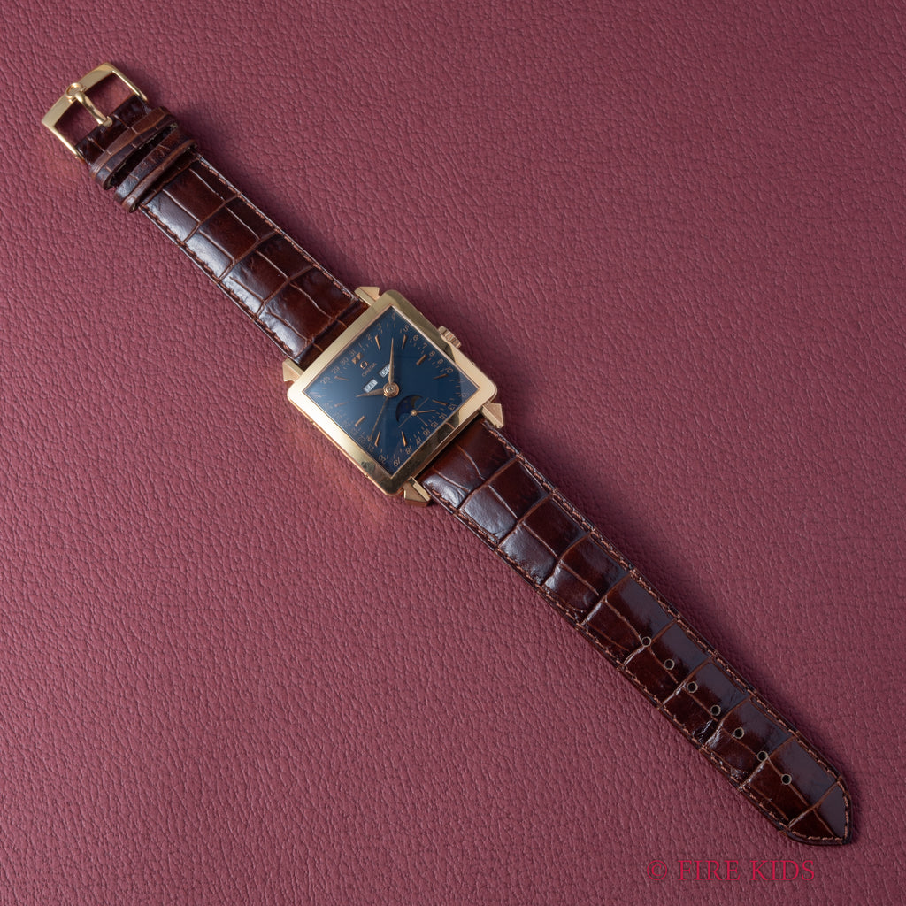 オメガ コスミック ミュージアムトリプルカレンダームーンフェイズ 2002年製 1951本限定 18KYGが入荷しました。オメガ博物館所蔵の名作モデルを毎年1年復刻するミュージアムコレクションの中で、こちらは2002年に発売された1951本限定の『ミュージアムコレクション1951 コスミック』。1951年製のコスミックを再現したトリプルカレンダームーンフェイズモデルです。18金ピンクゴールドの角型ケースに夜空のような深いネイビーの文字盤が印象的です。月と曜日、ムーンフェイズ、ポインターデイドなど多機能でクラシカルな見た目ながらも異彩を放つ1本です。巻き上げと針回し共にスムーズです。