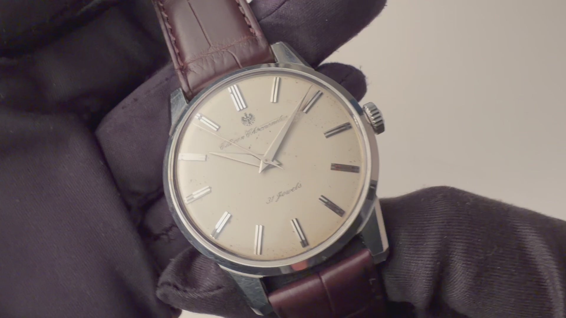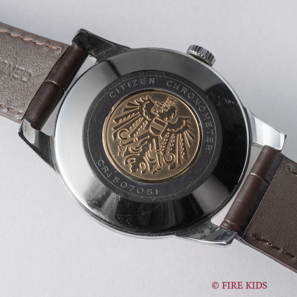国産腕時計最高峰の一つと言われているシチズンの名機「クロノメーターCR1507051」このモデルが登場した1962年製です。1962年から1966年までの約4年間のみ製造されたモデルで、採算を度外視して造られた為に短命になったと言われています。人気のステンレスケースで非常に美しい外観と精度を重視した大型ムーブメントは惚れ惚れとします。文字盤は年代相応の経年変化はありますが、メダリオンは綺麗に残っています。ケースは小傷はあるものの大きなダメージや腐食は見られません。ベルトはファイアーキッズオリジナル革ベルトが取り付けてあります。手巻きや針回しの操作はスムーズです。