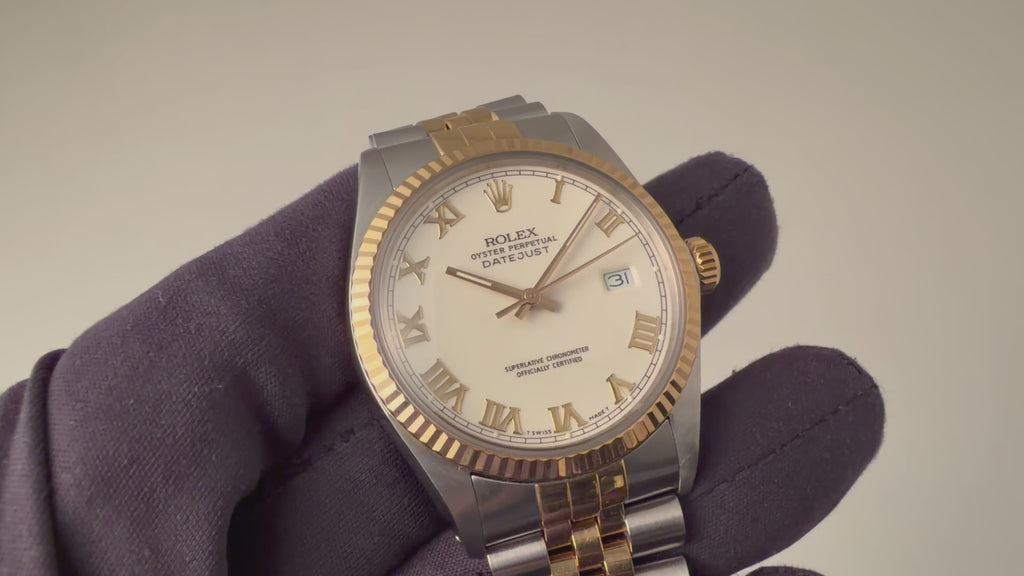 ロレックス 1986年製 デイトジャスト アイボリーローマンダイヤル Ref.16013 純正コンビジュビリーブレスの入荷になります。ケースはイエローゴールドとステンレスのコンビモデルでアイボリーカラーのダイヤルに人気のローマンインデックスで上品な印象です。元々はホワイトローマンダイヤルだったものが経年変化によりアイボリーに変色したとても珍しい文字盤になっています。風防はドーム風防が取り付けられています。機械は完成度の高いCal.3035を搭載しております。手巻きや針回し、ねじ込みリューズの操作はスムースです。ベルトは純正コンビジュビリーが取り付けてあります。