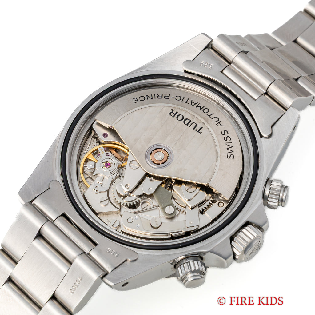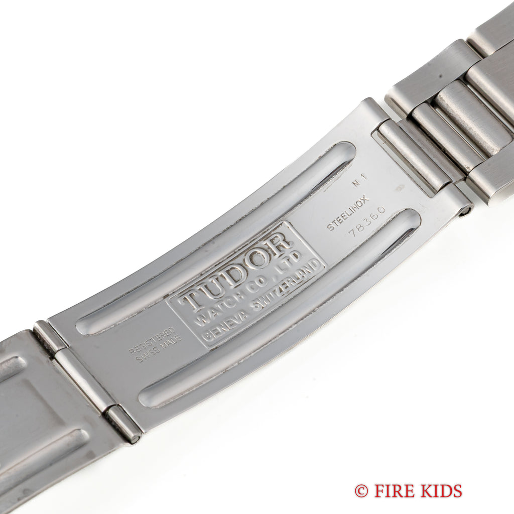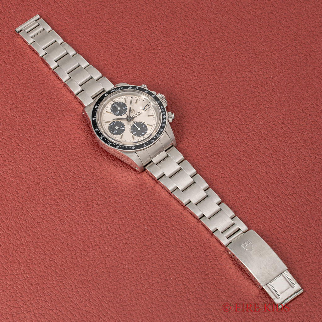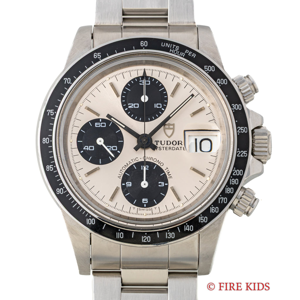 TUDORのクロノタイム Ref.79160シルバー 1989年製です。前期型の枠有のカレンダーが付くダイヤルは夜光の欠落は無く、インダイヤルも含めてダメージはございません。カマボコケースとも呼ばれる厚みのあるケースは、打痕キズが付きやすいですが、こちらは小傷はあるものの、しっかりとして非常に良いコンディションです。ダメージの出やすいベゼルディスクも、良いコンディションです。ムーブメントはCal.7750を搭載しており、巻き上げもクロノファンクションもスムーズです。ブレスレットは伸びの少ないハードブレス(78360/FF589)が付いております。こちらは分解掃除済みです。
