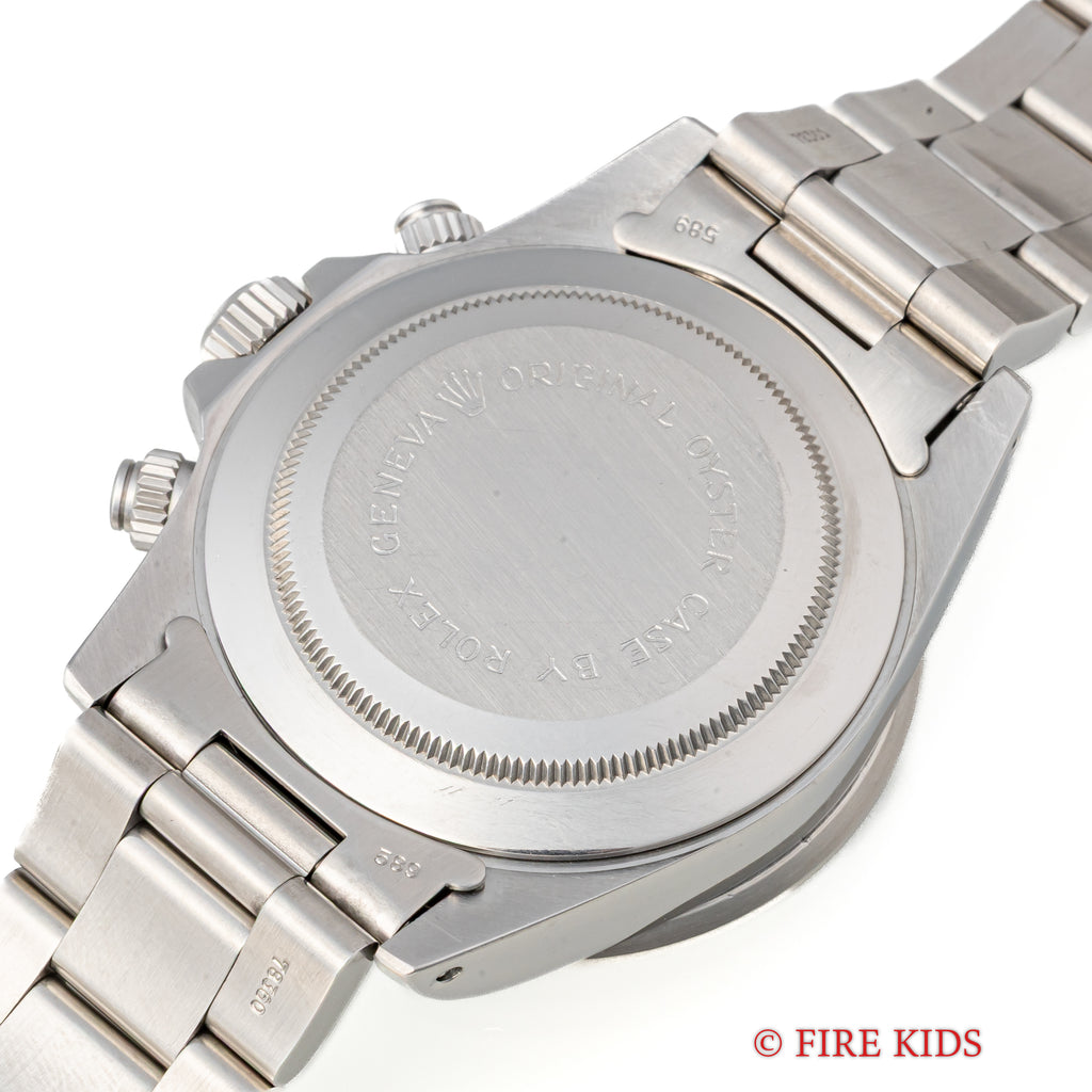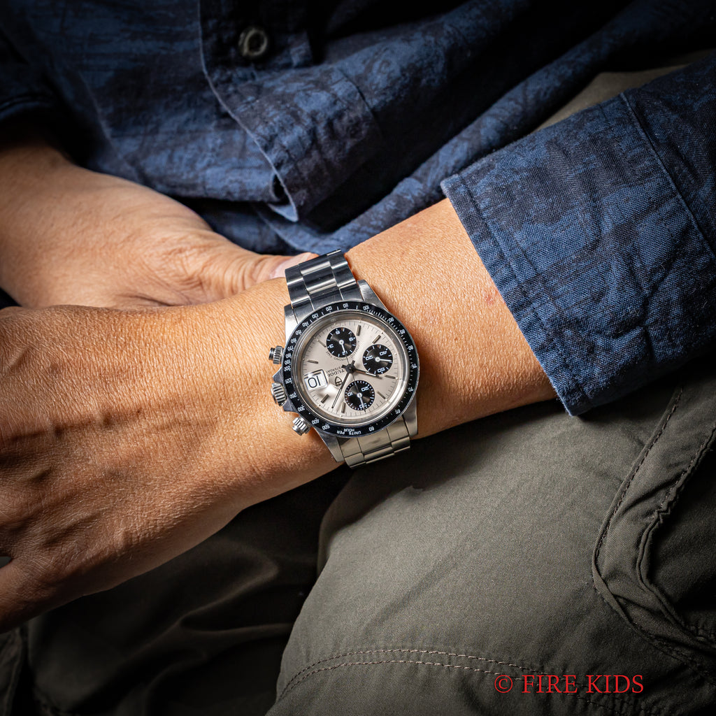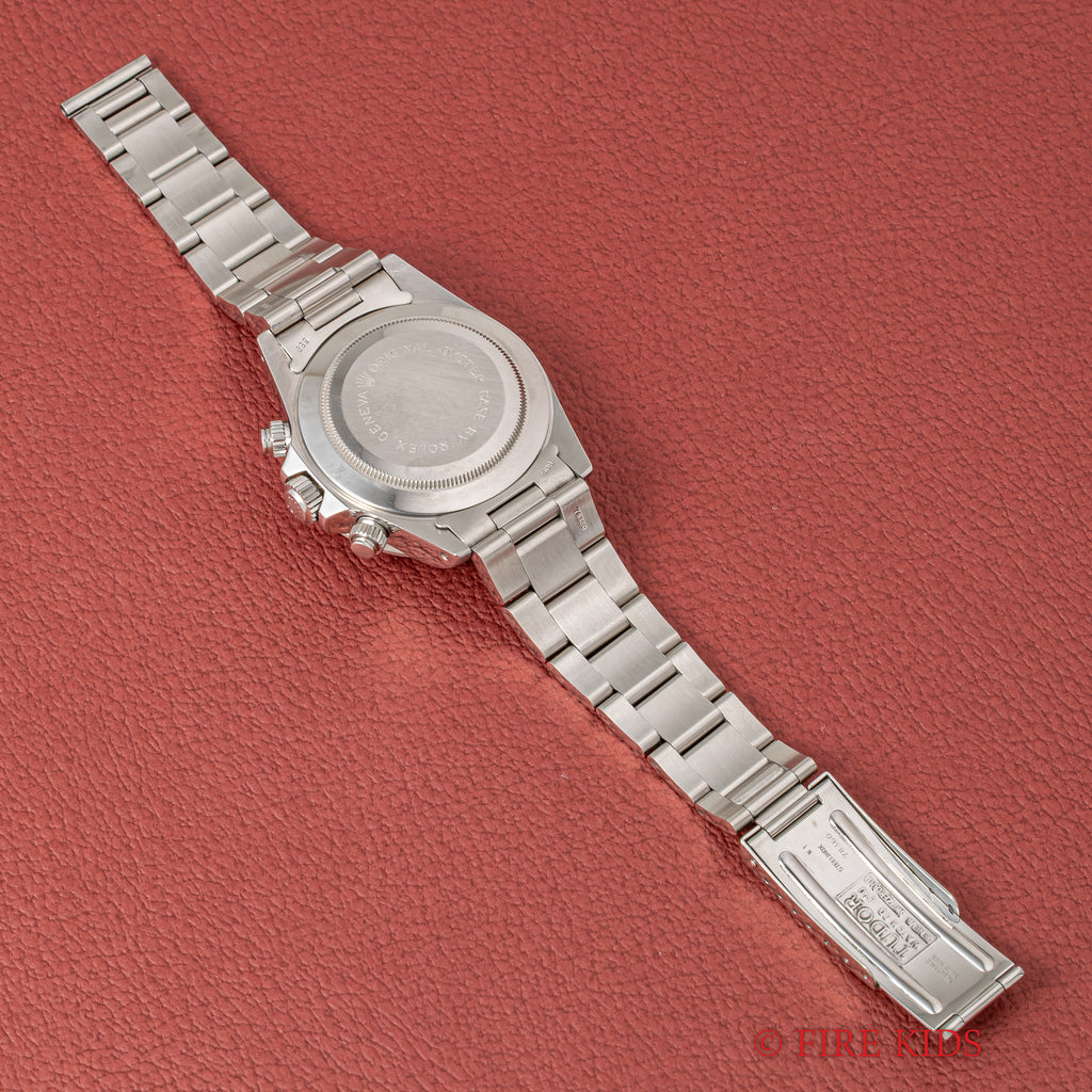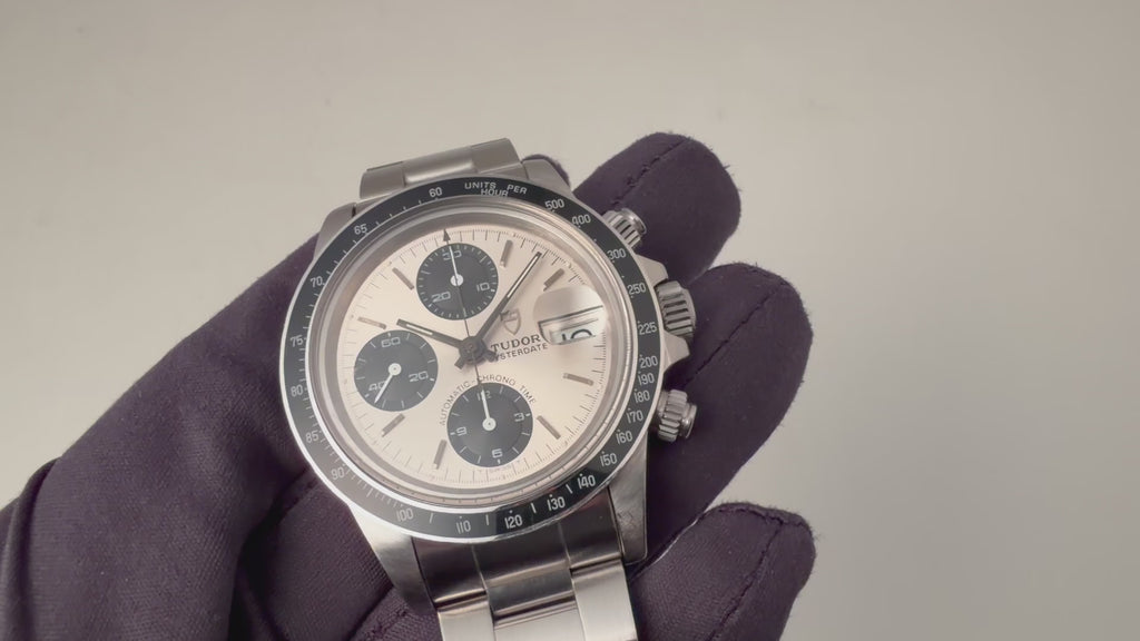 TUDORのクロノタイム Ref.79160シルバー 1989年製です。前期型の枠有のカレンダーが付くダイヤルは夜光の欠落は無く、インダイヤルも含めてダメージはございません。カマボコケースとも呼ばれる厚みのあるケースは、打痕キズが付きやすいですが、こちらは小傷はあるものの、しっかりとして非常に良いコンディションです。ダメージの出やすいベゼルディスクも、良いコンディションです。ムーブメントはCal.7750を搭載しており、巻き上げもクロノファンクションもスムーズです。ブレスレットは伸びの少ないハードブレス(78360/FF589)が付いております。こちらは分解掃除済みです。