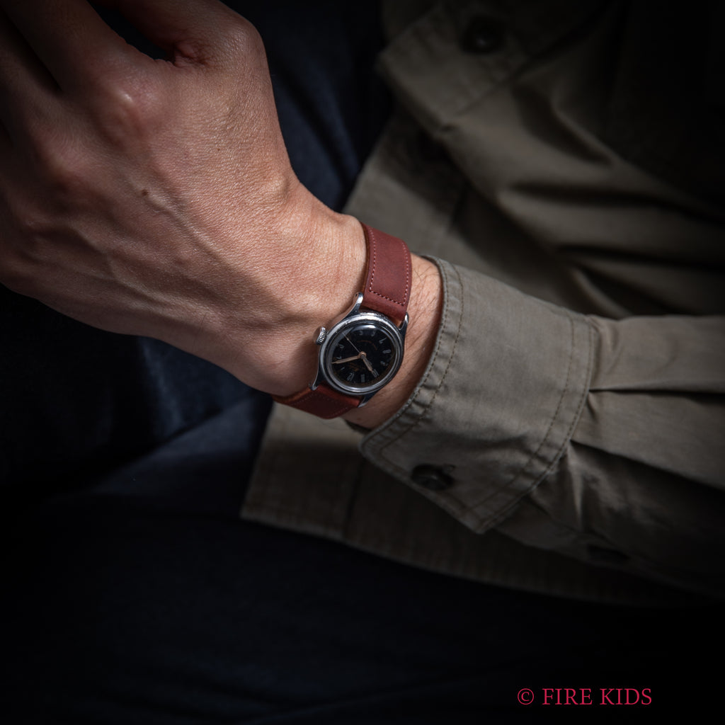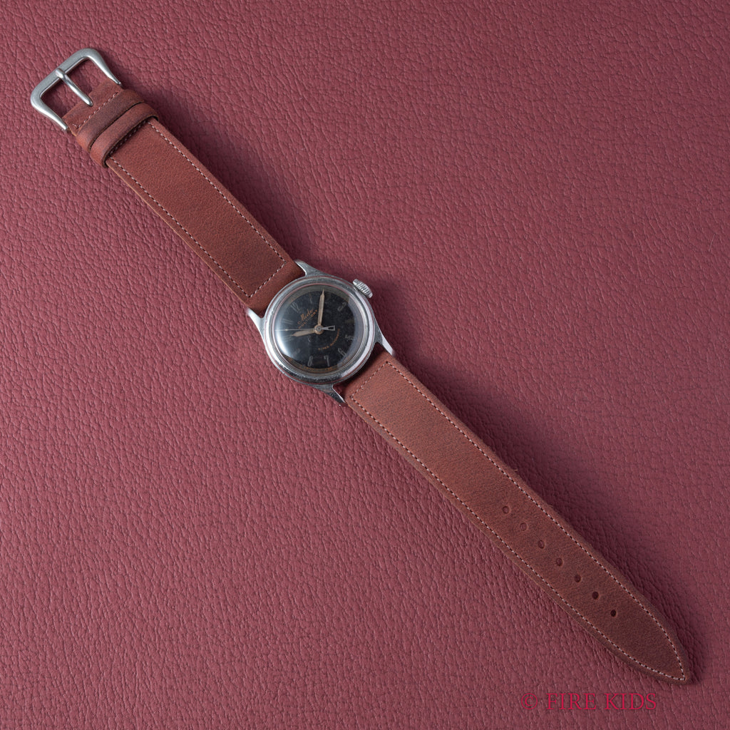 ミドー マルチフォート スーパーオートマチック 1940年代製 Cal.817 バンパー式オートマチックの入荷になります。オリジナルのブラックダイヤルは表面の劣化が見られますがヴィンテージらしい抜群の雰囲気になっています。アラビア数字にはラジウム夜光が入っていますが黒ずんで角度によって見え隠れします。ケースは小傷が見られますが大きなダメージはありません。手巻き機能付きのバンパー式オートマチックで振ると独特のカタカタ音がします。ベルトはヴィンテージと相性の良いアキュレイトフォルムが取り付けされています。