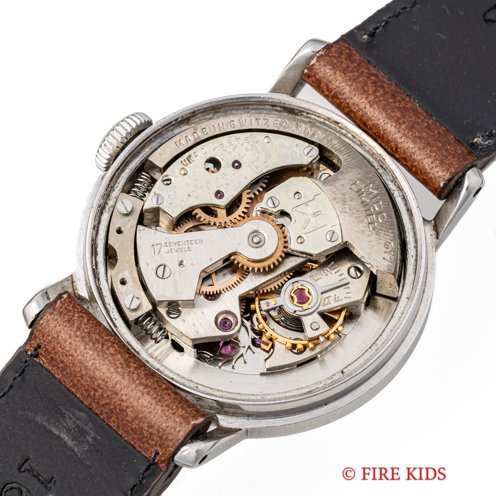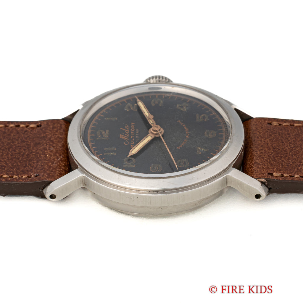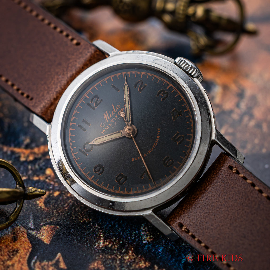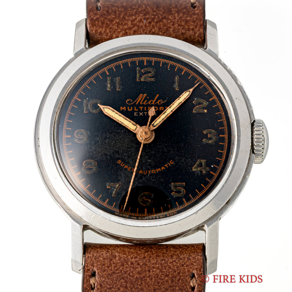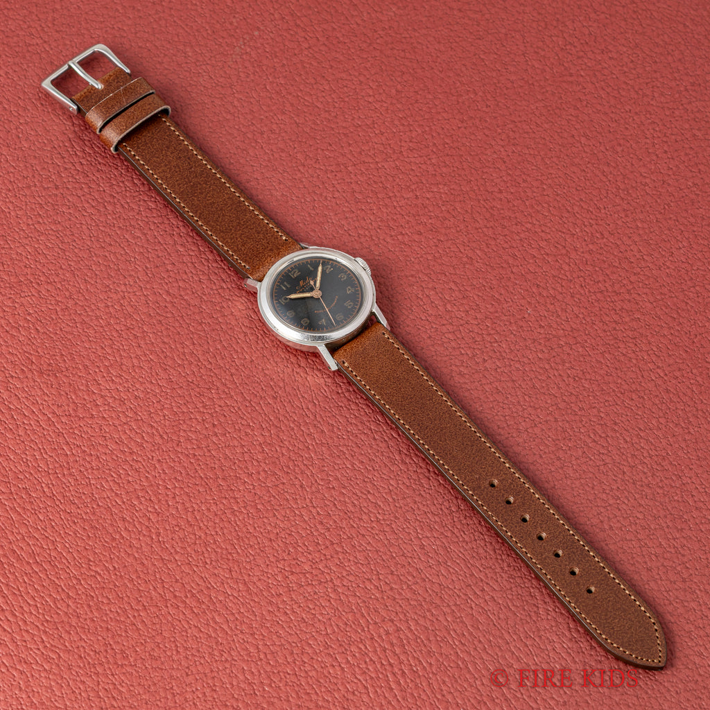 ミドー マルチフォート エクストラ 1940年代製 スーパーオートマチック バンパー式自動巻です。当時としては画期的なバンパー式オートマチックモデルです。ローターがバネに当たる音が心地良いです。文字盤はブラックで、ラジウムのインデックス夜光がブラックアウト化した良い雰囲気です。手巻き機能付きです。ファイアーキッズオリジナルブッテーロカーフレザーを合わせています。こちらは分解掃除済みです。