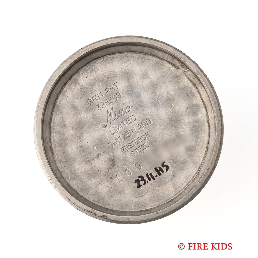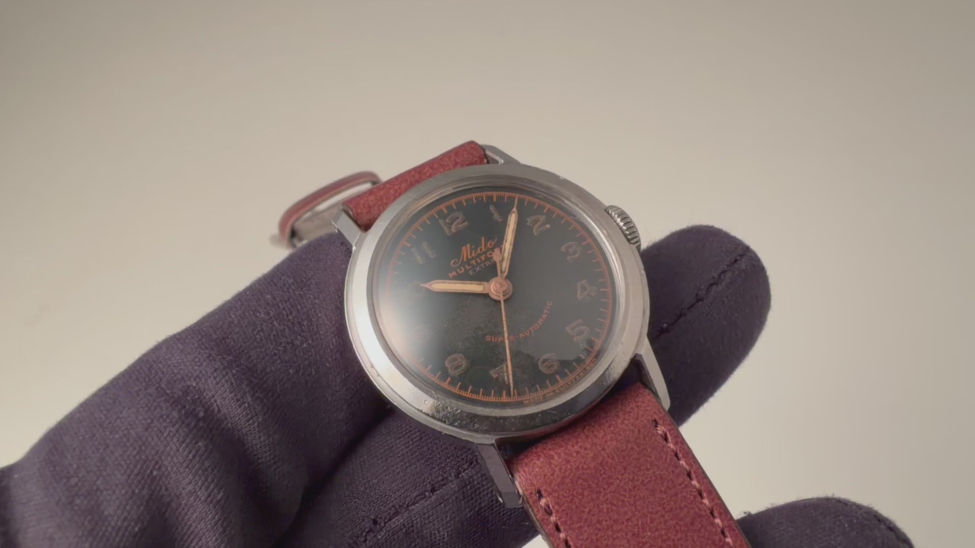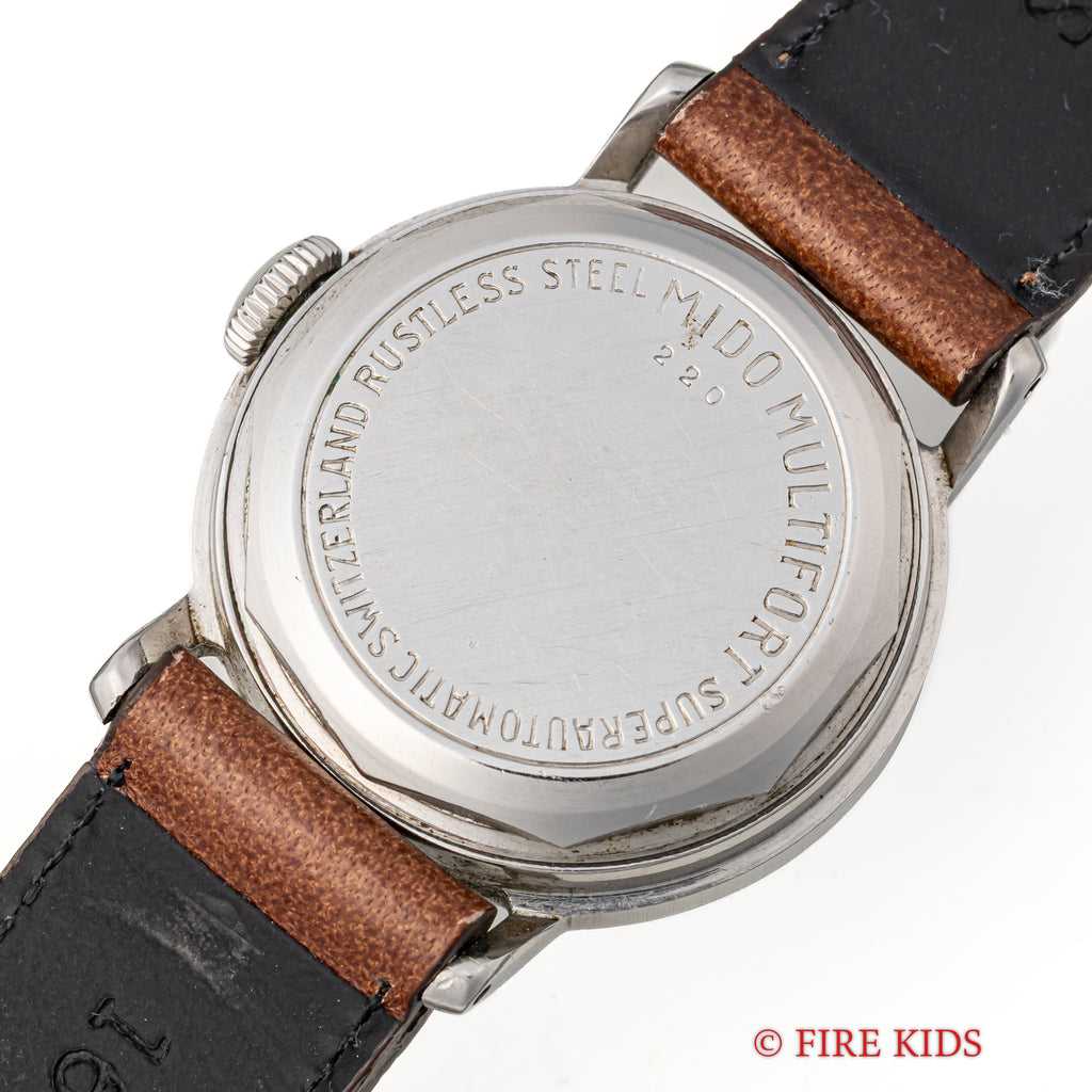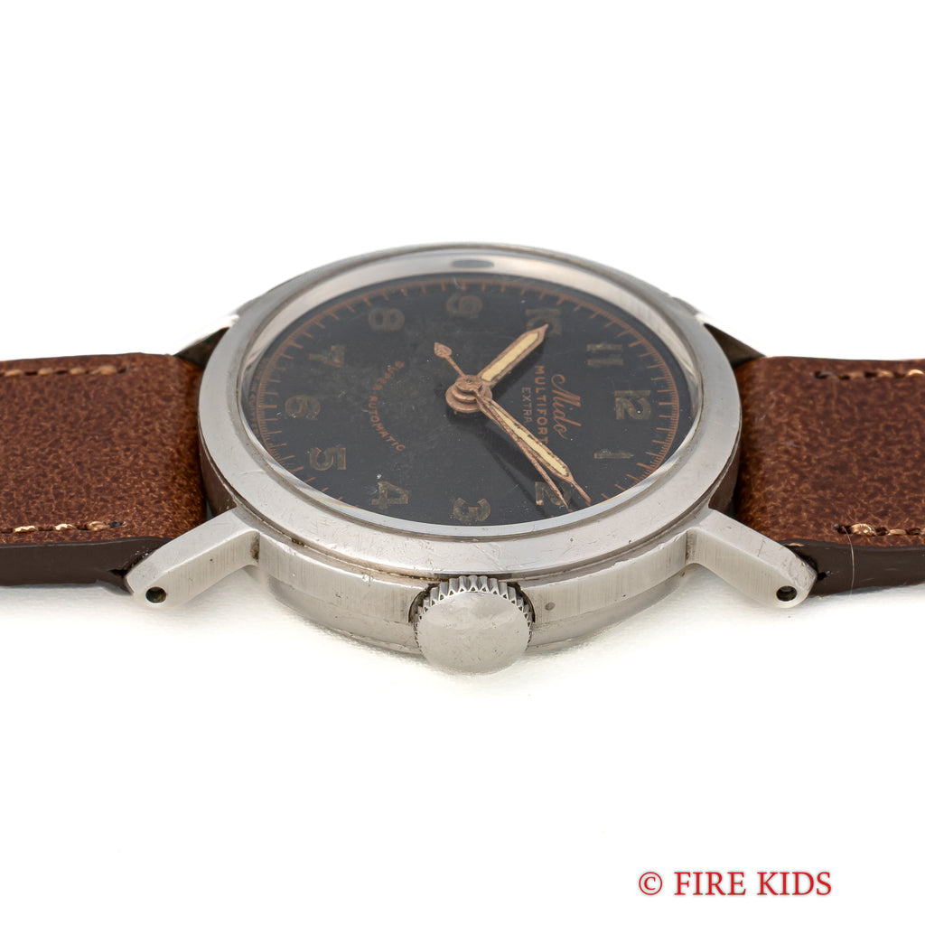 ミドー マルチフォート エクストラ 1940年代製 スーパーオートマチック バンパー式自動巻です。当時としては画期的なバンパー式オートマチックモデルです。ローターがバネに当たる音が心地良いです。文字盤はブラックで、ラジウムのインデックス夜光がブラックアウト化した良い雰囲気です。手巻き機能付きです。ファイアーキッズオリジナルブッテーロカーフレザーを合わせています。こちらは分解掃除済みです。