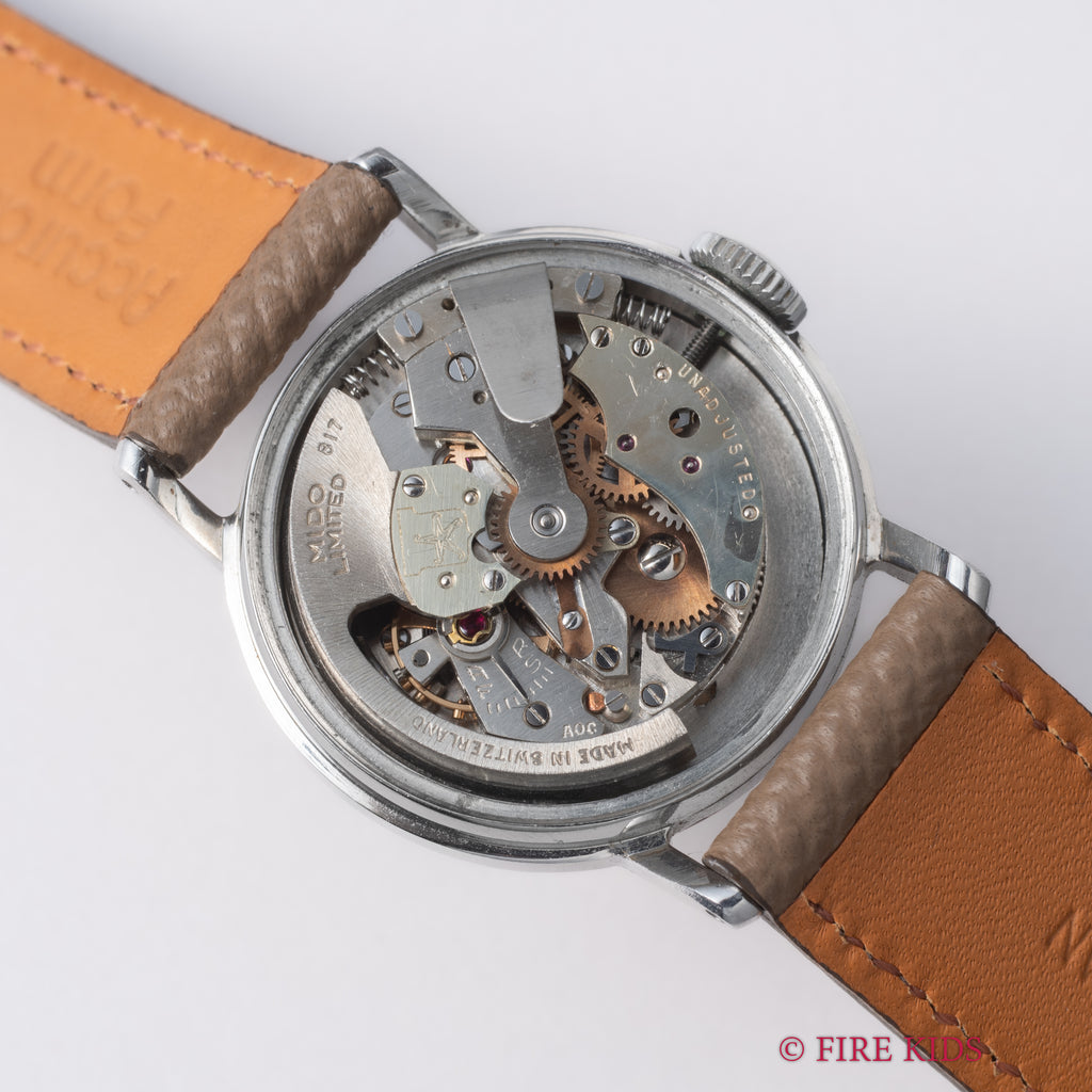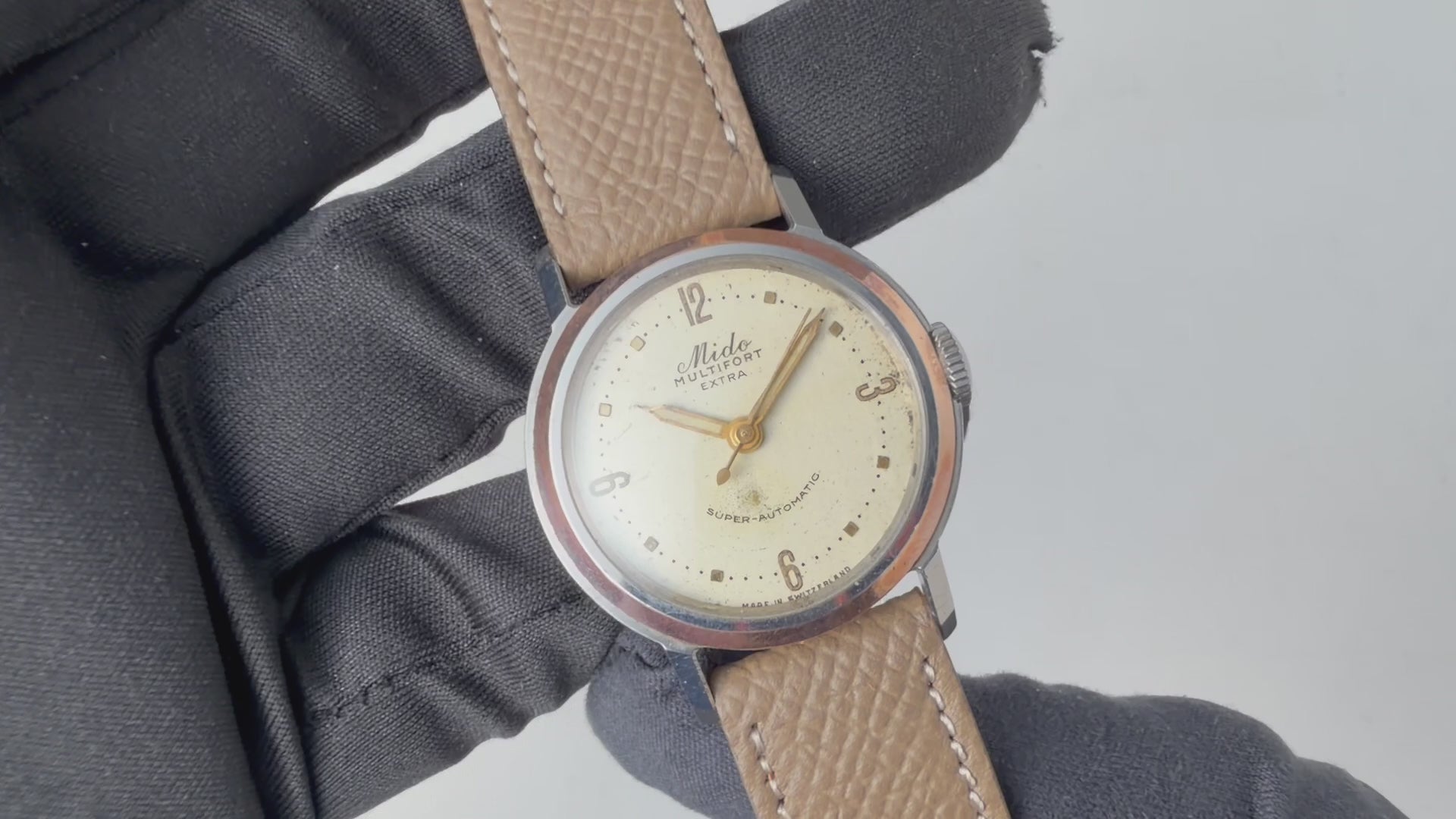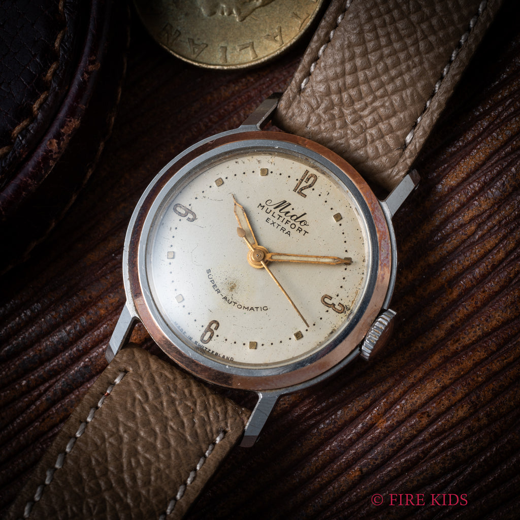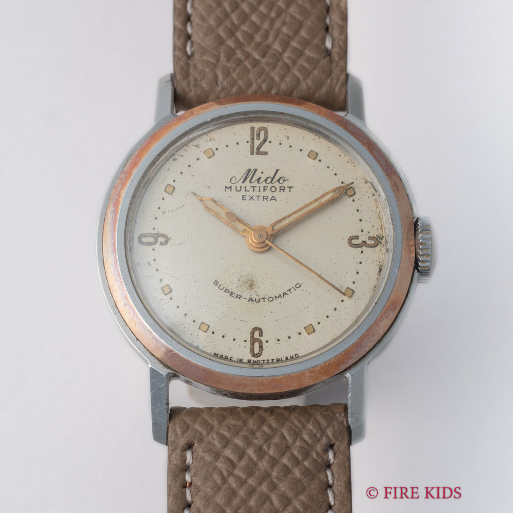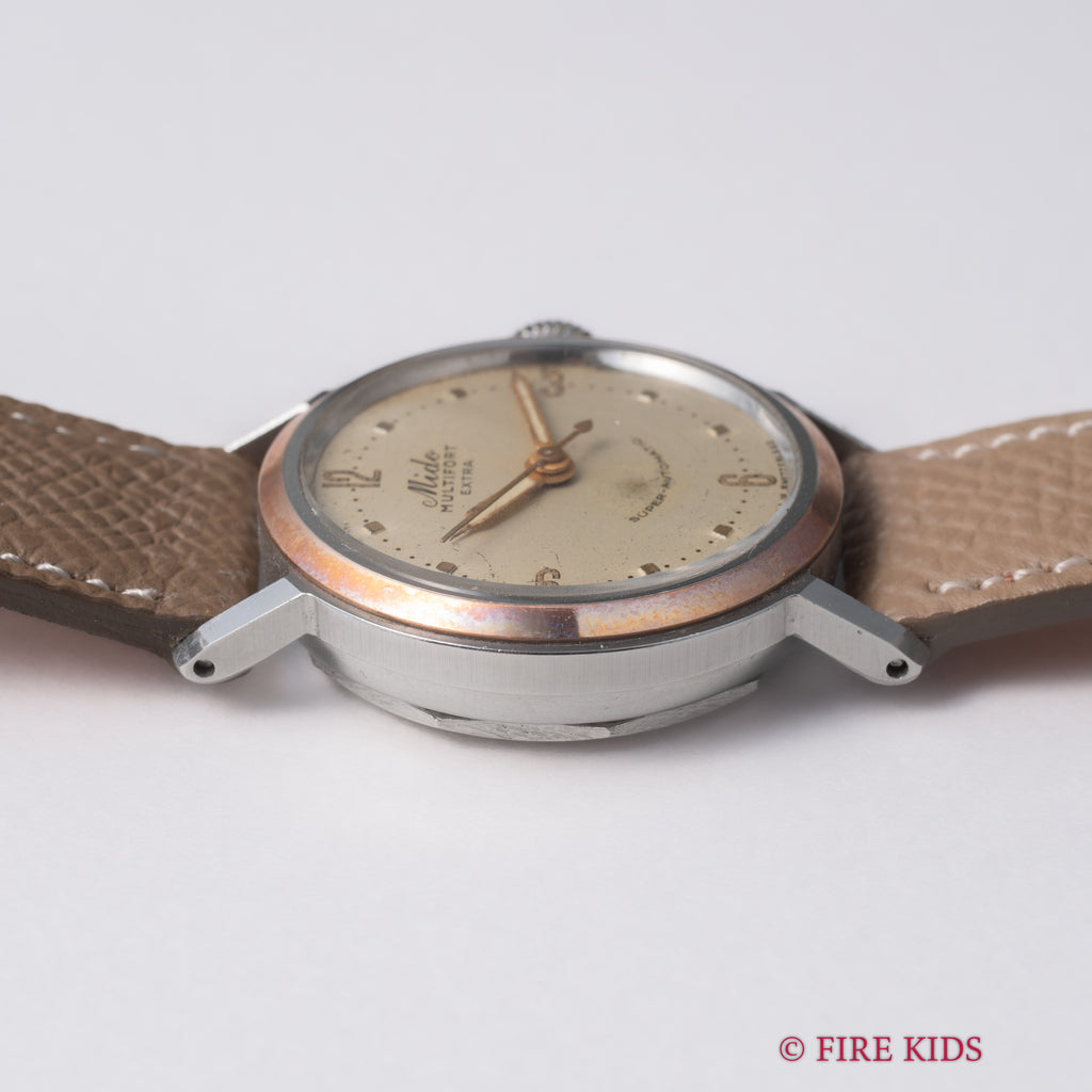 ミドー マルチフォート スーパーオートマチック ピンクゴールドコンビ 1940年代製 センタセコンド自動巻の入荷になります。約30㎜(リューズ別)の小振りなサイズですがピンクゴールドのベゼルが目を惹きます。防水仕様のケースでロレックスのバブルバックの様な印象です。飛びアラビアダイヤルで夜光入りの針と40年代らしい雰囲気です。文字盤は全体的に変色が見られますが良い雰囲気になっています。ケースは小傷が見られますが大きなダメージはありません。手巻きや針回しの操作はスムースです。ムーブメントはバンパー式自動巻になっています。ベルトはヴィンテージと相性の良いアキュレイトフォルムが取り付けされています。