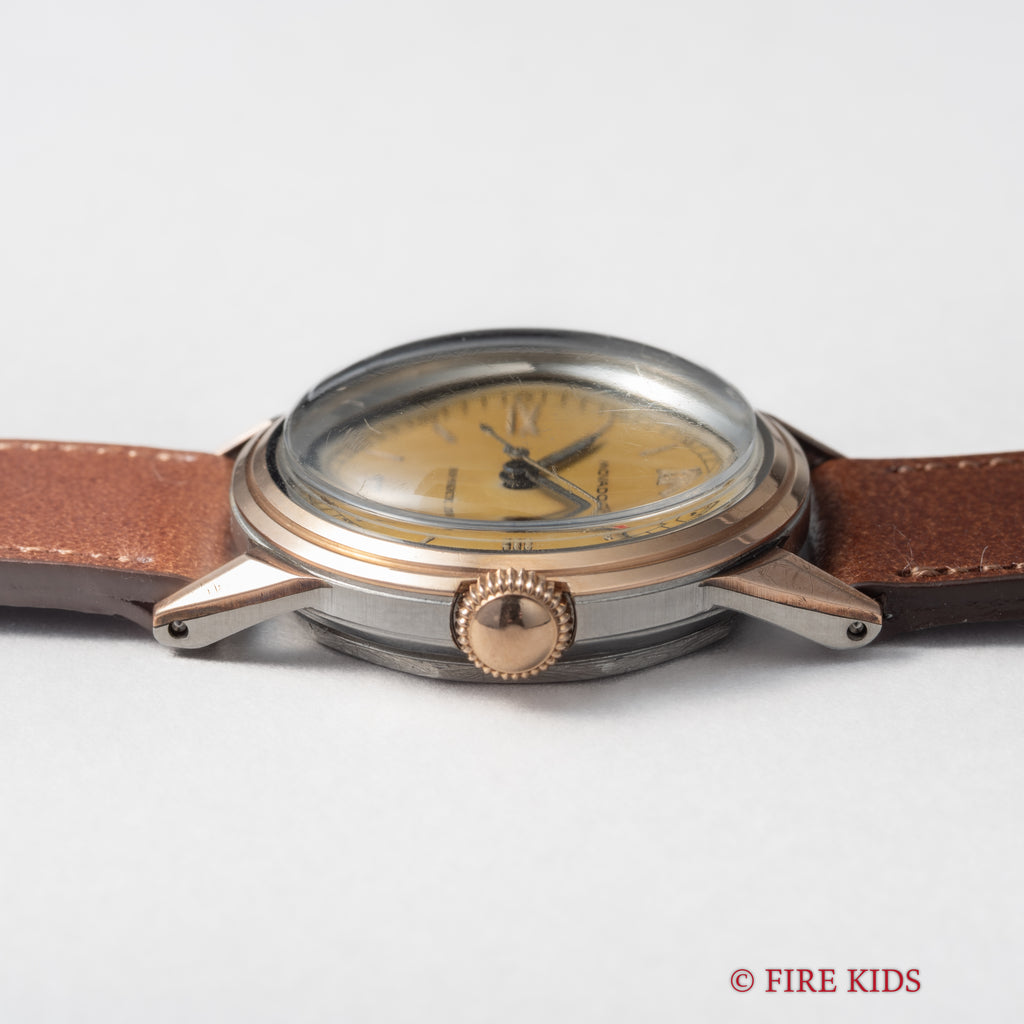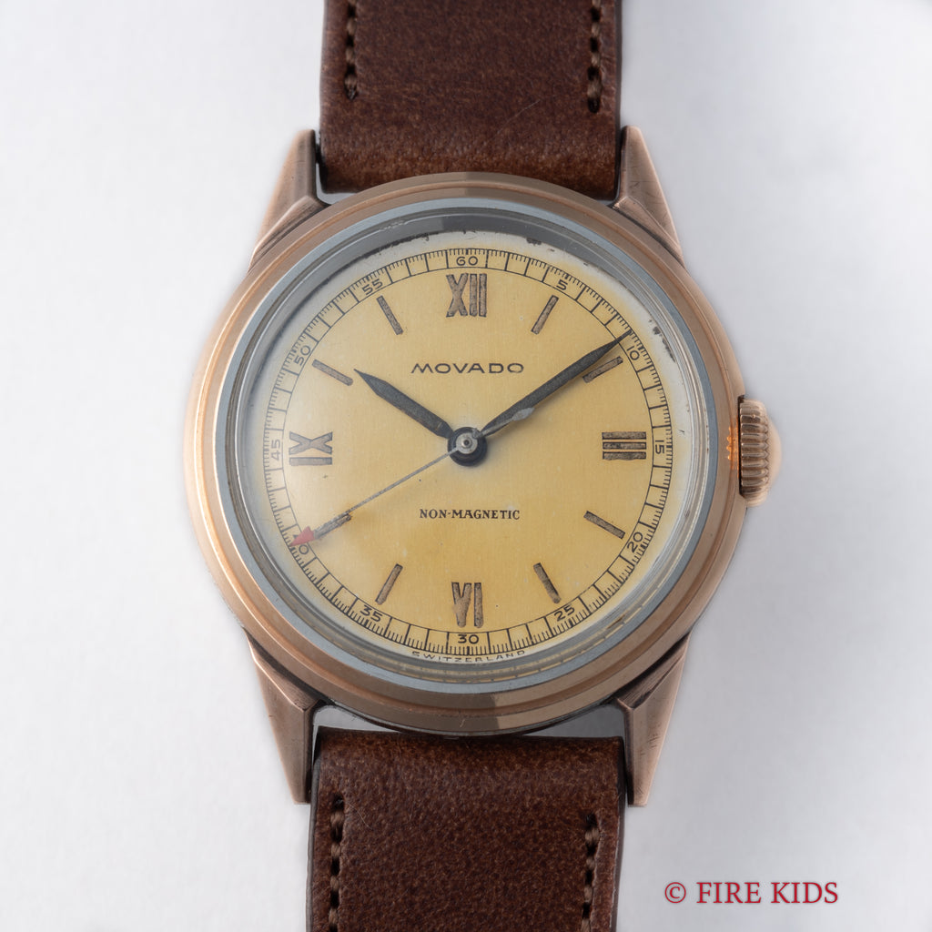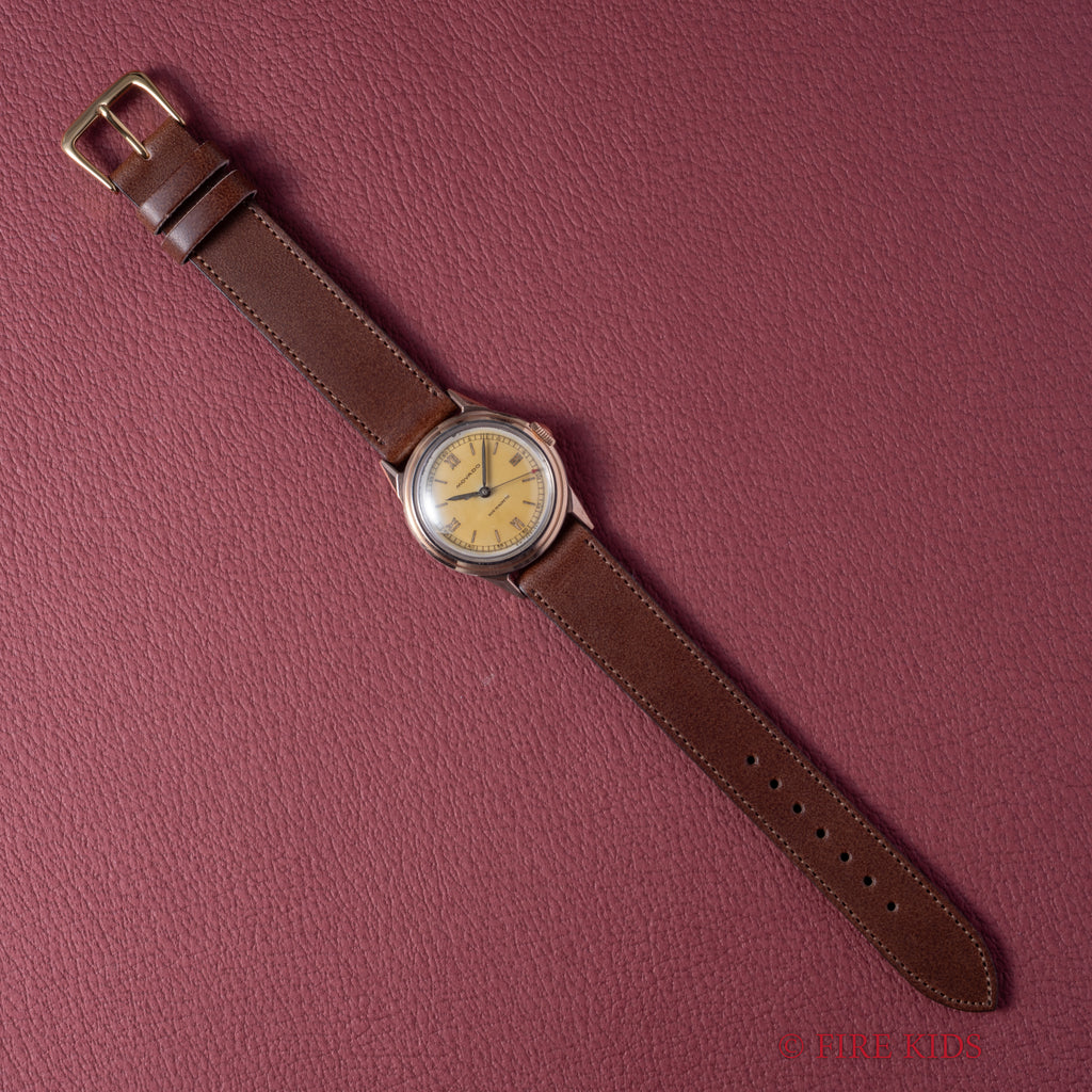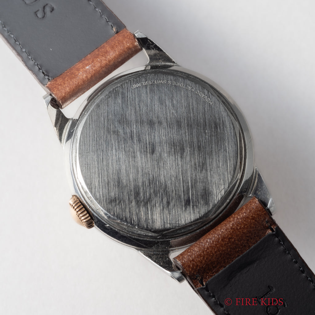 スイスの名門モバードのピンクトップゴールドケース1940年代製です。中央から円形に綺麗に広がるパティーナ具合で、ケース付近はホワイトが残っているためツートーンカラーのように見えます。文字盤の飛びローマンのデザインやカラーリングもさることながら、ケースはフランソワボーゲル社製の防水仕様です。通常FBと略されるフランソワボーゲル社は、スイスのケースメーカーで、その思想がロレックスのオイスターケースにも影響を与えたとされ、パテックフィリップなど高級ブランドにも一部採用されています。外装の造りもあってかムーブメントは綺麗な状態で保たれています。手巻きや針回しの操作はスムースです。ベルトはファイアーキッズオリジナルベルトが装着されています。こちらは分解掃除済みです。