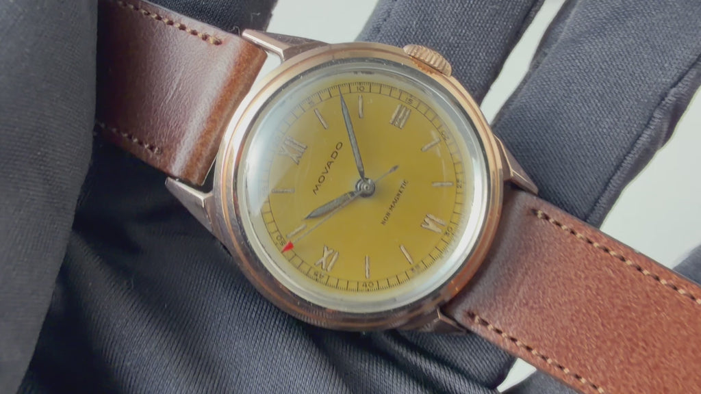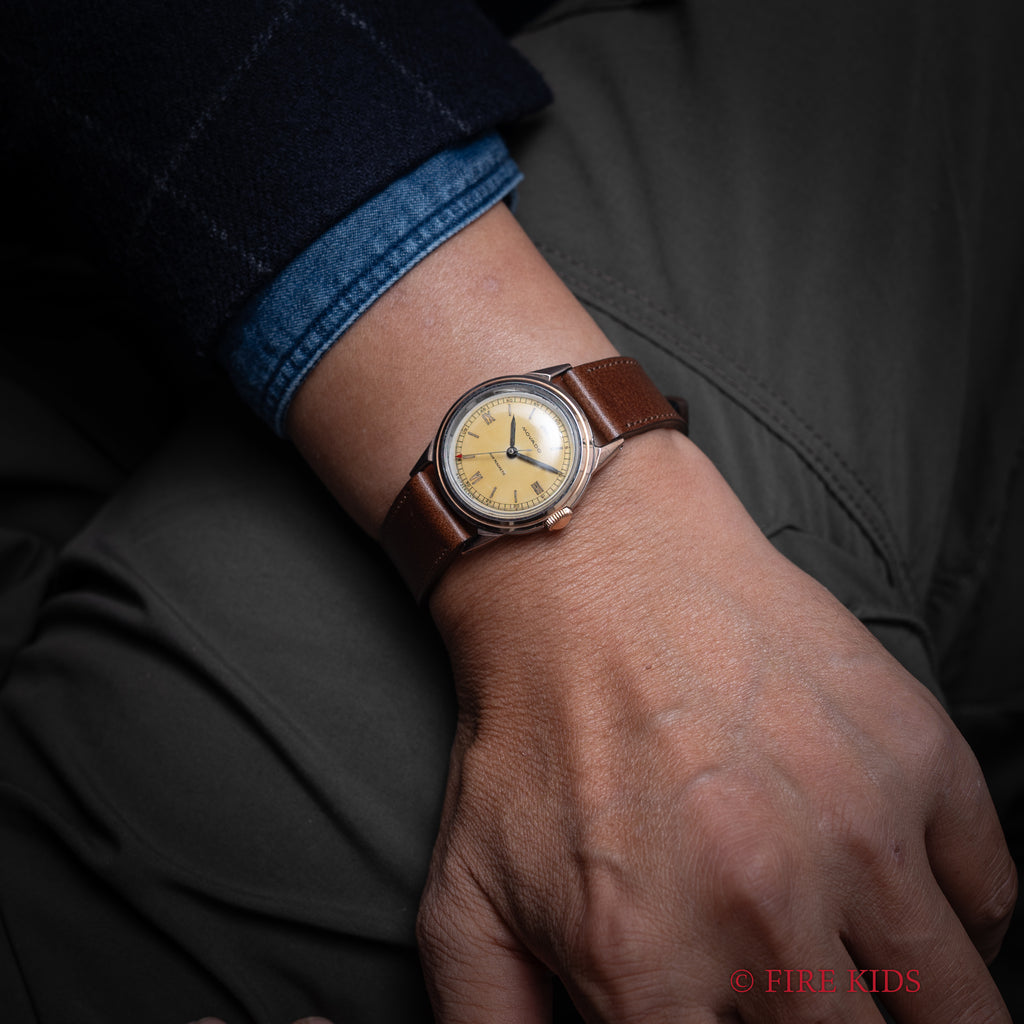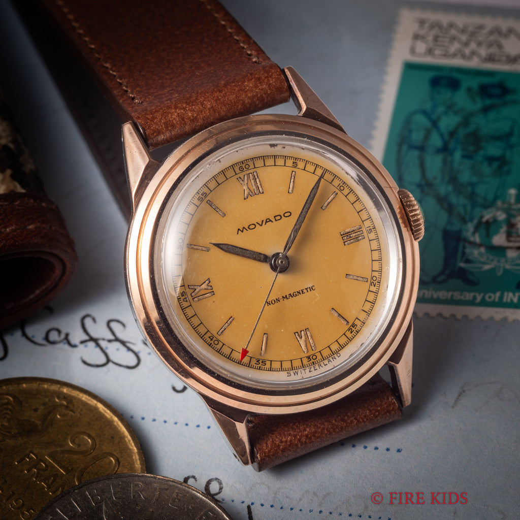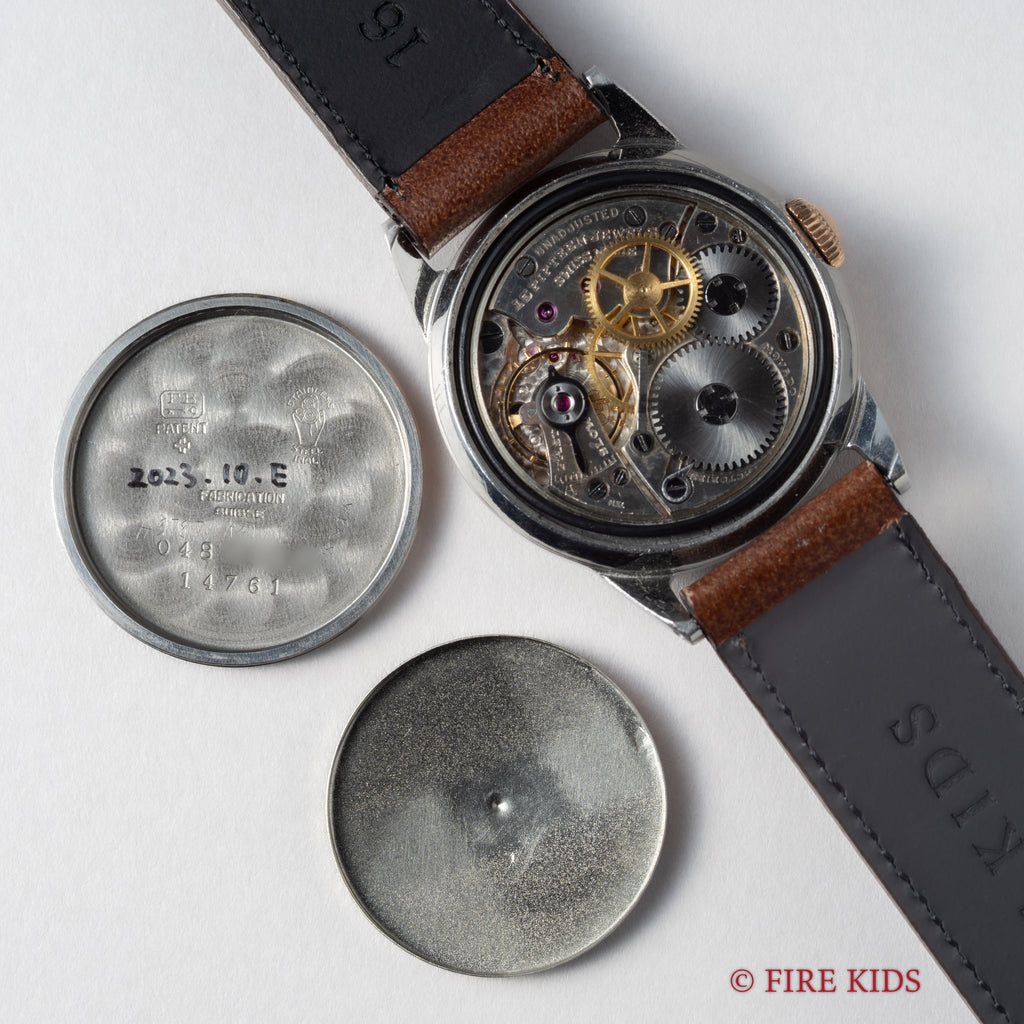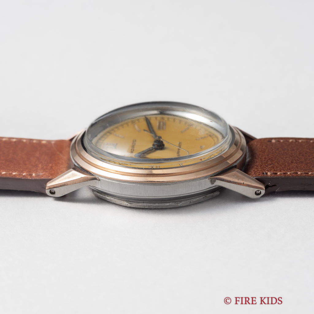 スイスの名門モバードのピンクトップゴールドケース1940年代製です。中央から円形に綺麗に広がるパティーナ具合で、ケース付近はホワイトが残っているためツートーンカラーのように見えます。文字盤の飛びローマンのデザインやカラーリングもさることながら、ケースはフランソワボーゲル社製の防水仕様です。通常FBと略されるフランソワボーゲル社は、スイスのケースメーカーで、その思想がロレックスのオイスターケースにも影響を与えたとされ、パテックフィリップなど高級ブランドにも一部採用されています。外装の造りもあってかムーブメントは綺麗な状態で保たれています。手巻きや針回しの操作はスムースです。ベルトはファイアーキッズオリジナルベルトが装着されています。こちらは分解掃除済みです。