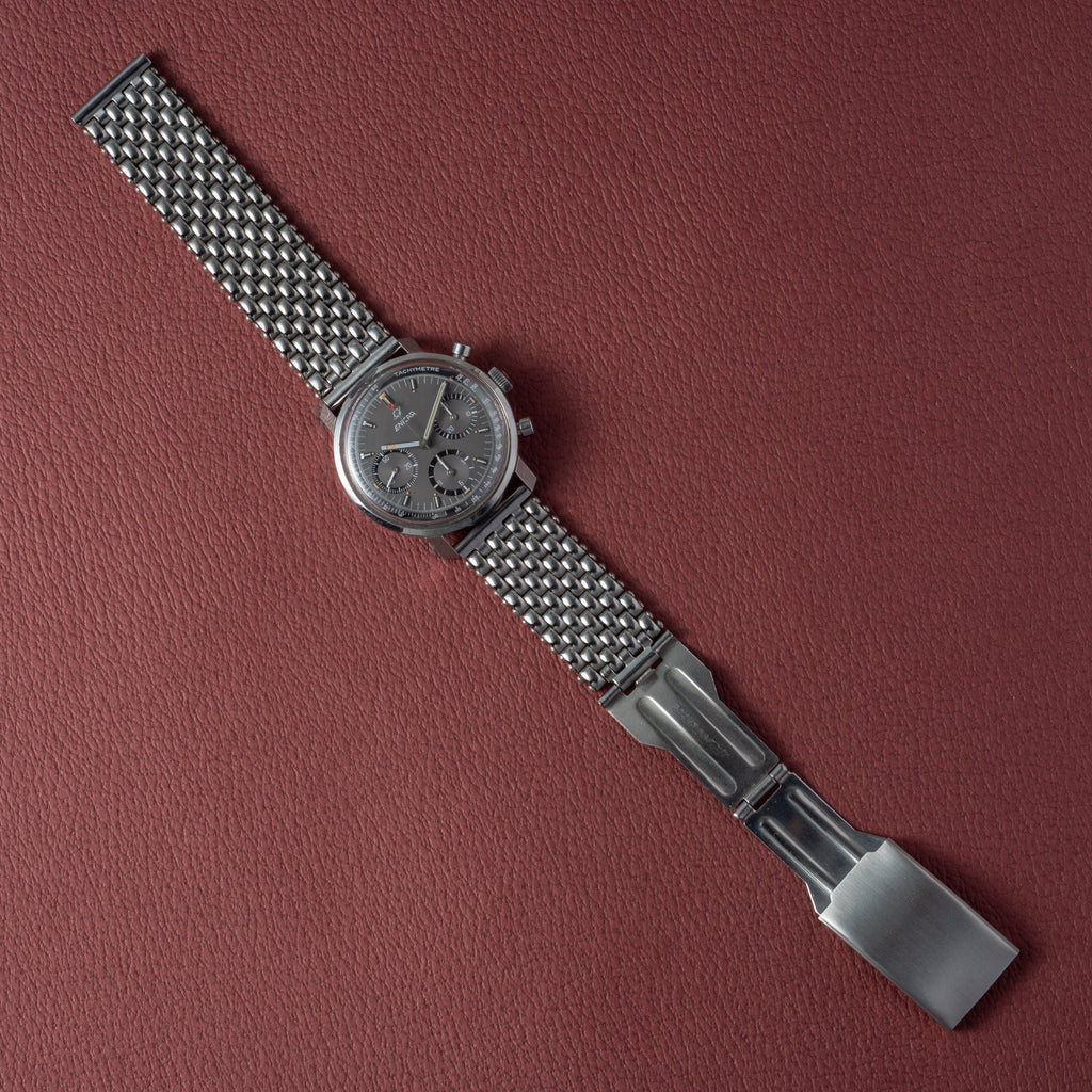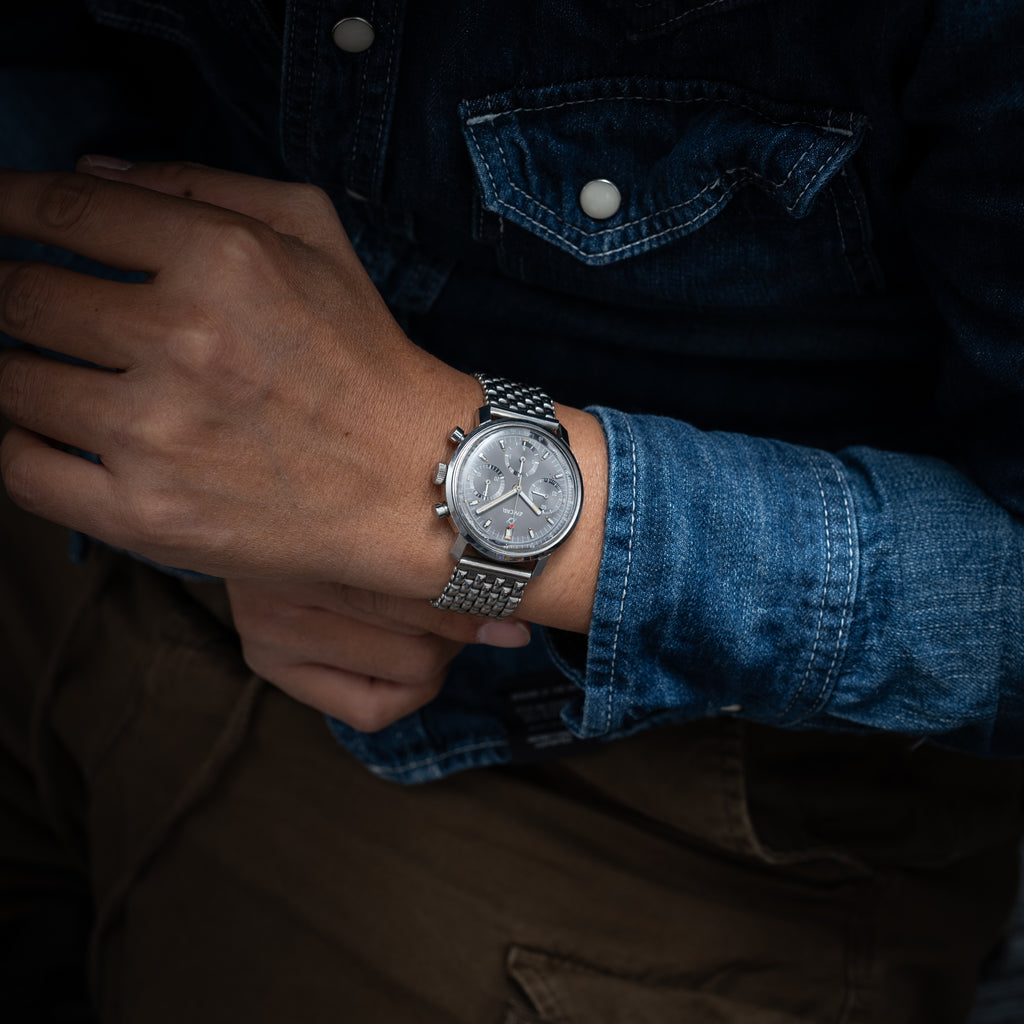 エニカ バルジュー72搭載クロノグラフ ガルニクス 1960年代製 手巻 社外ライスブレスの入荷になります。手巻きデイトナのベースキャリバーで有名なバルジュー72を搭載した3レジスタークロノグラフです。防水仕様(当時)のスクリューバックケースにグレーダイヤル、夜光入り針で視認性の良い実用的な時計になっています。文字盤はシミ等無く綺麗です。ケースは小傷が見られますが大きなダメージはありません。手巻きや針回しの操作はスムースです。ベルトは社外のライスブレスが取り付けられています。