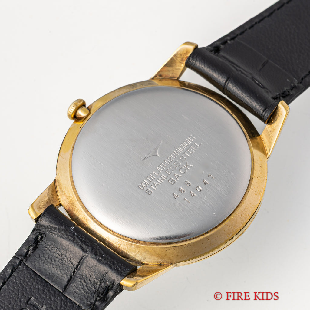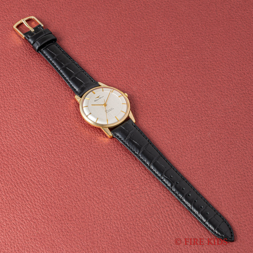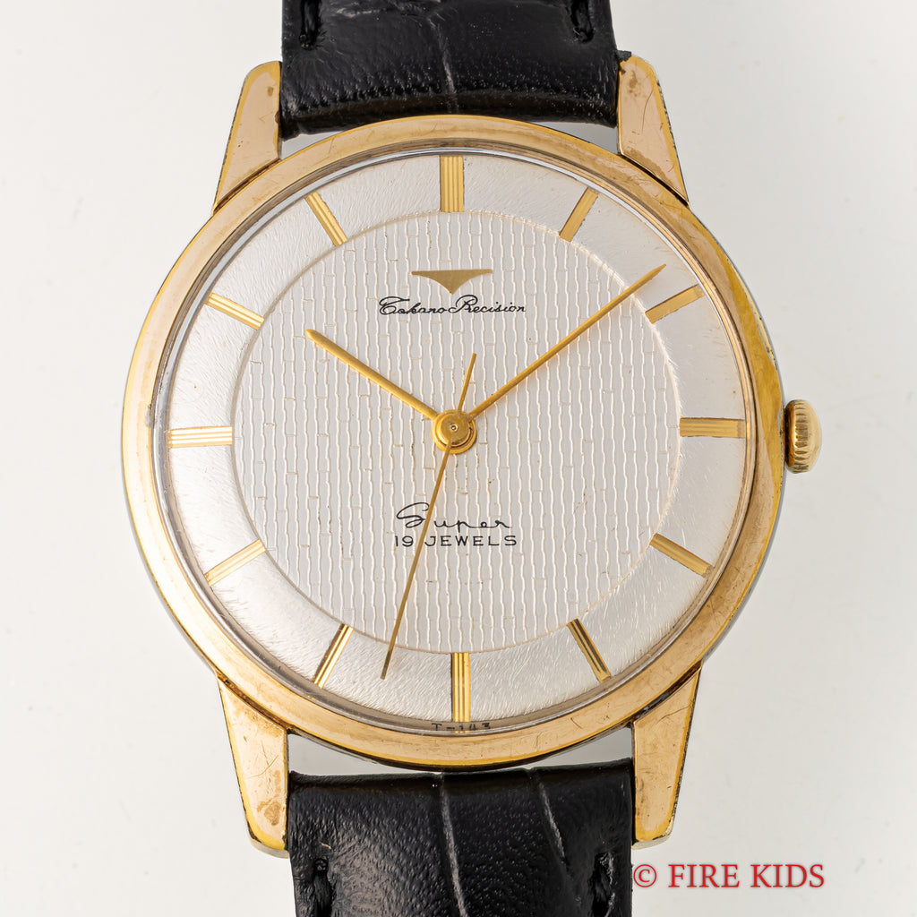 タカノ プレシジョン スーパー 1950年代製 手巻き GP/ステンバックです。伊勢湾台風により僅か4年11か月で幕を閉じたタカノの手巻きモデルです。近年復刻したことでも話題になりました。文字盤のインデックス内側の模様は「竹」のようになっており、インデックス側は「木材」のようなランダムな斜めのヘアラインが入っていて飽きがこないデザインです。小傷はありますが大きなダメージはありません。ベルトは社外の革ベルトを合わせています。こちらは分解掃除済みです。