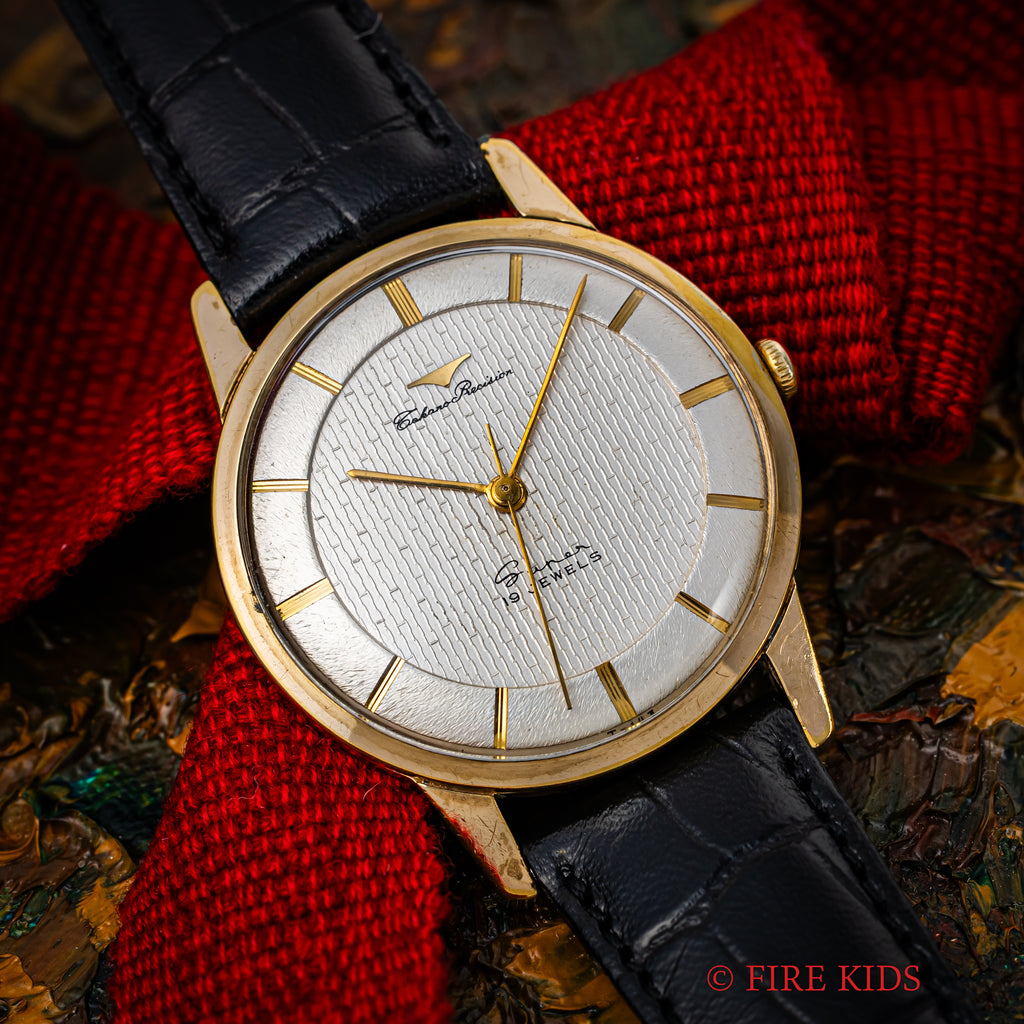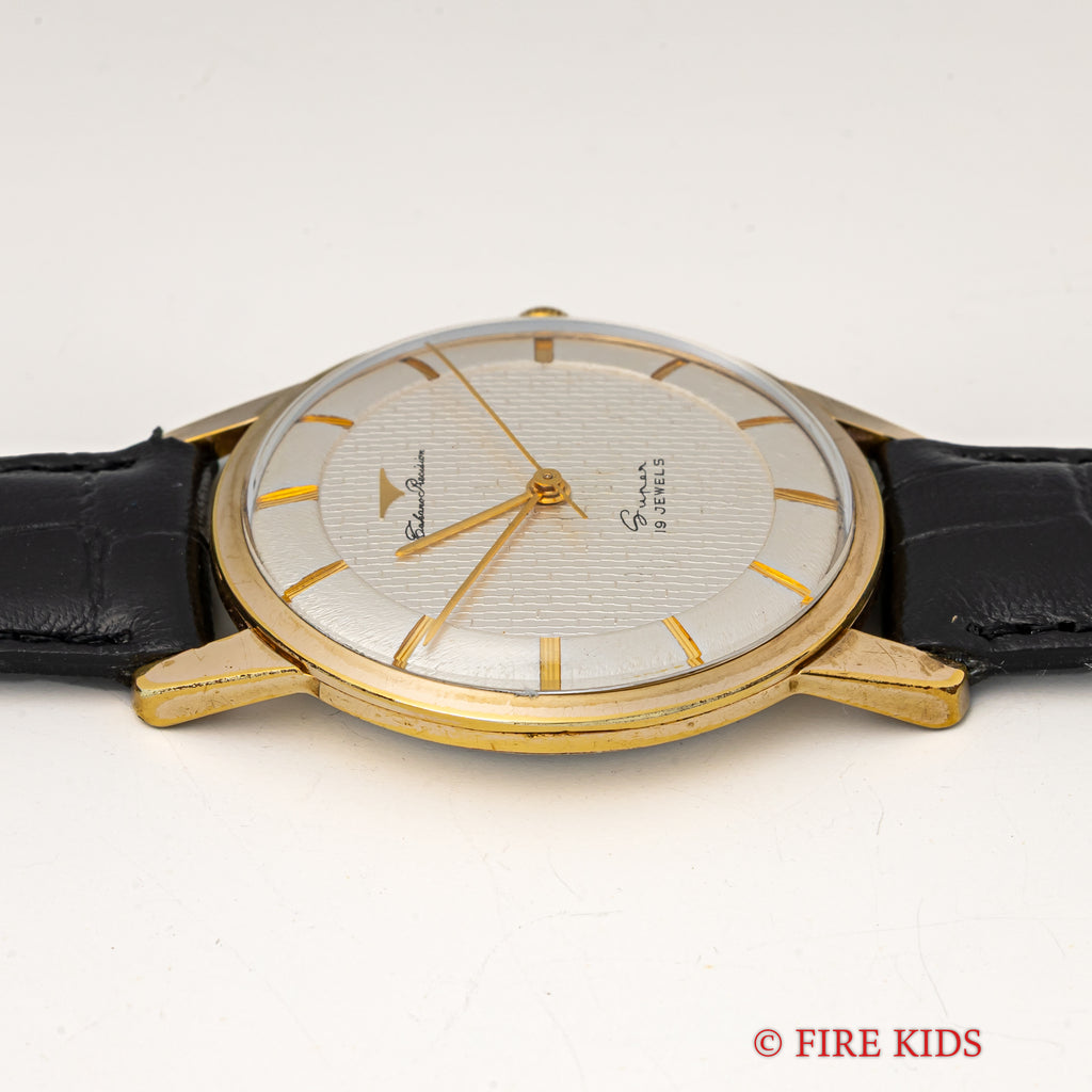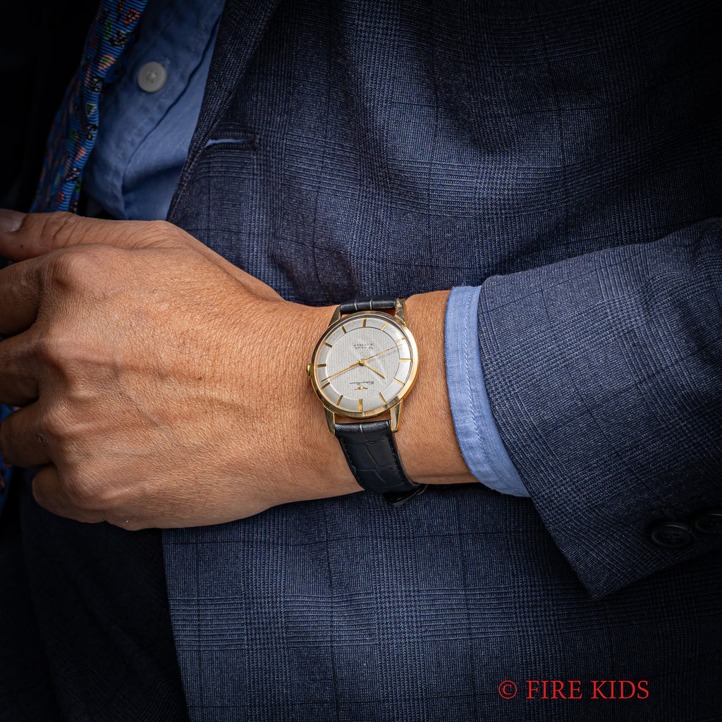 タカノ プレシジョン スーパー 1950年代製 手巻き GP/ステンバックです。伊勢湾台風により僅か4年11か月で幕を閉じたタカノの手巻きモデルです。近年復刻したことでも話題になりました。文字盤のインデックス内側の模様は「竹」のようになっており、インデックス側は「木材」のようなランダムな斜めのヘアラインが入っていて飽きがこないデザインです。小傷はありますが大きなダメージはありません。ベルトは社外の革ベルトを合わせています。こちらは分解掃除済みです。