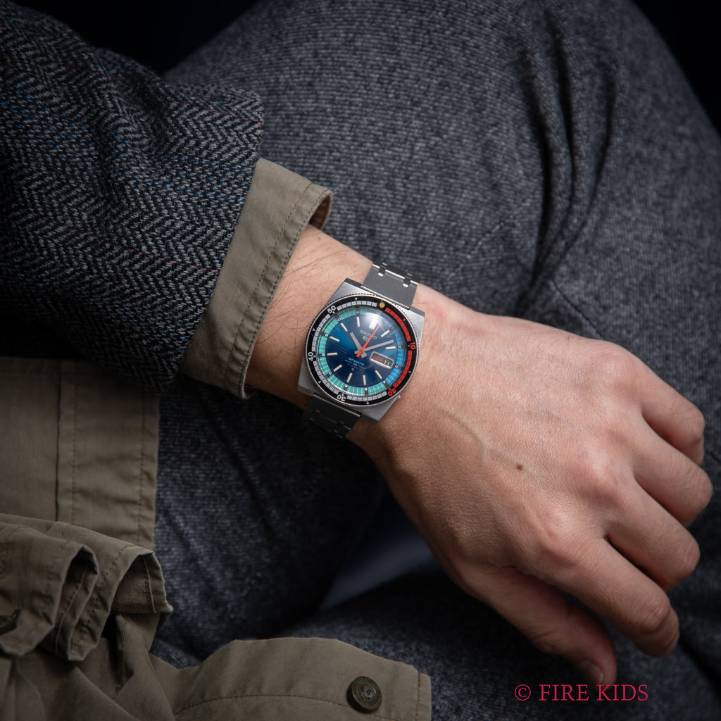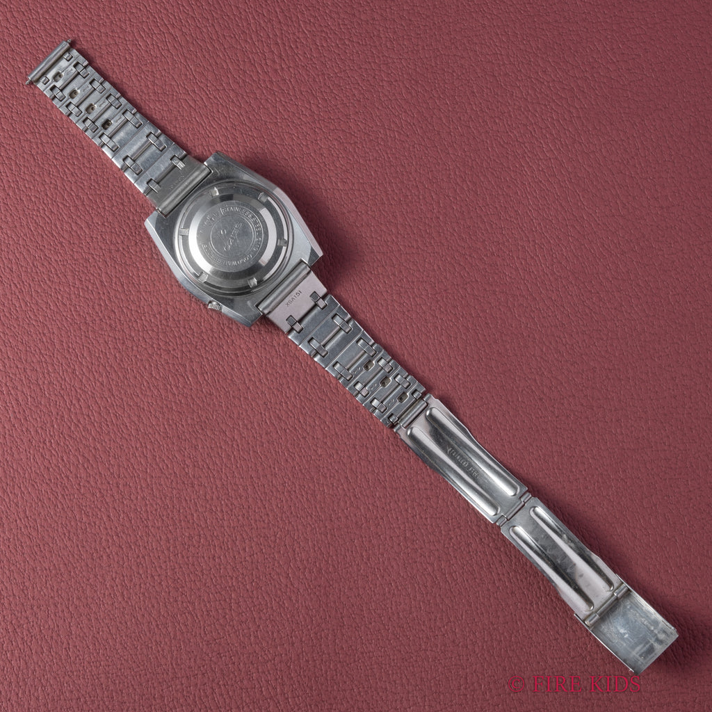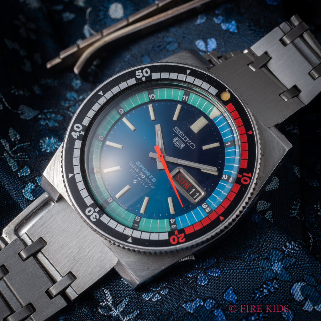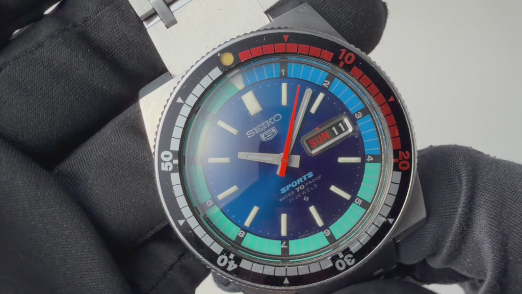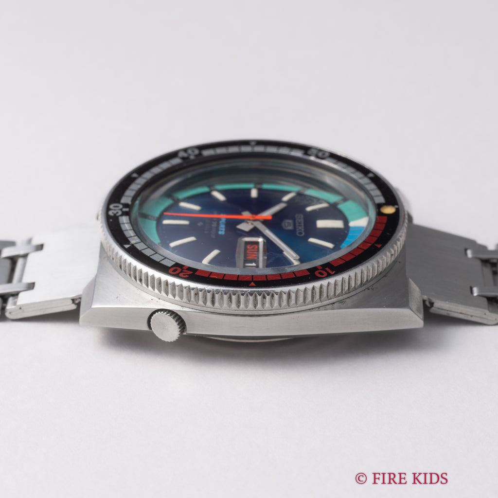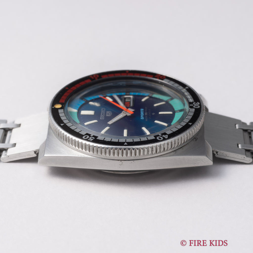 セイコー 5スポーツ Ref.6119-6050 自動巻き 純正ブレス インナー回転ベゼルです。外ベゼルと内側にもベゼルがあるダブルベゼル仕様です。独特なディティールと様々なカラーリングで70年代らしさ、レトロ感を感じさせる一本です。ベルトはラグジュアリースポーツの時計を想起させるようなスタイルで、ラグの太さのコントラストが際立っています。大きなダメージ無く小傷程度です。四時位置リューズで手巻き機能はありませんがインナーベゼル操作と日付早送り、針回しが可能です。純正ブレス付きです。