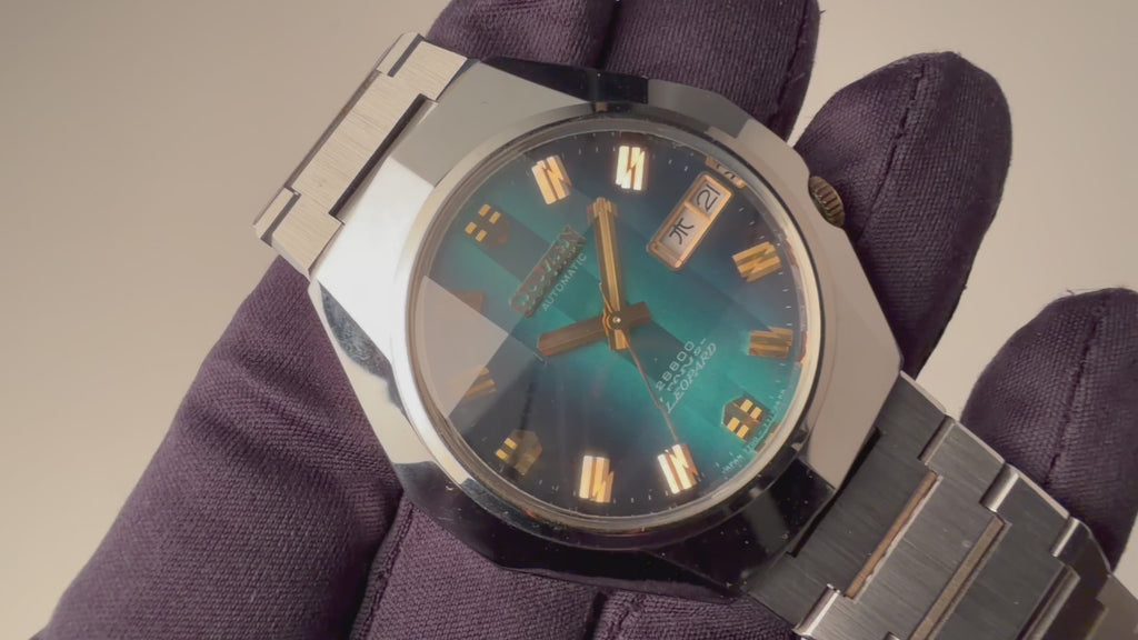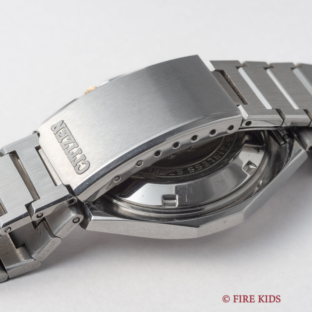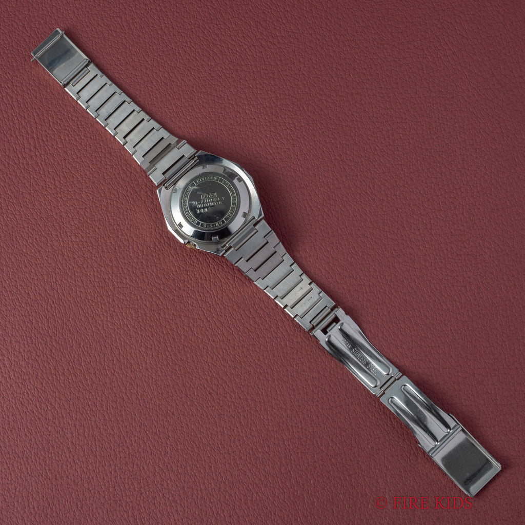シチズン レオパール カスタム Ref.4-771044Y 1973年製 タグ付き純正ブレス 美品です。「ハイビートムーブメント」と「ユニークなカレンダー早送り機能」を特徴とする高性能モデルです。シチズン独自の非常にユニークなカレンダー修正機能(早送り機能)を備えています。りゅうずを1段引いた状態で、時計の12時位置を上に向けると曜日、6時位置を上に向けると日付が修正できるという、時計の向き(重力)を利用した独自のメカニズムです。タグ付きです。使用感の少ない美品となります。