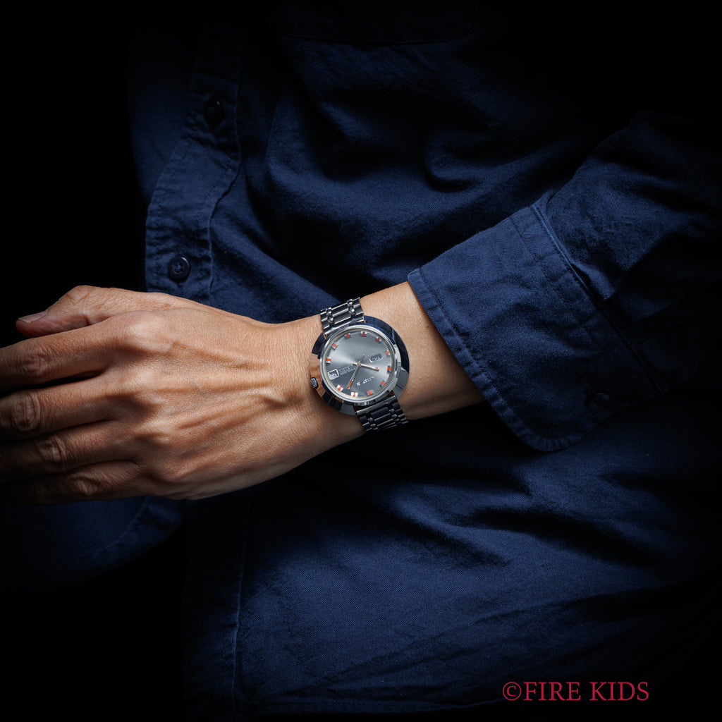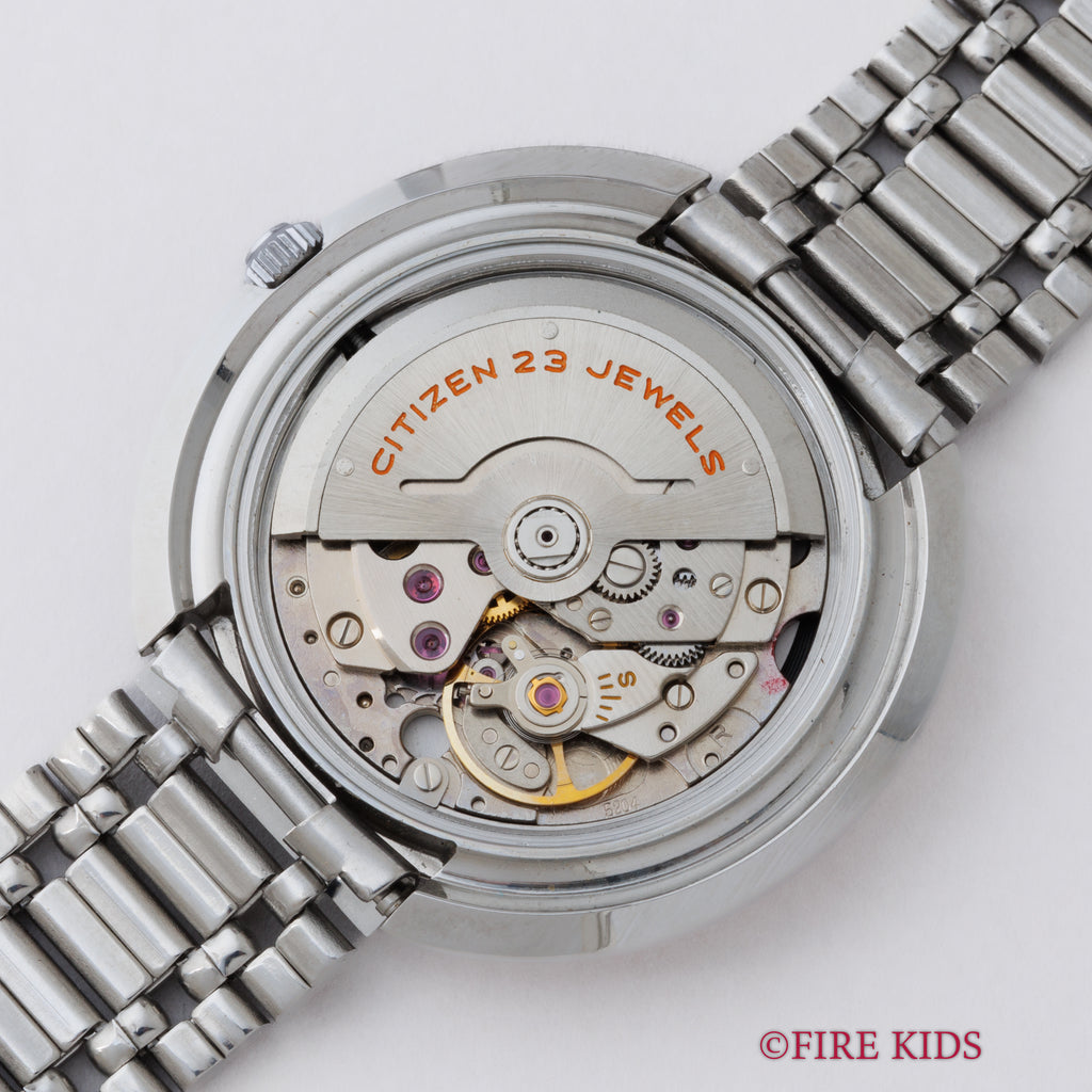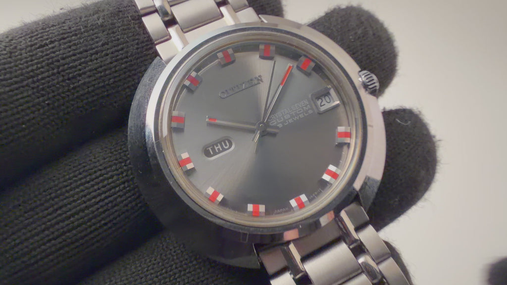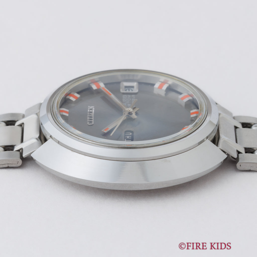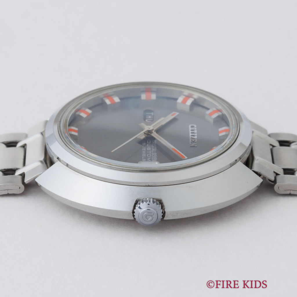 シチズン クリスタルセブン カスタム ナイアガラ 1969年製 未使用品 自動巻 純正ブレス タグ付きの入荷になります。セイコー5に対抗して作られたシチズン7シリーズはセイコーにはないガラスを採用と手巻き機能が追加されています。シルバーグレーの文字盤にオレンジのインデックス、針が印象的ですが、こちらは通称「ナイアガラ」と呼ばれ文字盤やインデックスにカラーデザインをシチズンでは初めて導入したモデル。2010年頃に復刻もされ人気となっています。ムーブメントは自動巻き23石の機械を搭載、カレンダーはデイデイト表記で日付のクイックチェンジ付きです。使用感が無く保管キズ程度で大きなダメージはございません。手巻きや針回しの操作はスムースです。ベルトは純正のステンレスブレスが取り付けてあります。当時のタグ、説明書が付属します。