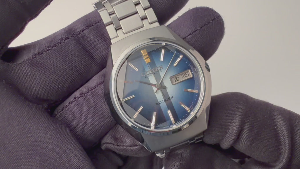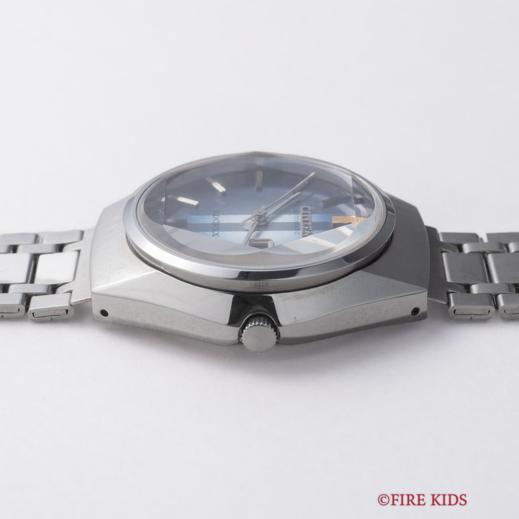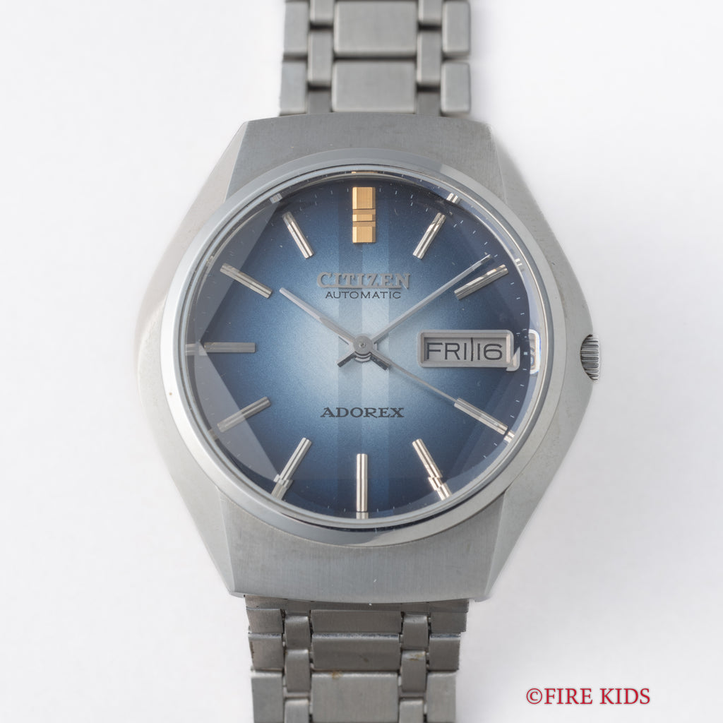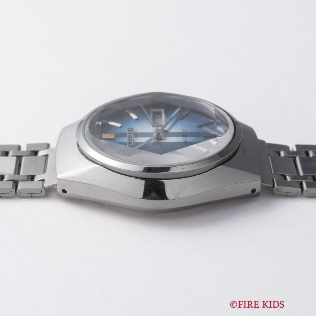 シチズン アドレックス Ref.4-385047K 1975年製 ブルーグラデーションです。70年代らしいカットガラス、グラデーションダイヤルにデイデイト表示、自動巻きと実用性とユニークさを兼ね備えたモデルです。大きなダメージはなく良好なコンディションです。タグ、取扱説明書付きです。ベルトは純正ブレスが付いています。