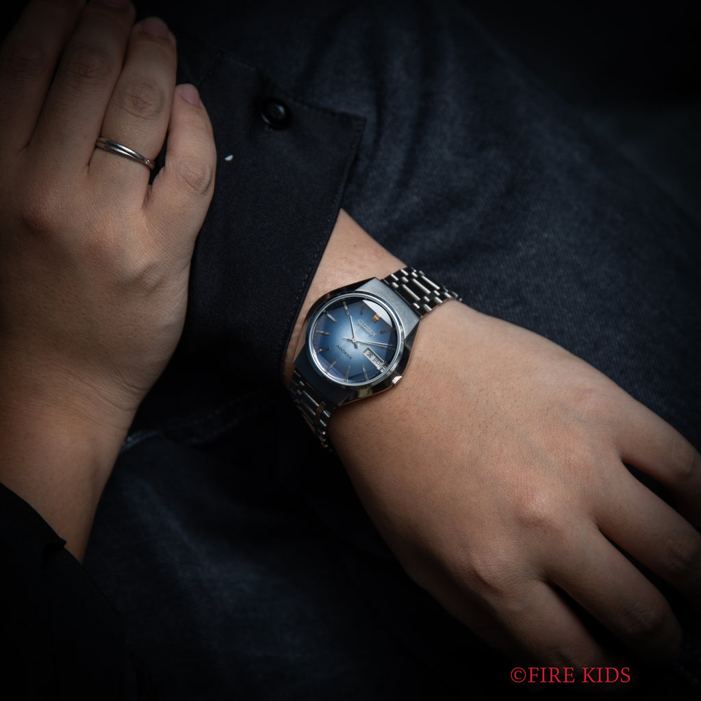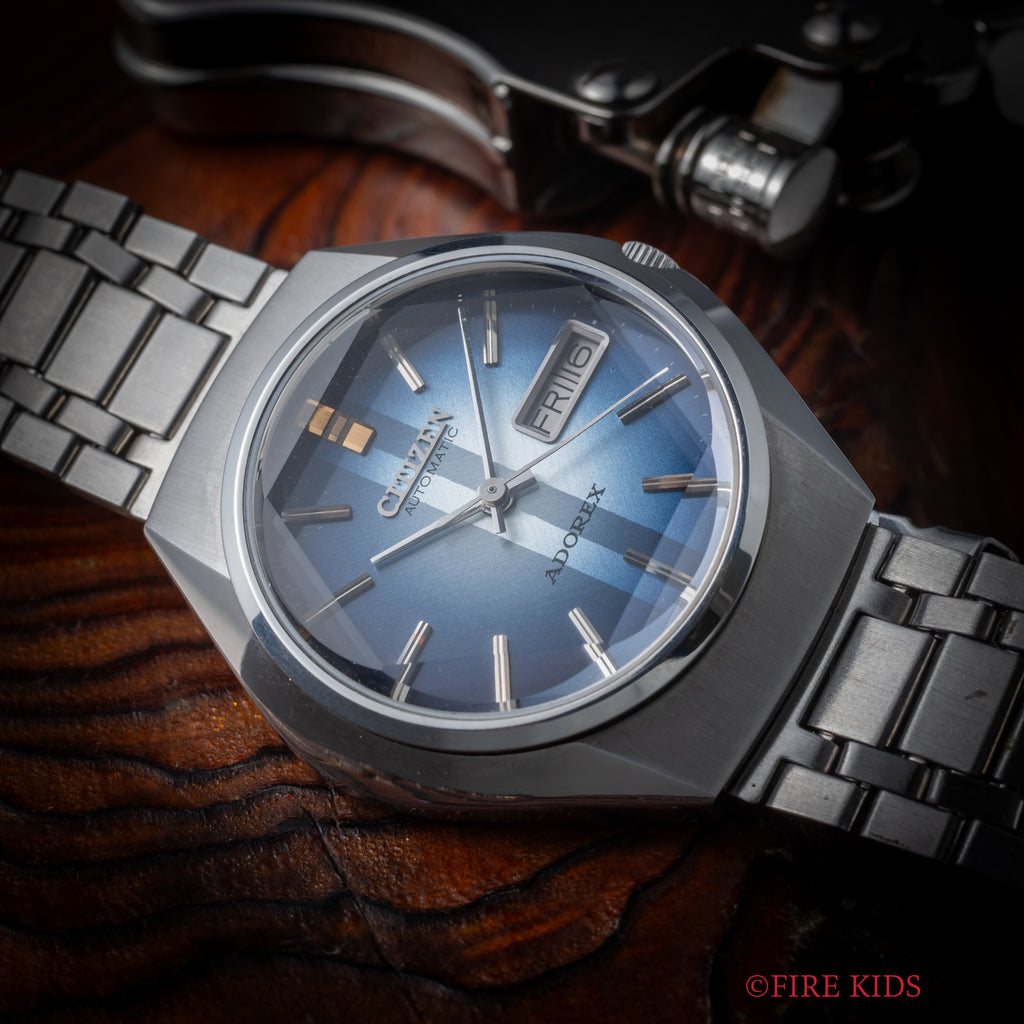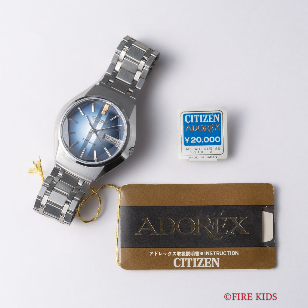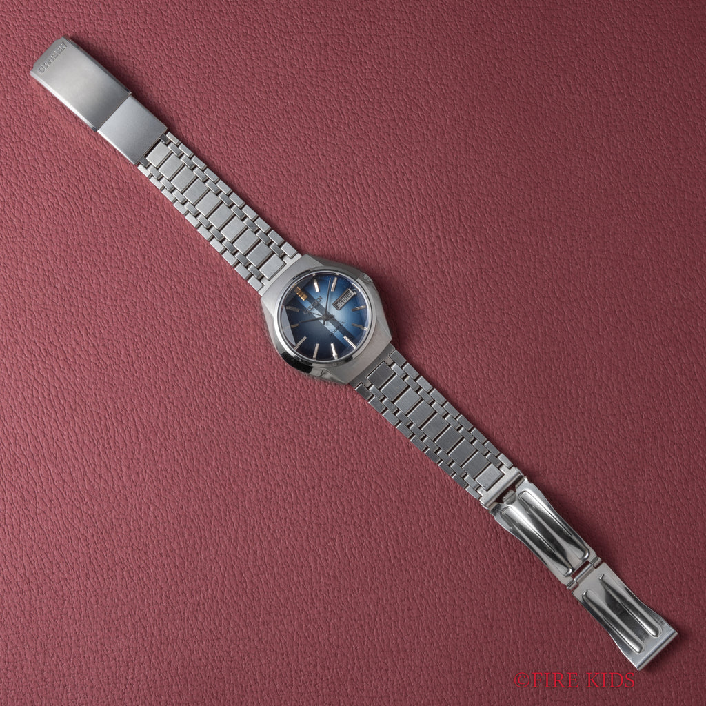 シチズン アドレックス Ref.4-385047K 1975年製 ブルーグラデーションです。70年代らしいカットガラス、グラデーションダイヤルにデイデイト表示、自動巻きと実用性とユニークさを兼ね備えたモデルです。大きなダメージはなく良好なコンディションです。タグ、取扱説明書付きです。ベルトは純正ブレスが付いています。