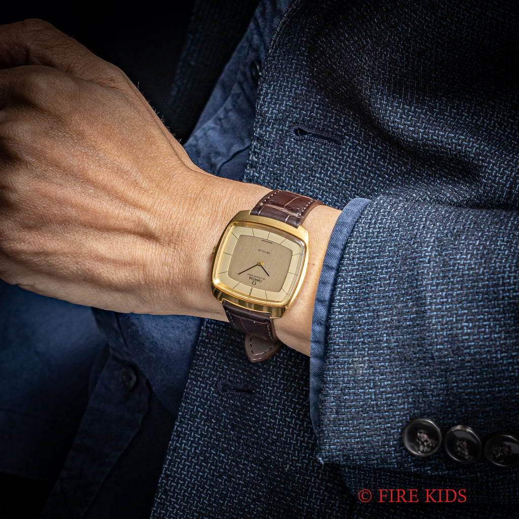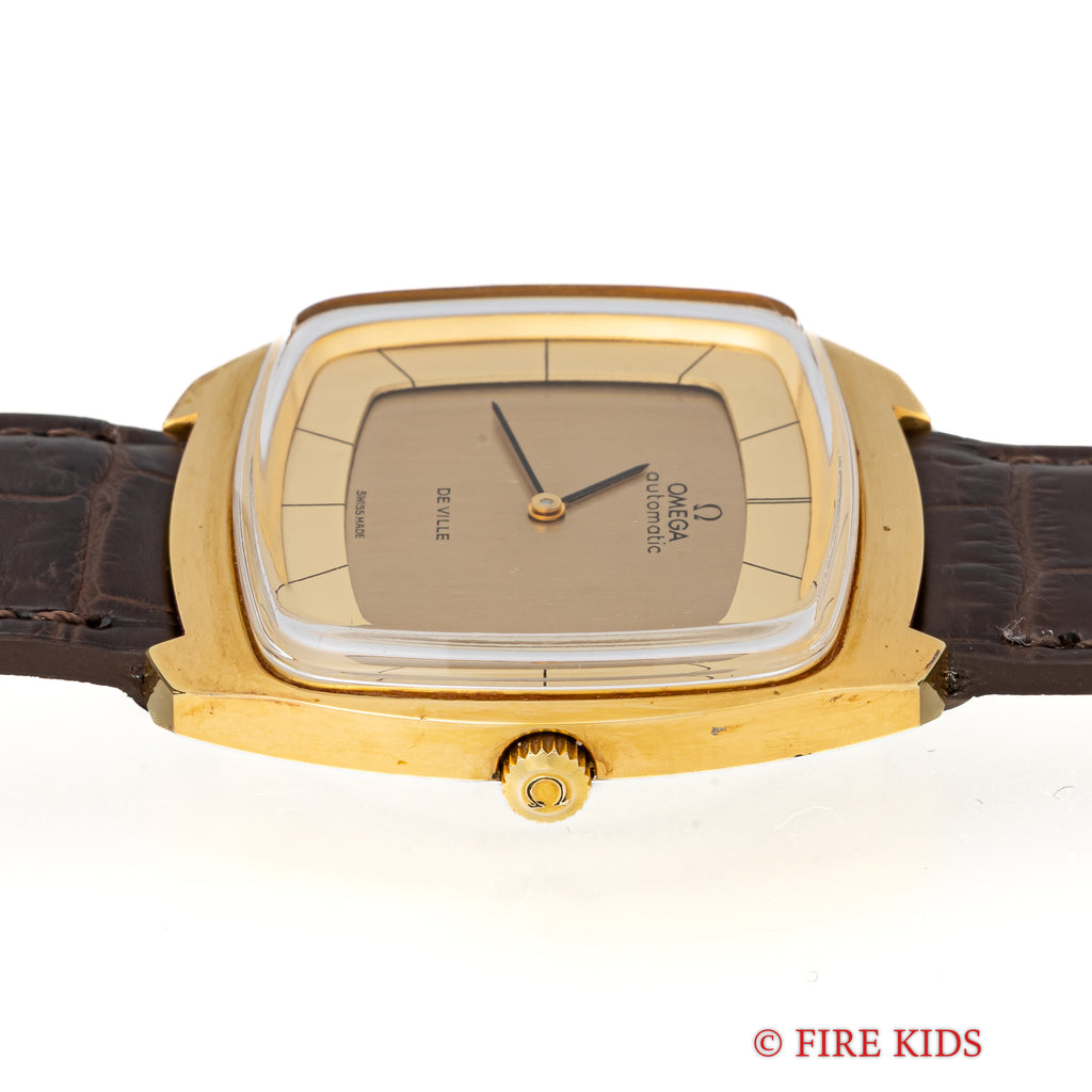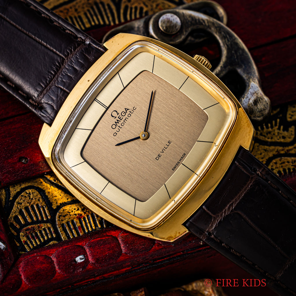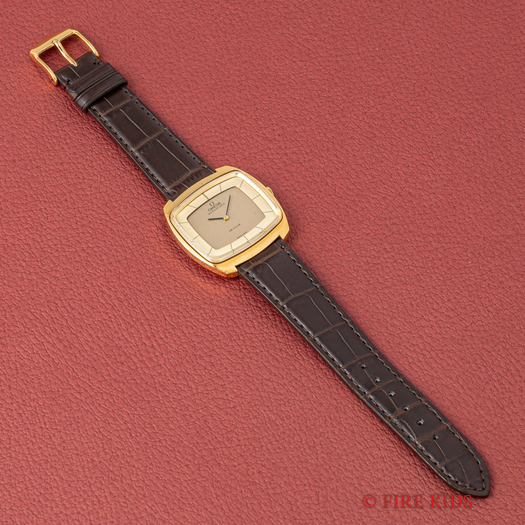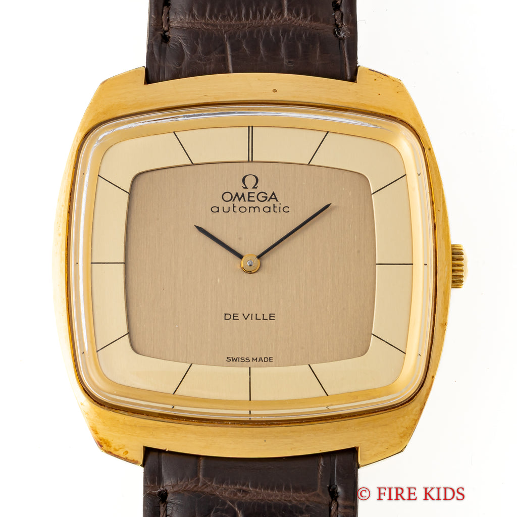 1972年製のオメガ デヴィル TVスクリーン 金張りモデルが入荷しました。70年代らしいTVスクリーン型のケースに二針の組み合わせで、アワーマーカーが一段上に配され奥行きを感じます。使用感はほとんど見られずとてもきれいな状態です。裏蓋の「DUSTPROOF」が時代を想起させます。ベルトはファイアーキッズオリジナルのクロコ革ベルトを合わせています。箱、タグ付き。